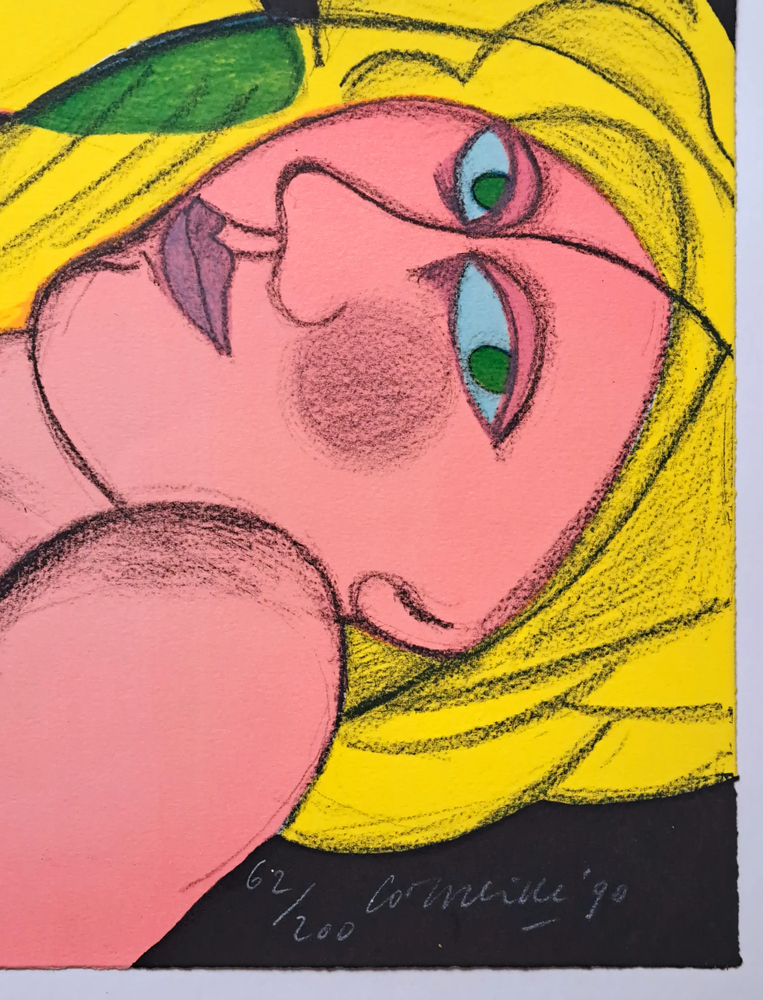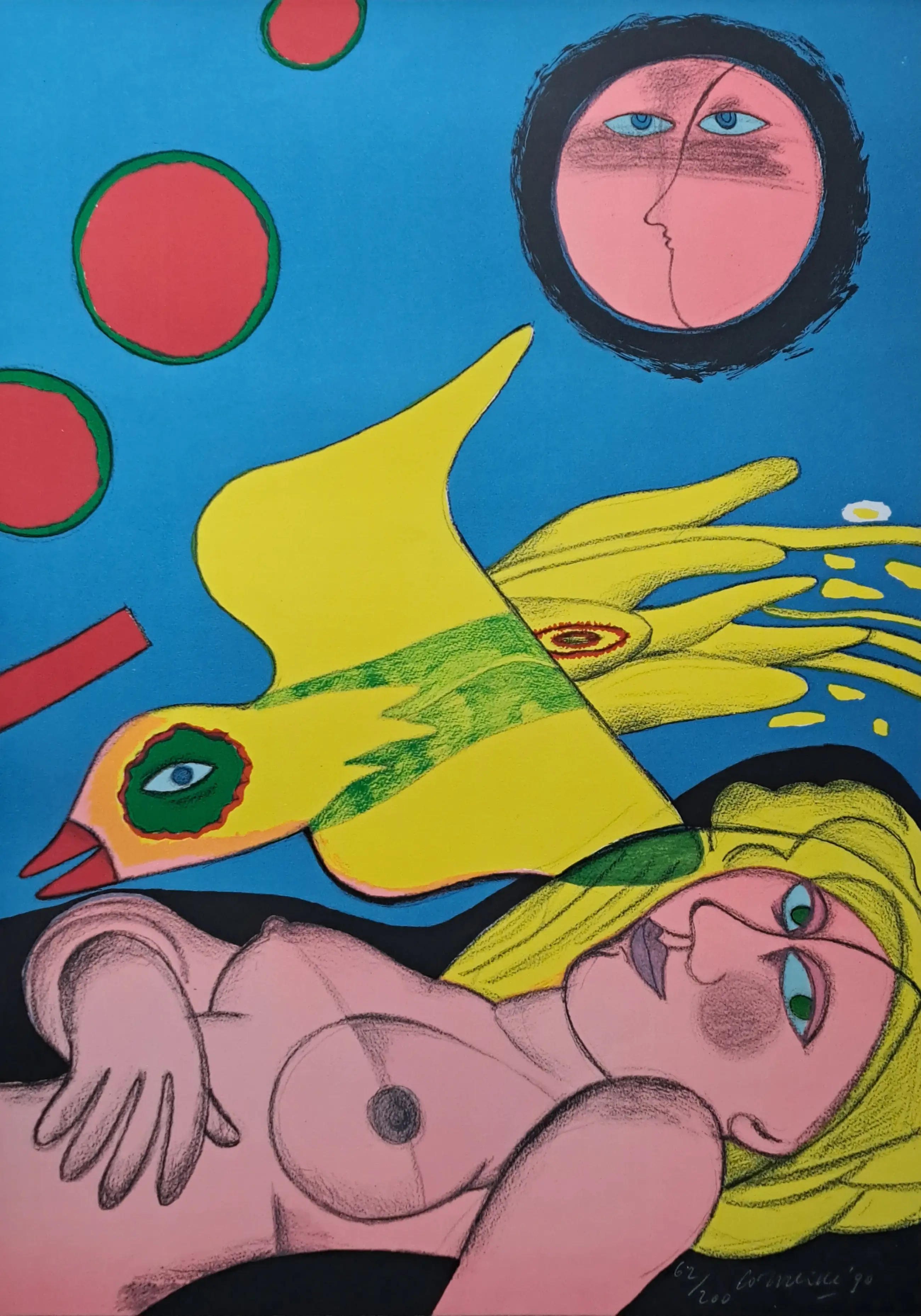 Zeer kleurrijke lithografie van de CoBrA kunstenaar Corneille. De thematiek is zoals van Corneille bekend is, maar het kleurgebruik is uitzonderlijk, wat de lithografie uniek in zijn soort maakt. Ingelijst in een nette zwarte aluminium lijst met afmetingen van 71 bij 91 cm. Gesigneerd, gedateerd en genummerd in wit krijt door de kunstenaar. Dit is nummer 62 uit een serie van 200 exemplaren.