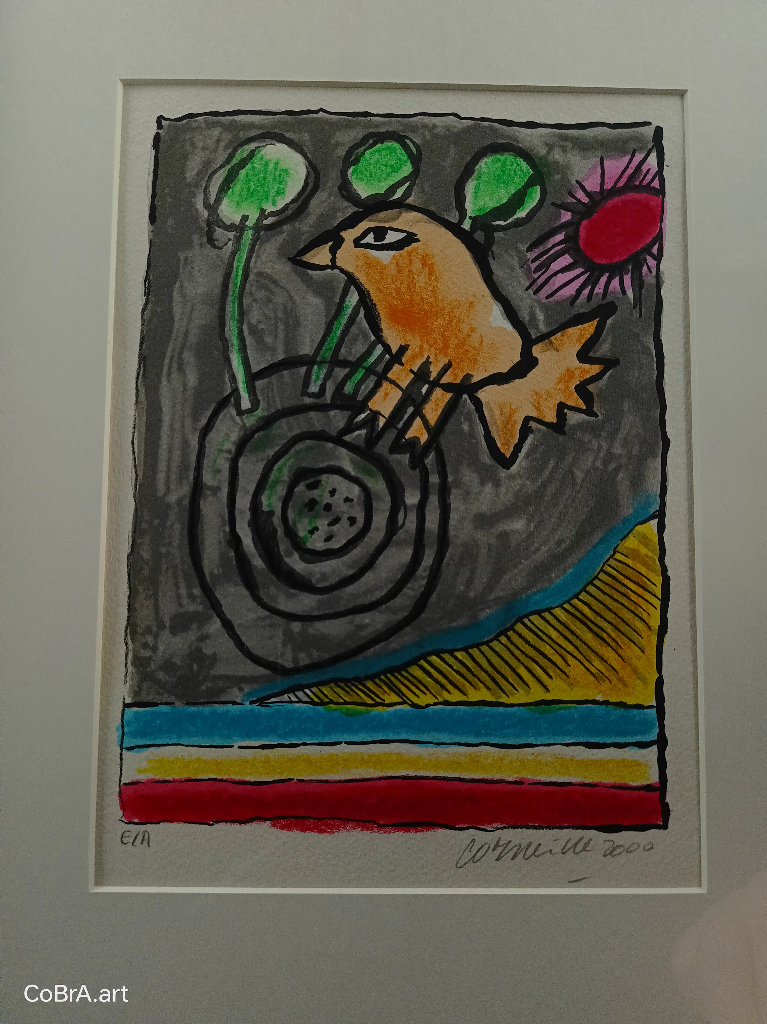 Een uniek kunstwerk van Corneille. Deze litho is een "E/A" épreuve d'artiste. Het geeft aan dat de litho een een kunstenaarsproef is. De E/A vermelding is linksonder op de litho door Corneille geschreven. Rechtsonder heeft Corneille in 2000 dit kunstwerk hand-gesigneerd.