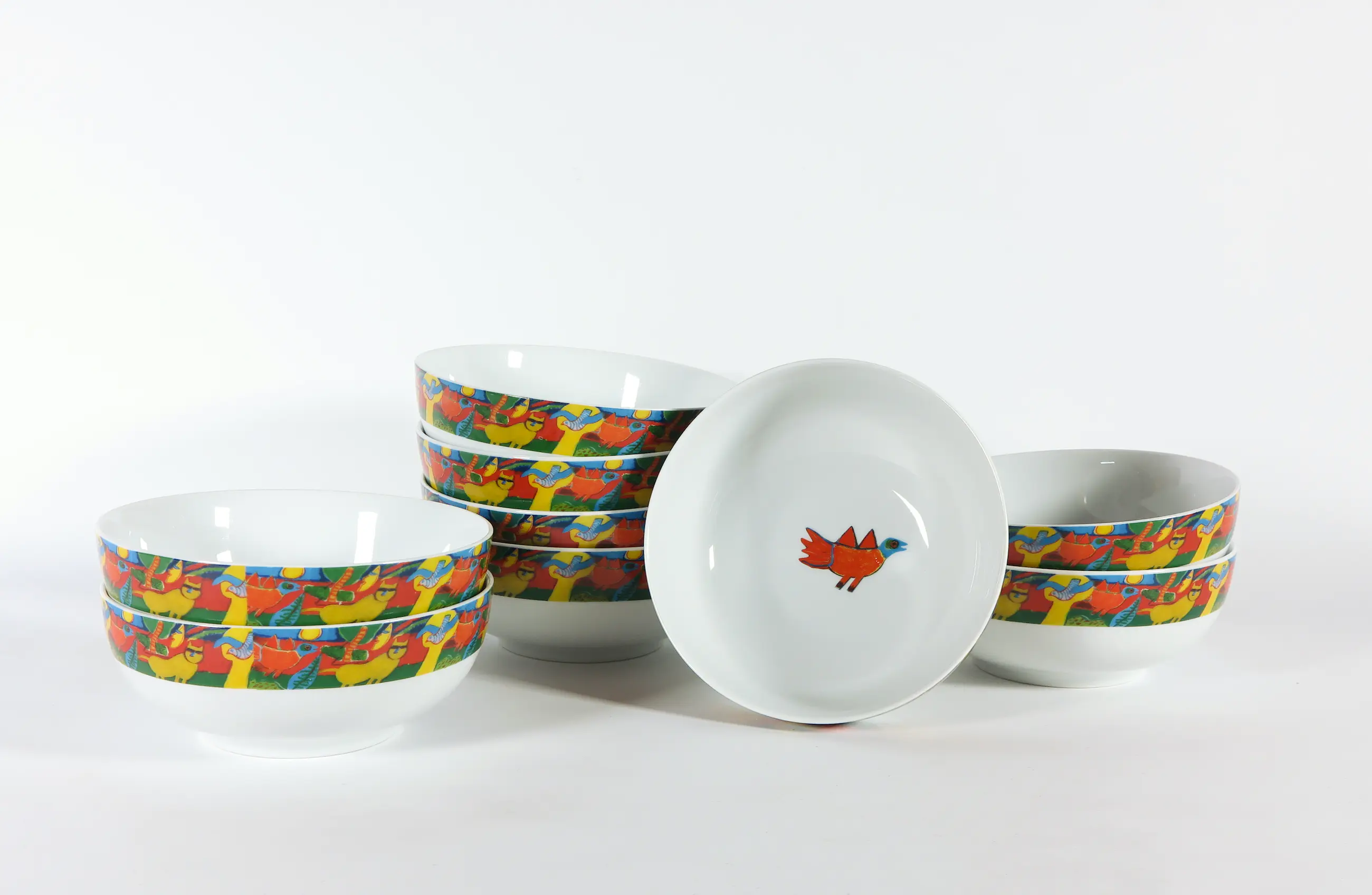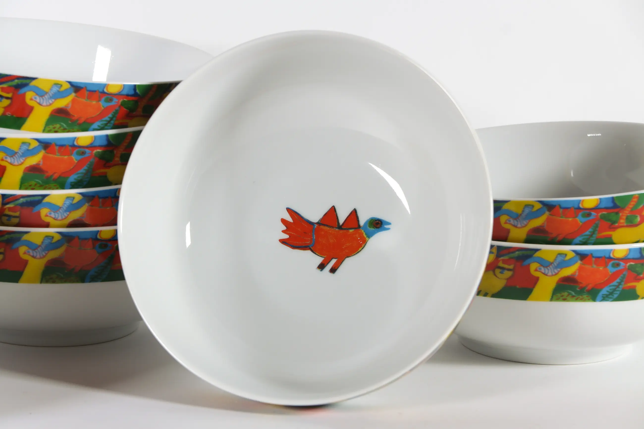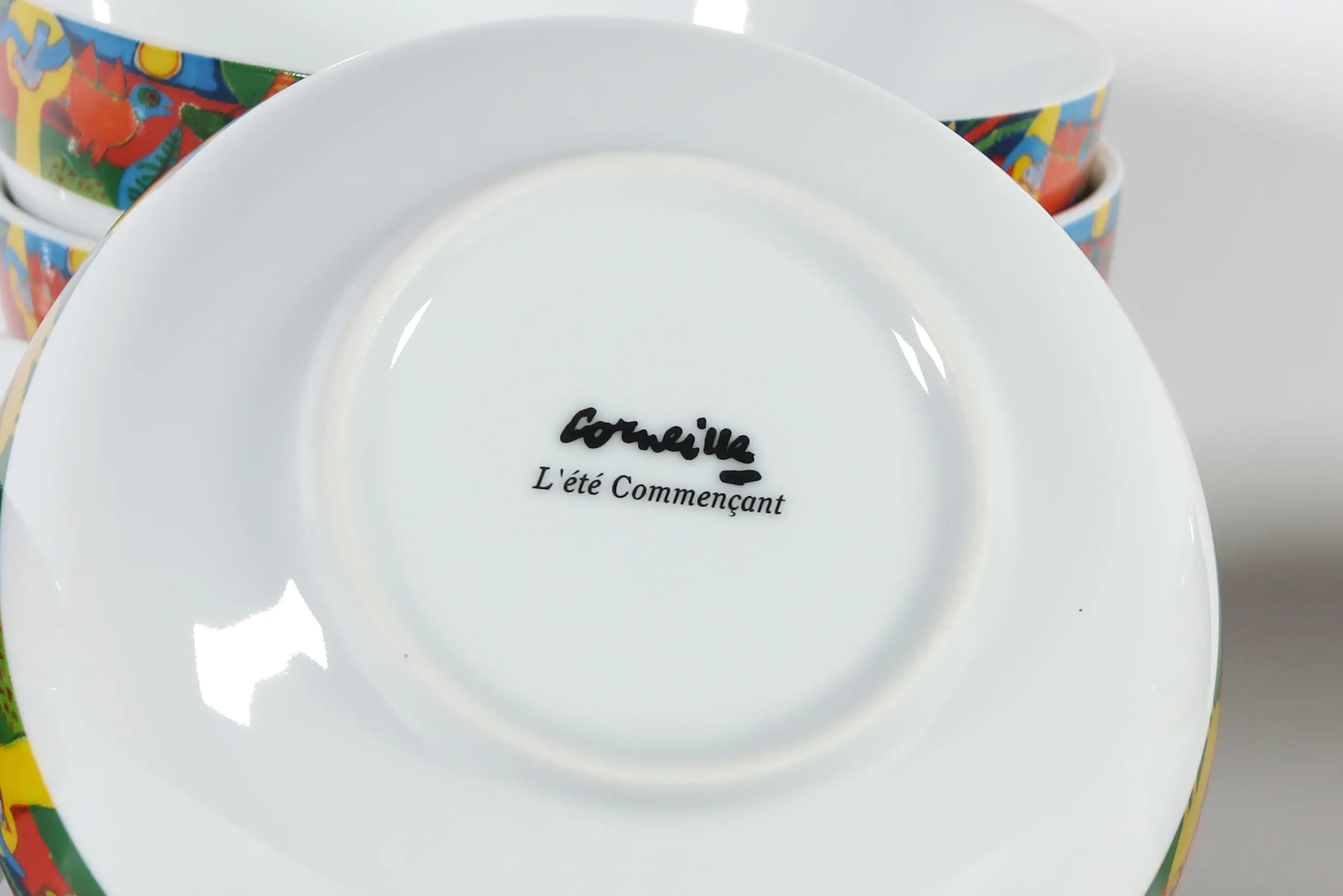 Negen porseleinen ontbijtkommen met afbeeldingen van Corneille, getiteld L'été Commencant. Let op: de gegeven meten zijn van een kom.