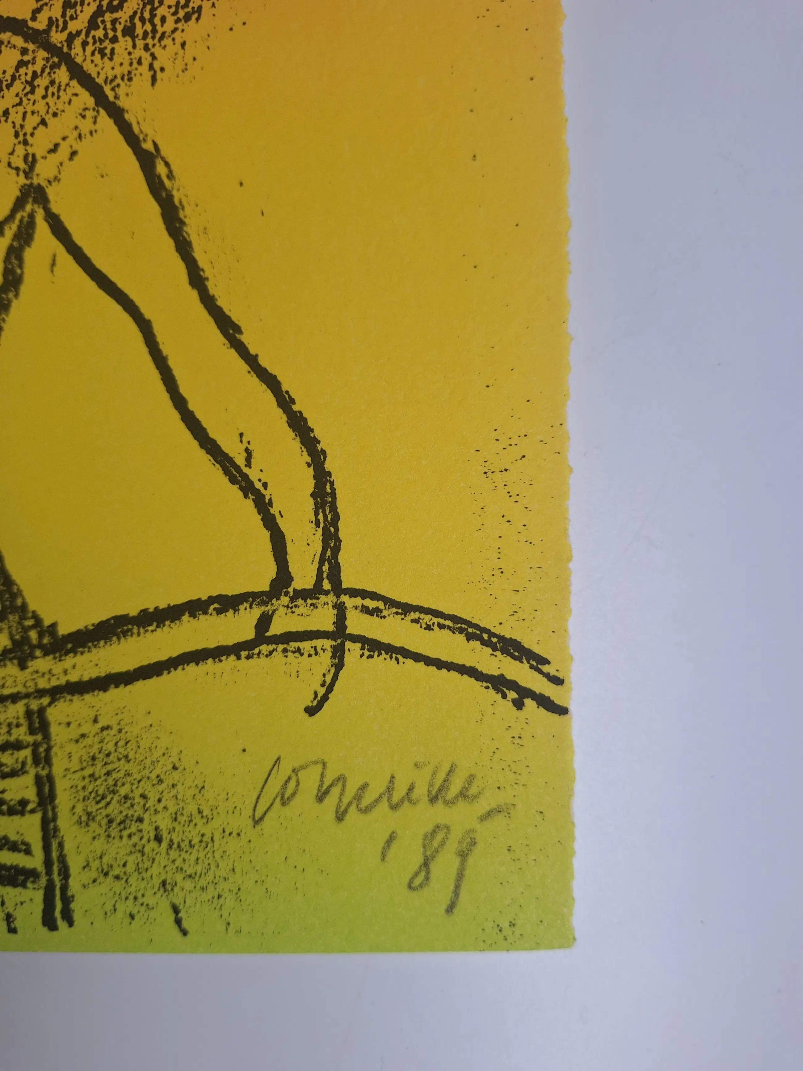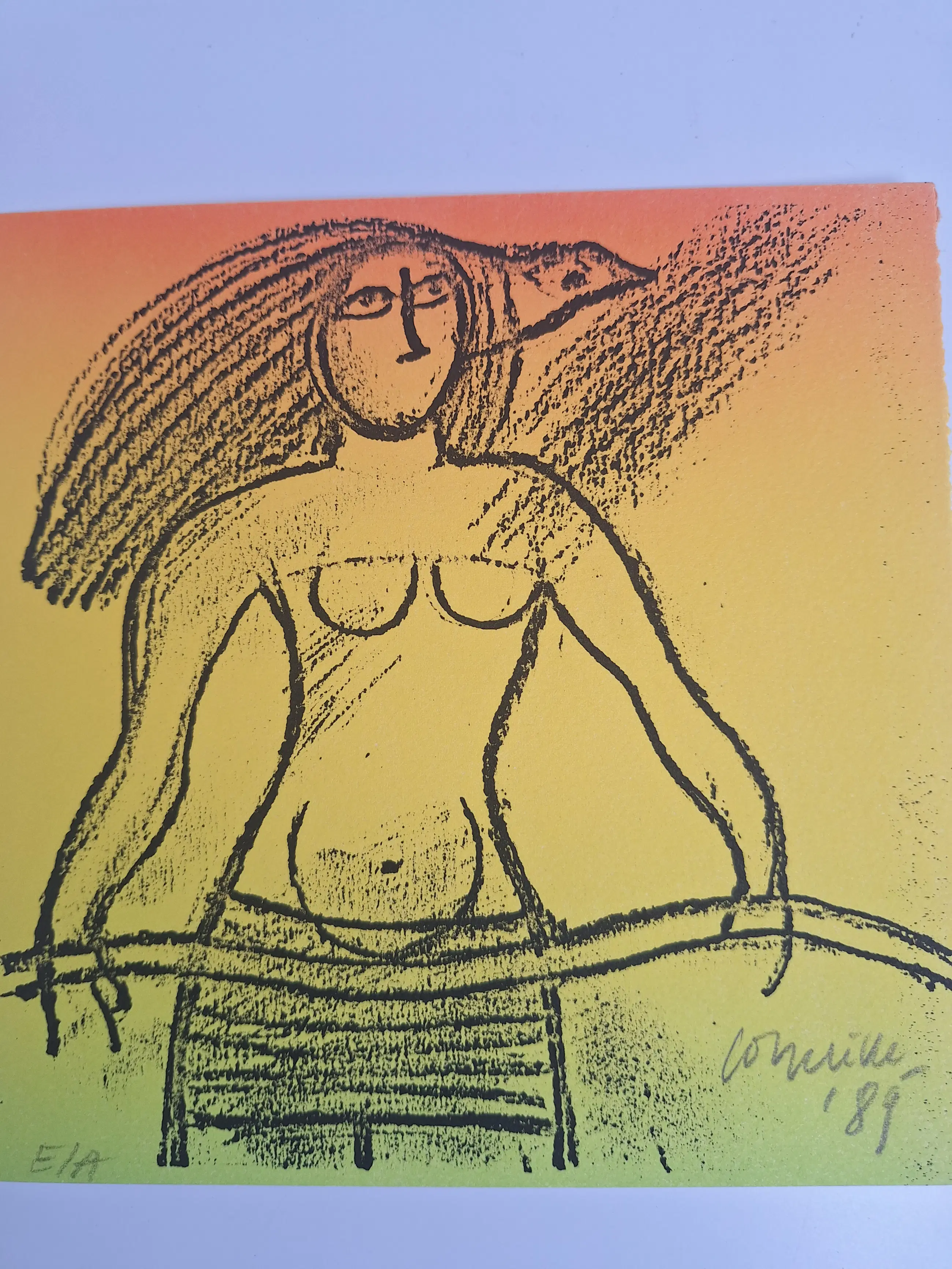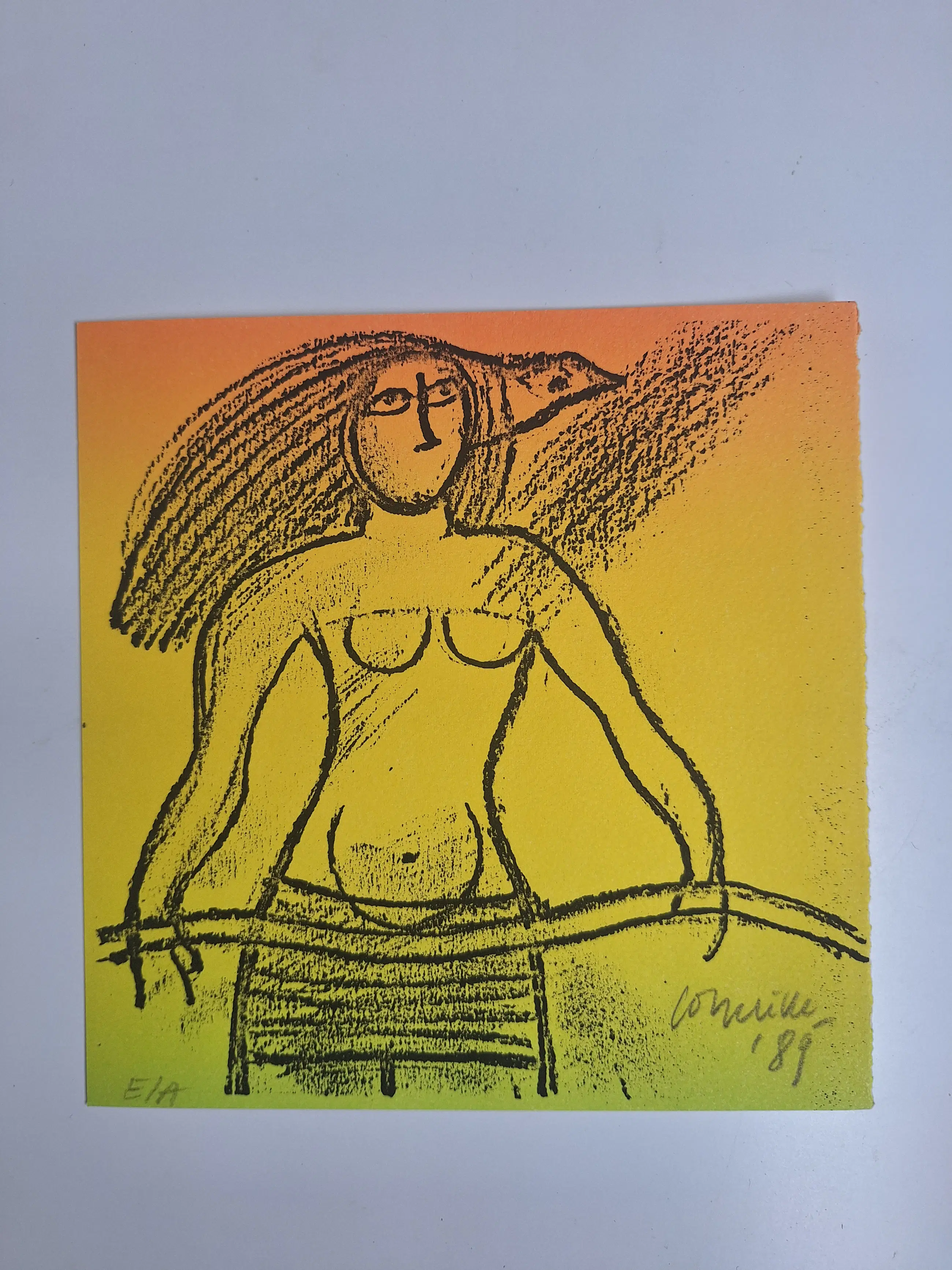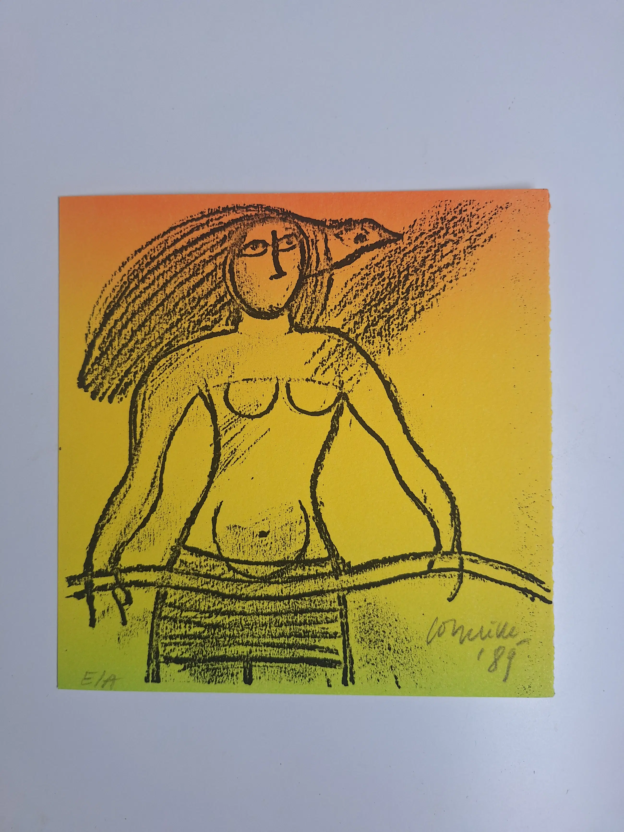 Prachtige zeefdruk van kunstenaar Corneille. Het betreft het stuk maagd uit de sterrenbeelden serie uit 1989. Het stuk is handgesigneerd en E.A. (proefdruk van de kunstenaar zelf.) 20 x 19,5 cm In goede staat