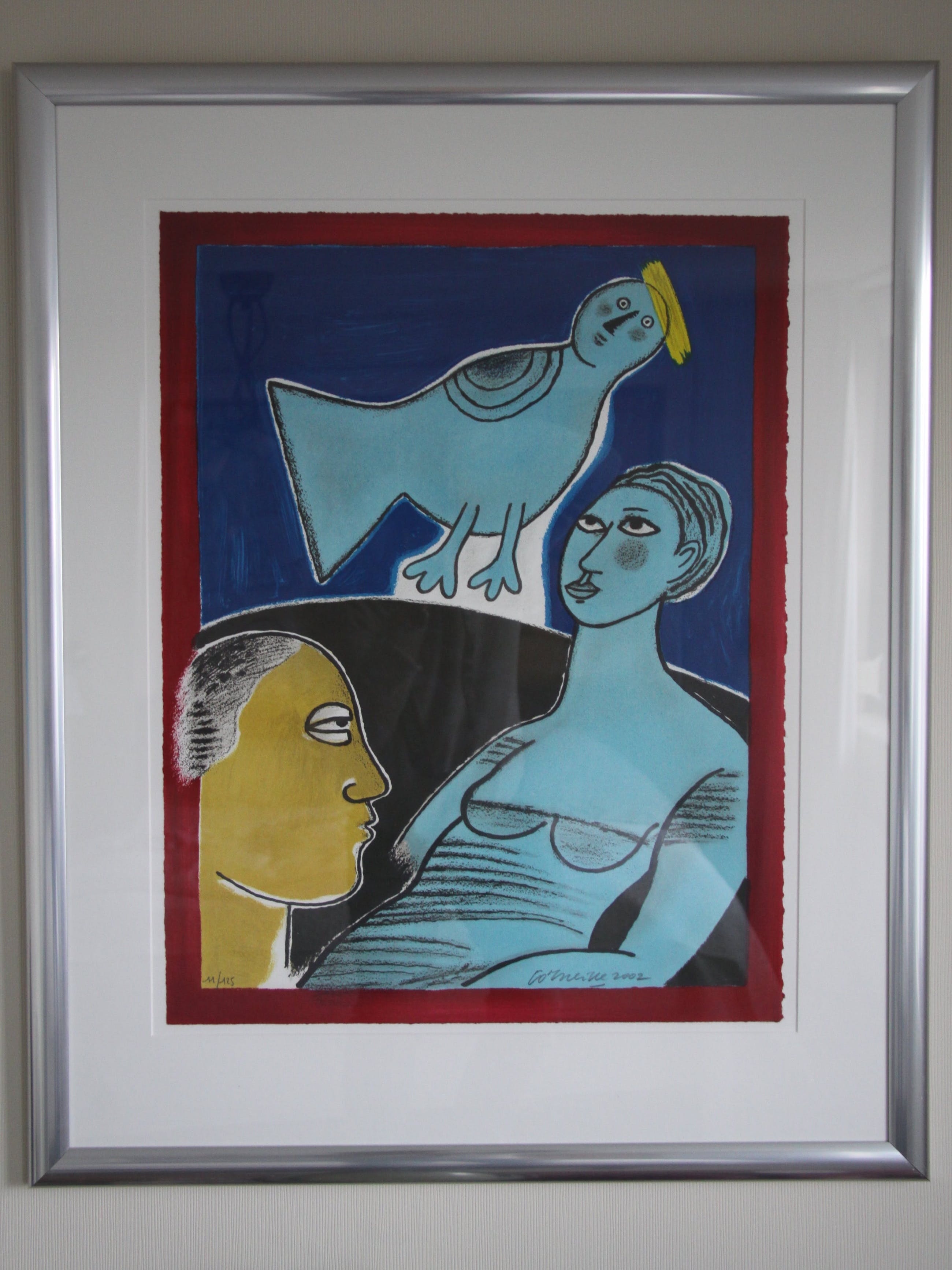 Ingelijste zeefdruk Corneille Man Vrouw Vogel, 2002. Nummer 11 van 125.