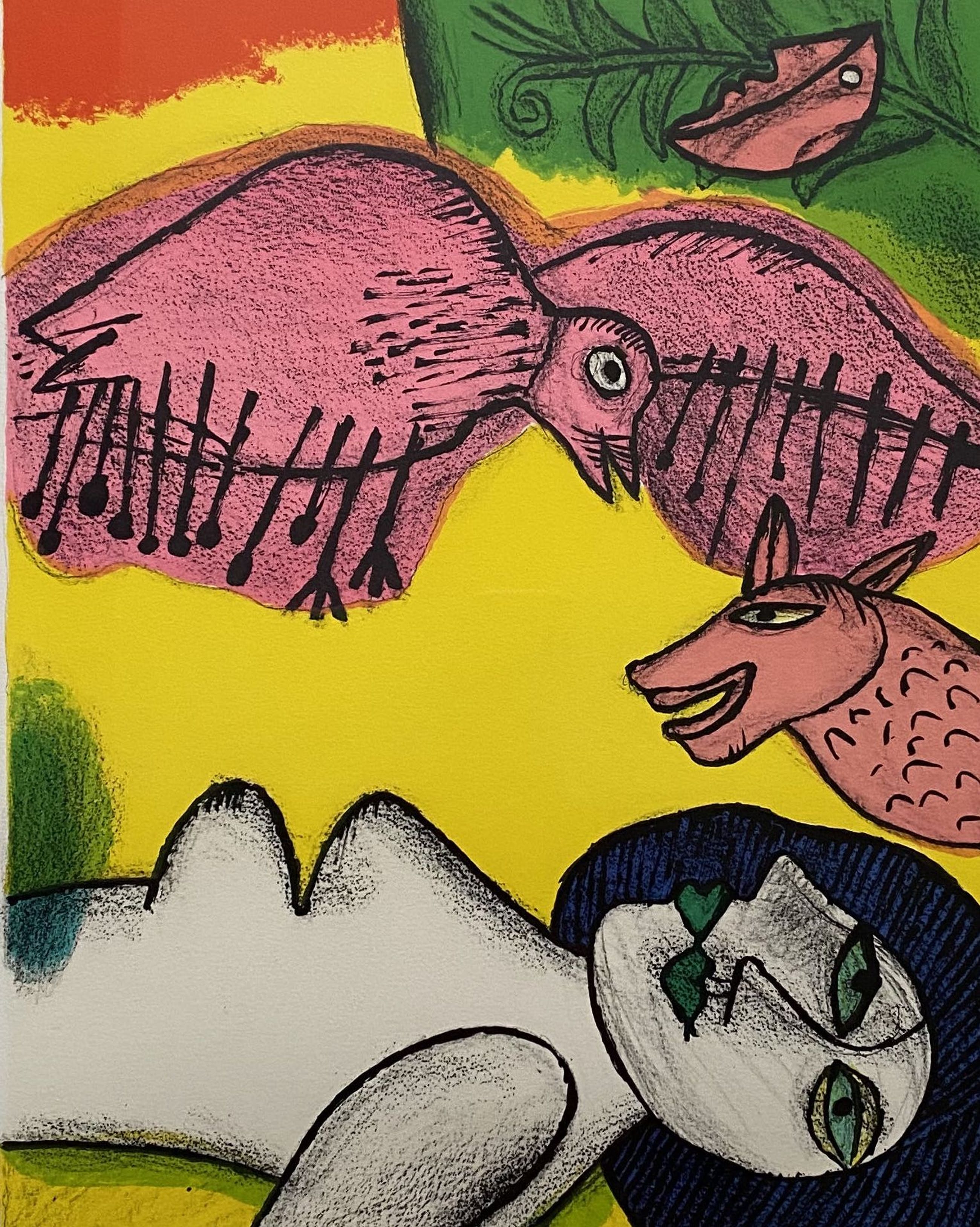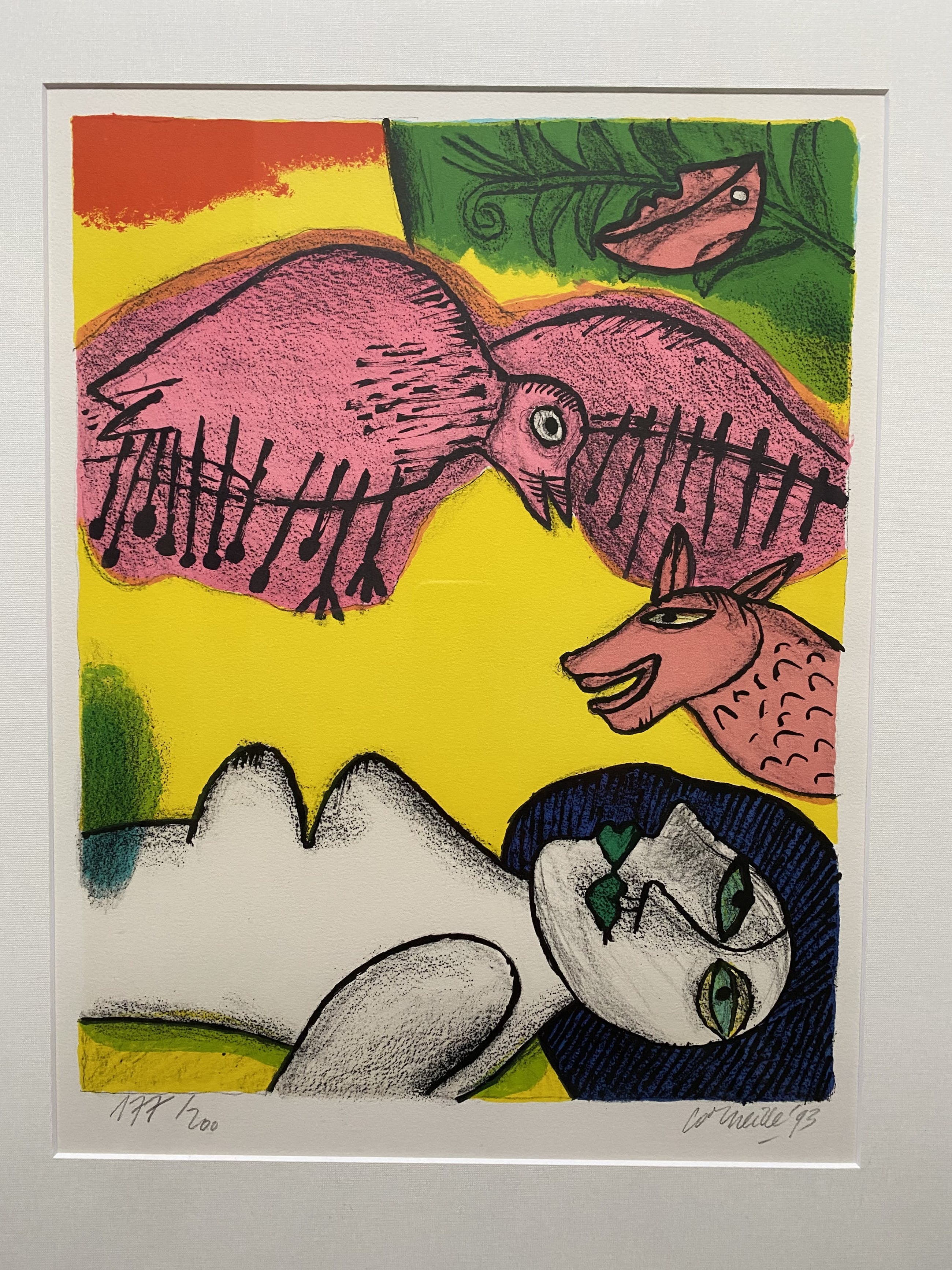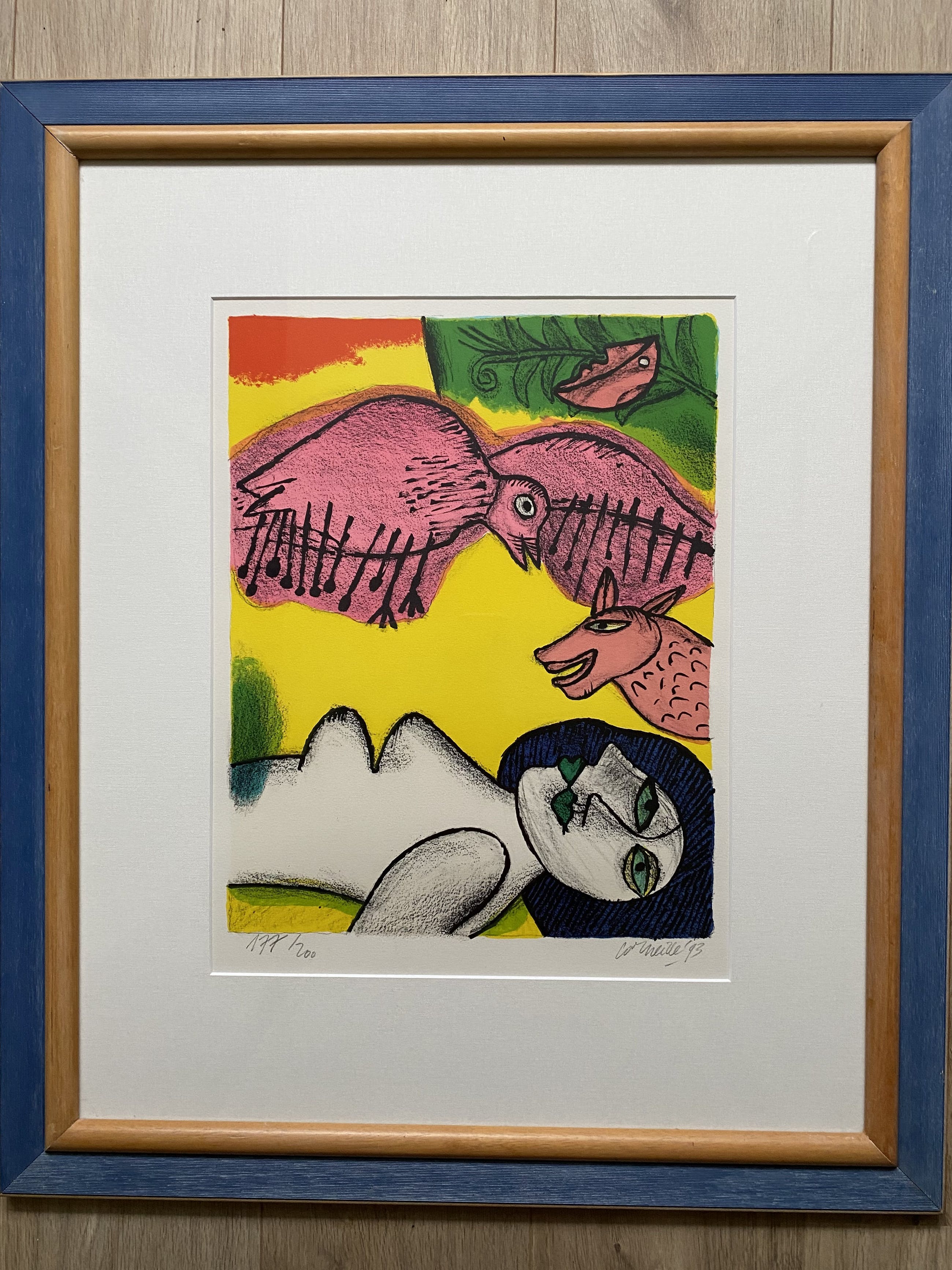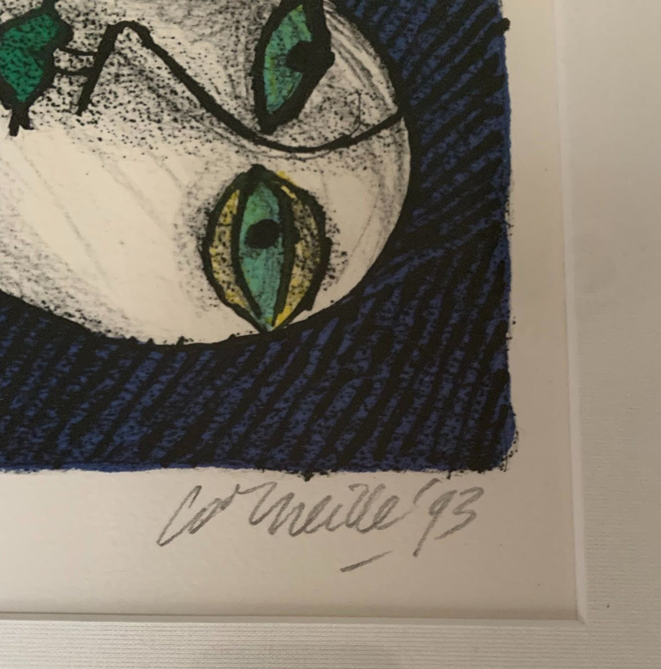 Schitterende zeefdruk van Corneille, mede oprichter van Cobra. Kenmerkend onderwerp in de figuratieve stijl van Corneille. Het werk is begin negentiger jaren aangeschaft bij een lijstenmaker en altijd in bezit geweest. Professioneel ingelijst.