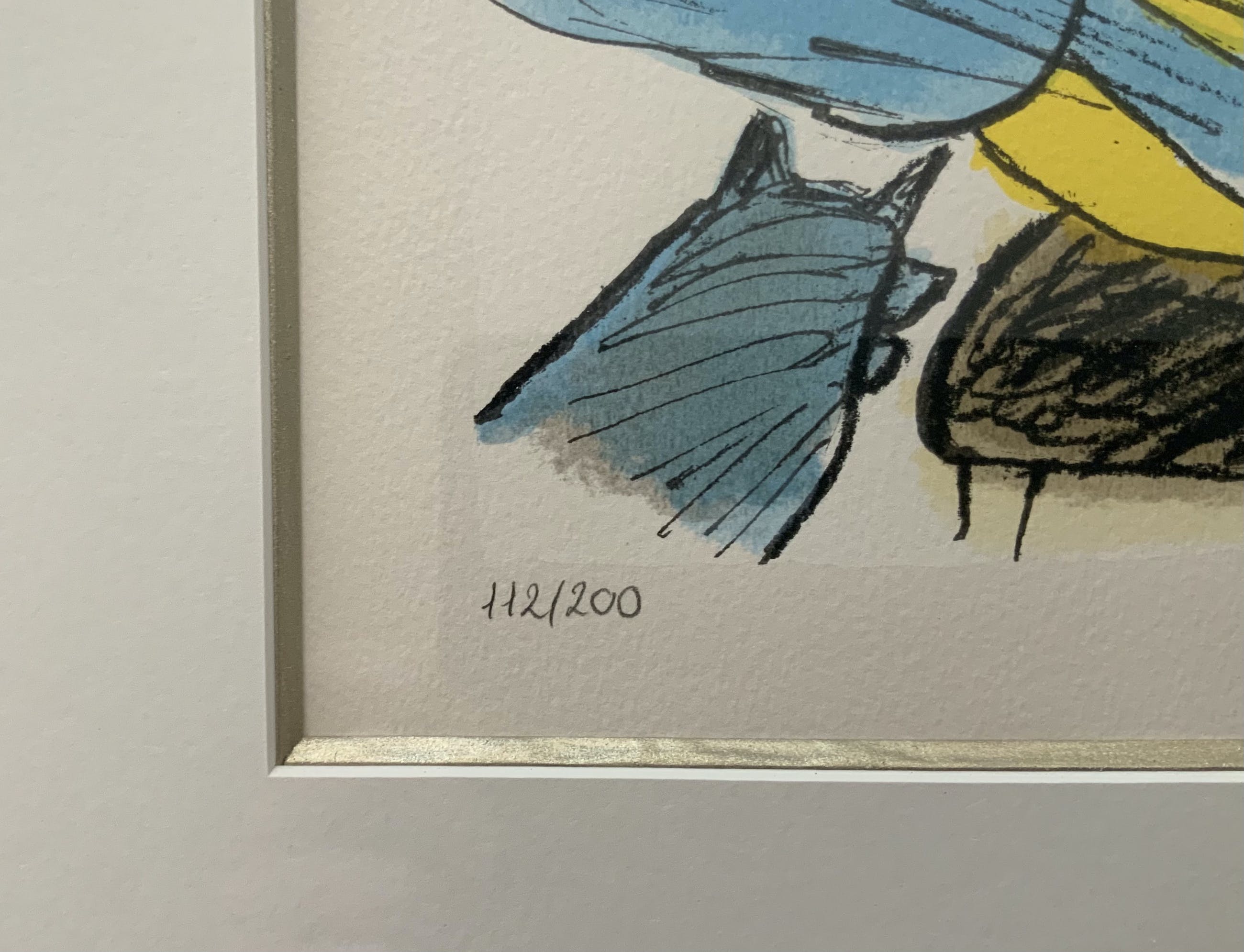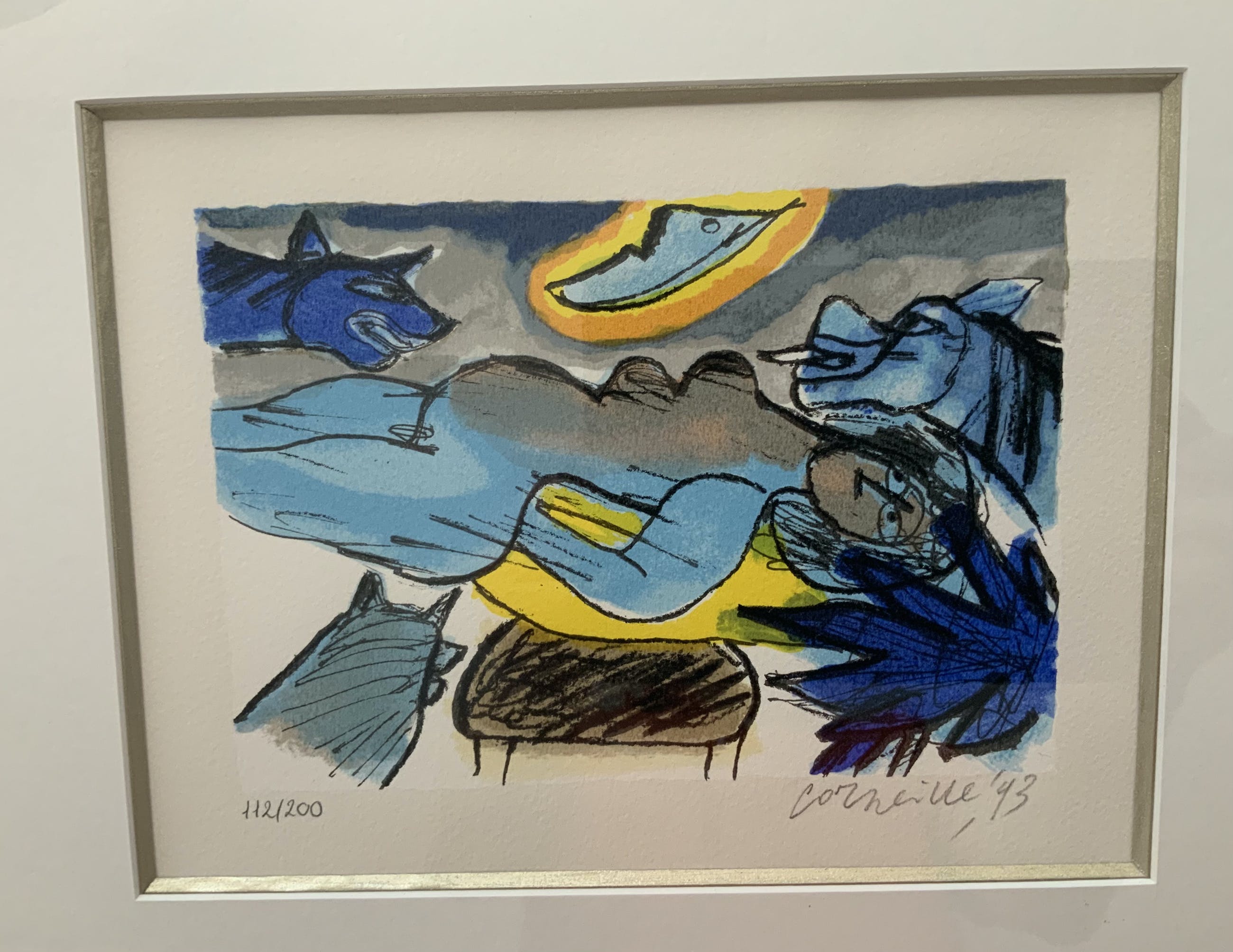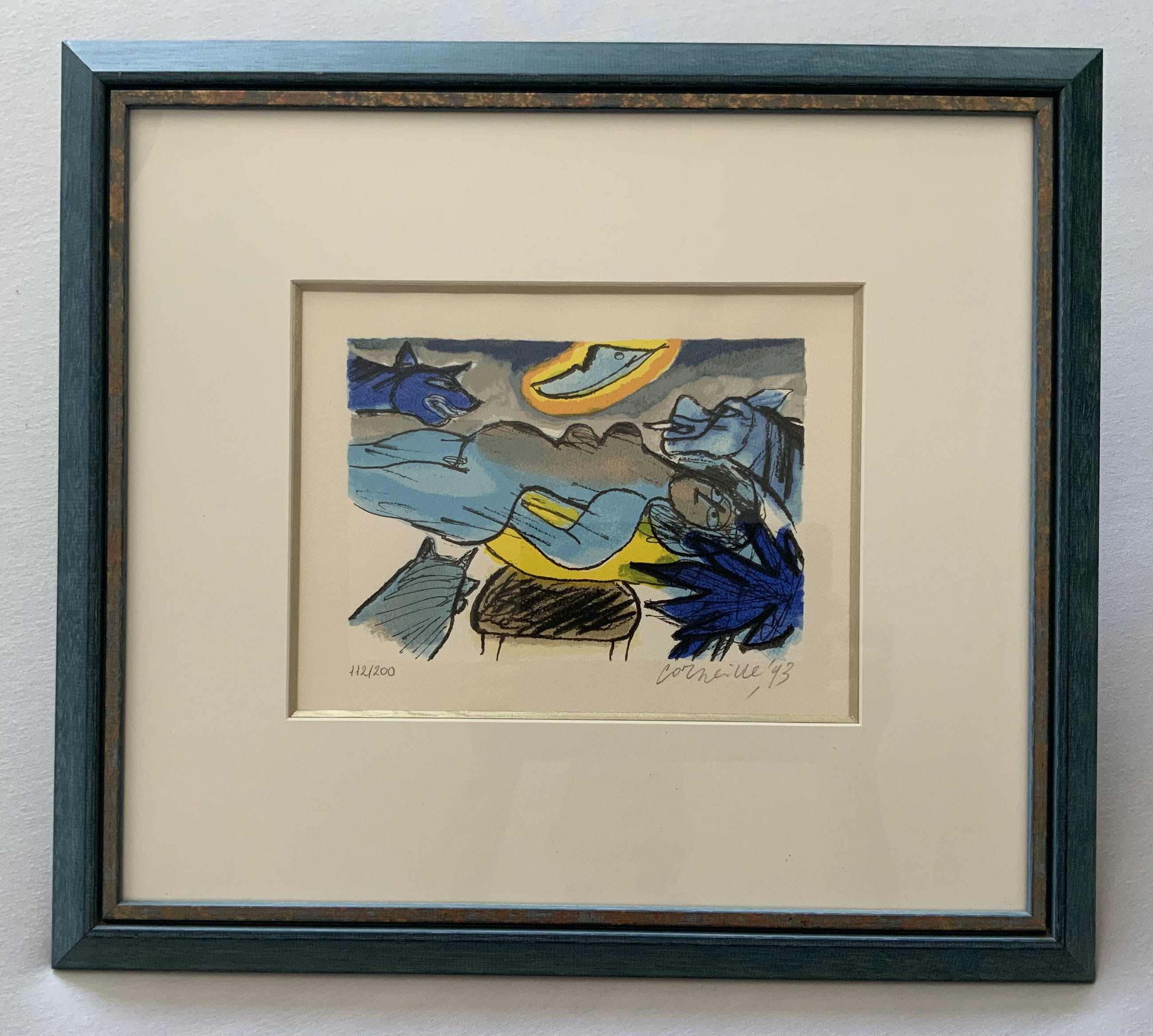 Aangeboden met lijst: Ja, in houten lijst, in kleuren die volledig zijn afgestemd op de kleuren van de zeefdruk. Professioneel ingelijst, In wit passe partout met goudkleurige rand. In uitstekende staat kan zo aan de muur.