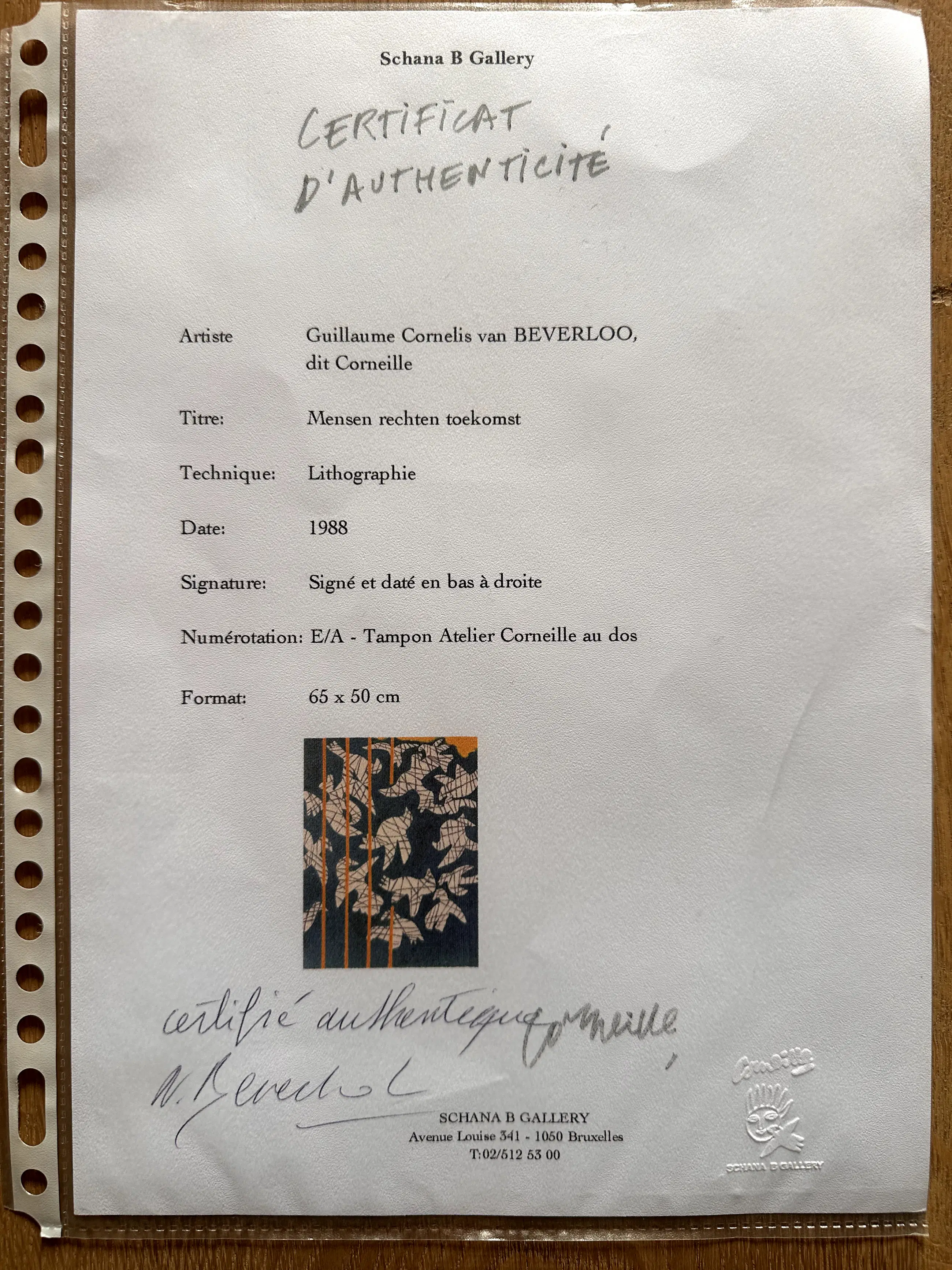 Details: Kunstenaar: Corneille (Guillaume Cornelis van Beverloo) Titel: Mensen rechten toekomst Jaar: 1988 Techniek: Lithografie Editie: E/A (kunstenaarsproef – exclusief) Signatuur: Handgesigneerd en gedateerd rechtsonder Certificaat: Aanwezig (Schana B Gallery, Brussel) Afmetingen blad: ca. 65 x 50 cm Lijst: Ingelijst (zie foto’s) Conditie: Goede staat