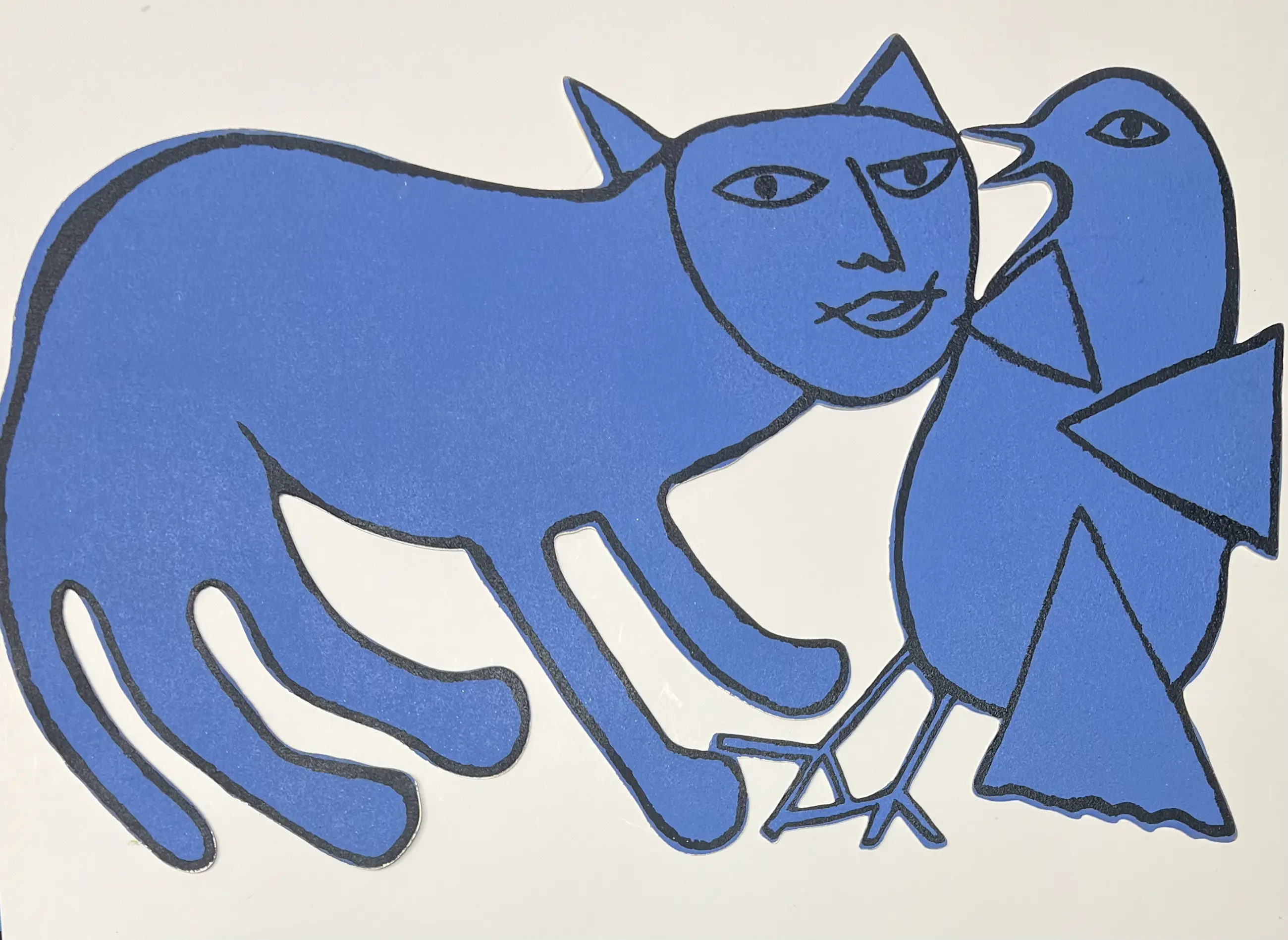 44 x 67 cm. De kat en de vogel zijn geel aan de ene kant, blauw aan de andere.
