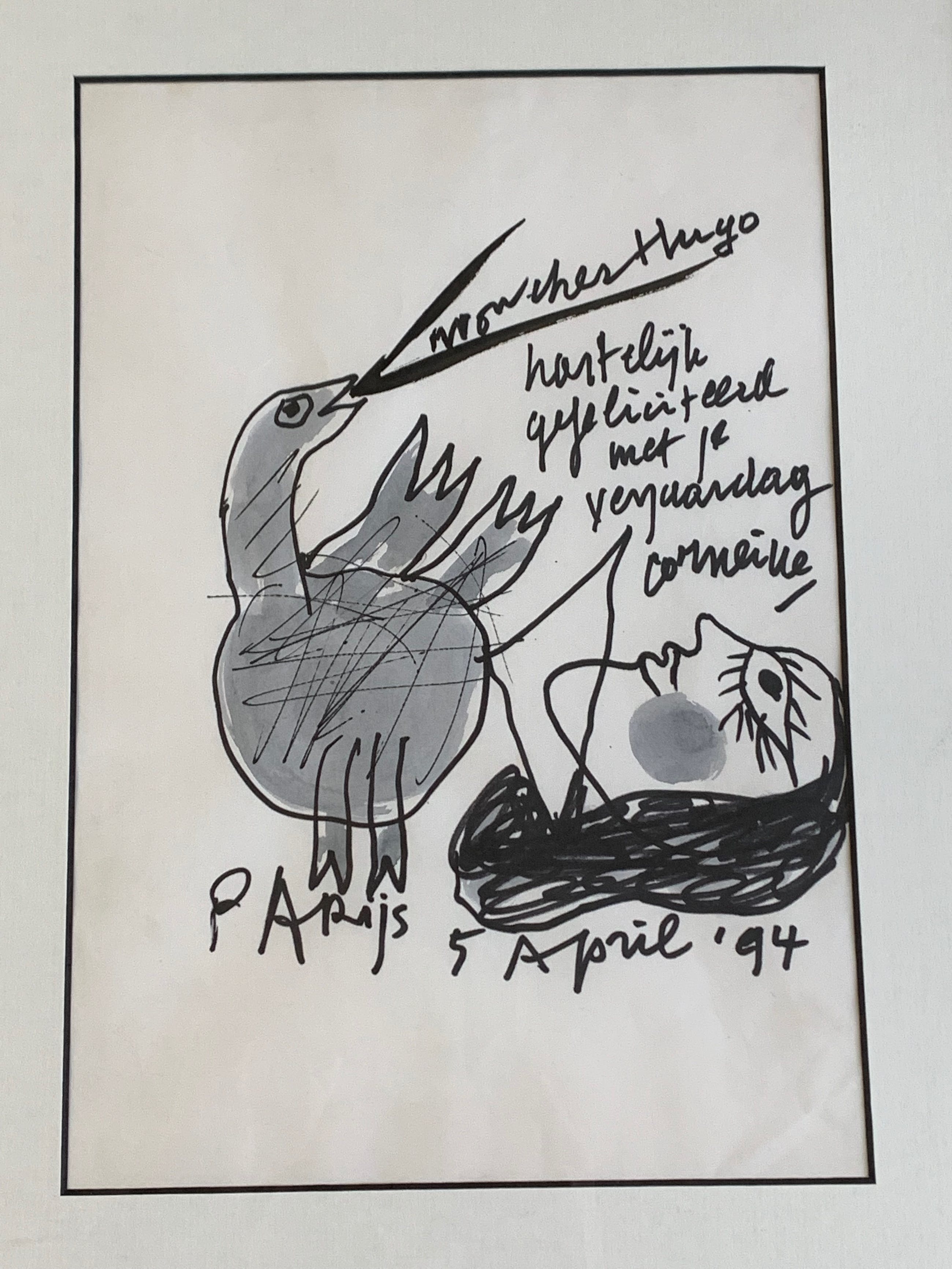 Un dessin d'anniversaire très émouvant entre deux "monstres" de culture Néerlandaise qui se connaissent depuis plus de 4 décennies et qui, à plusieurs reprises, ont créé des oeuvres ensemble. Hugo Claus fête en 1994 ses 65 ans. Ce dessin est aussi un clin d'oeil à l'une de leurs oeuvres emblématiques : "April in Jazz, in Paris", lorsque tous les deux, le peintre et l'écrivain, écoutaient Charlie Parker, dans la Capitale des Arts en 1950.
