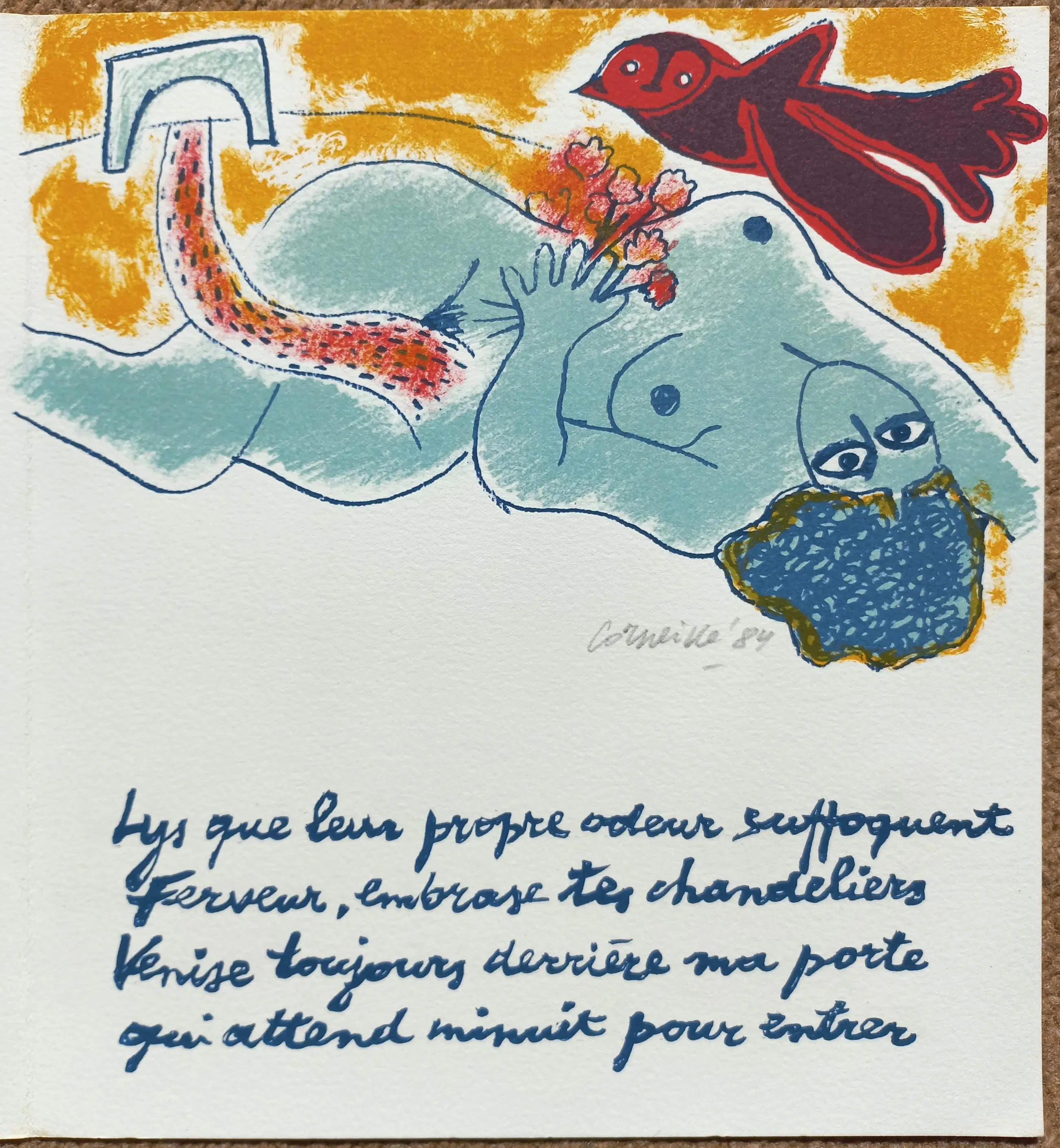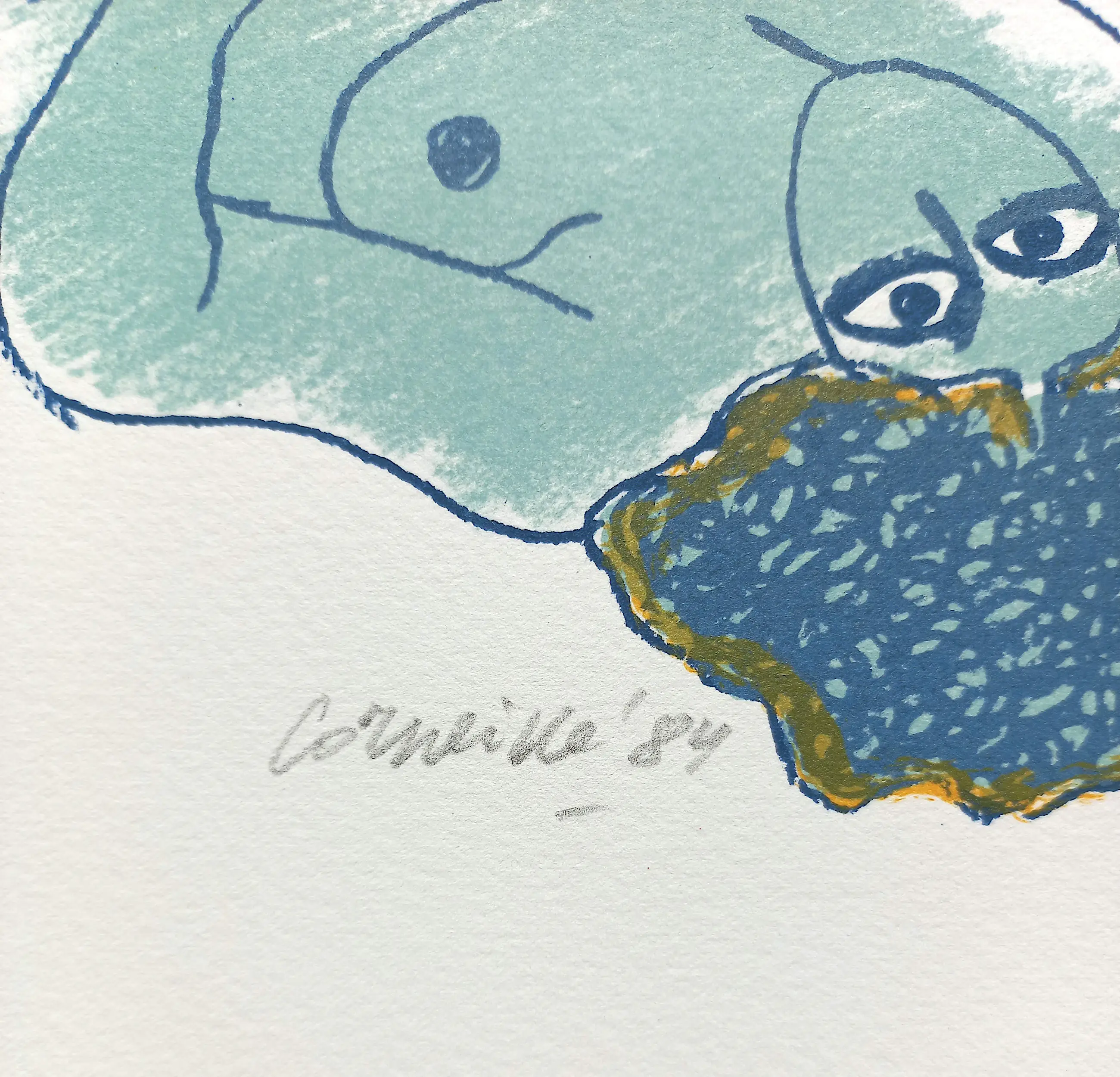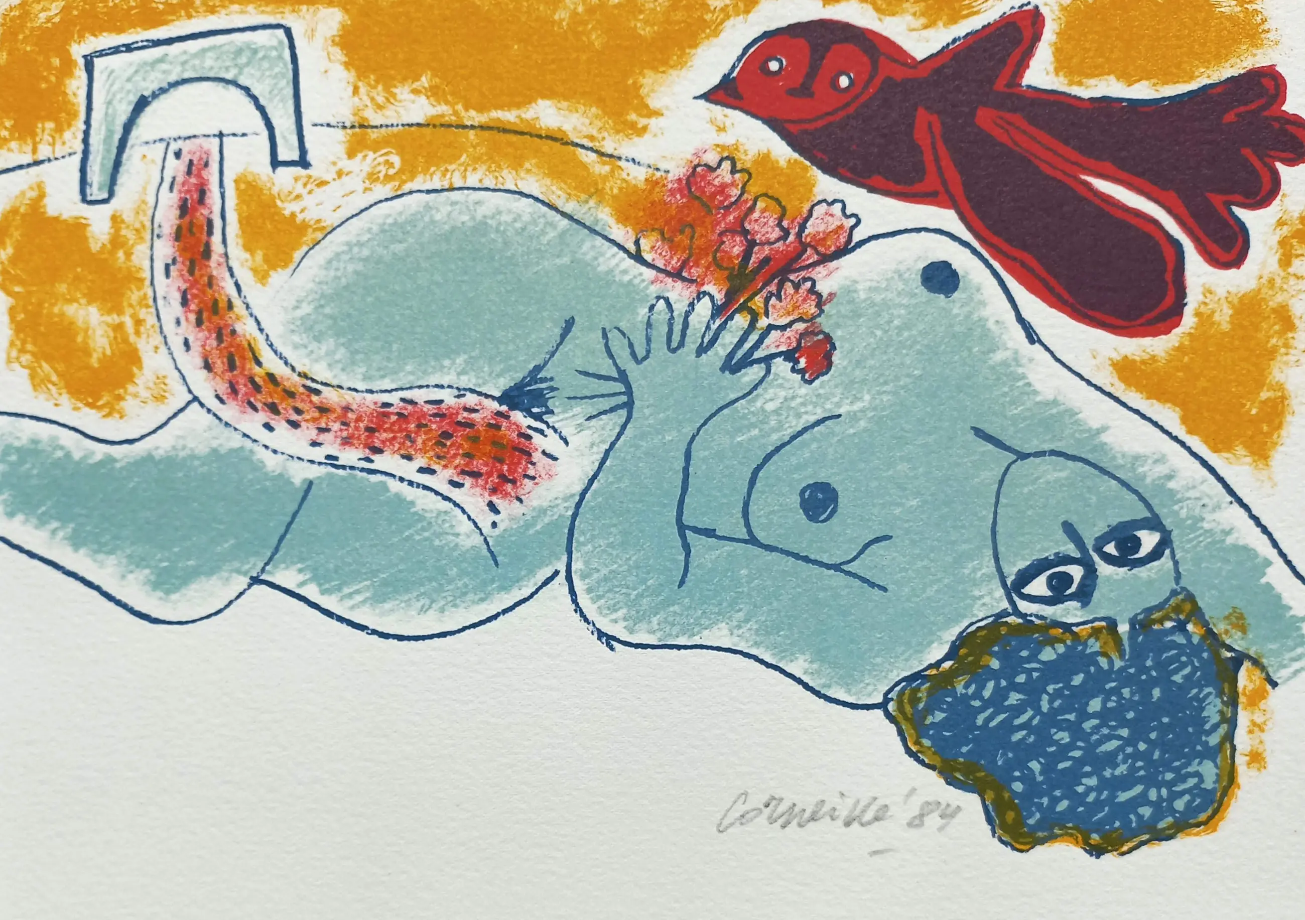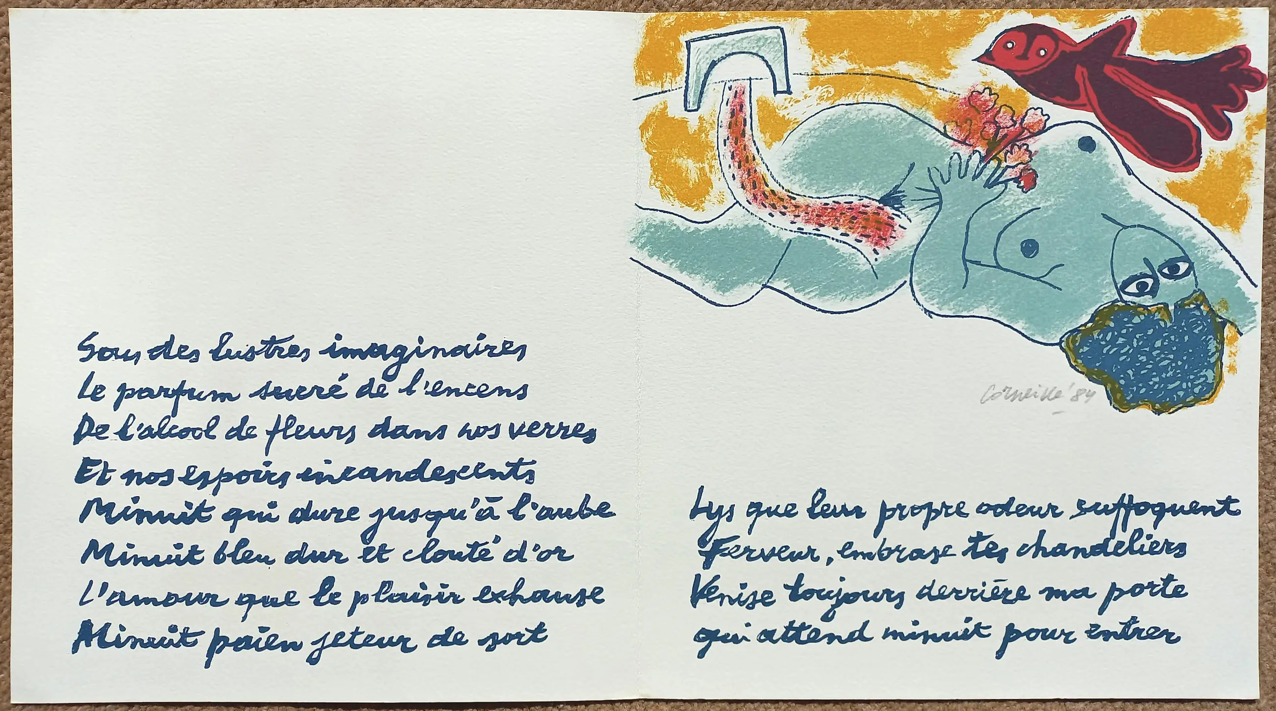 Bekende illustratie van Corneille bij het werk Minuit van Marie Casanova, uitgegeven in een oplage van 99 stuks. Litho op geschept papier, met potlood gesigneerd en gedateerd (‘84). In uitstekende conditie.