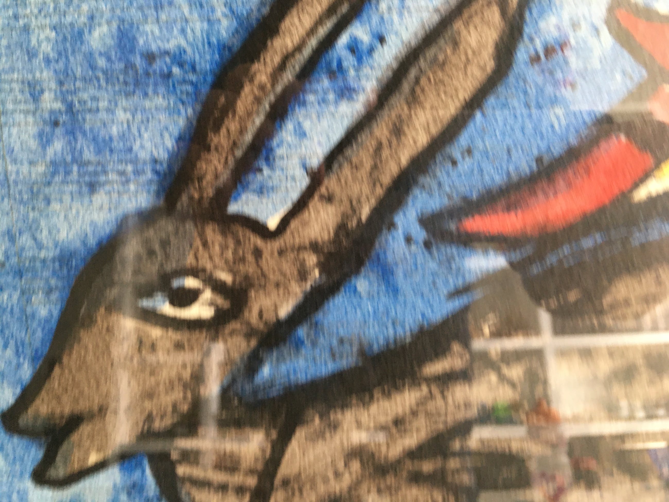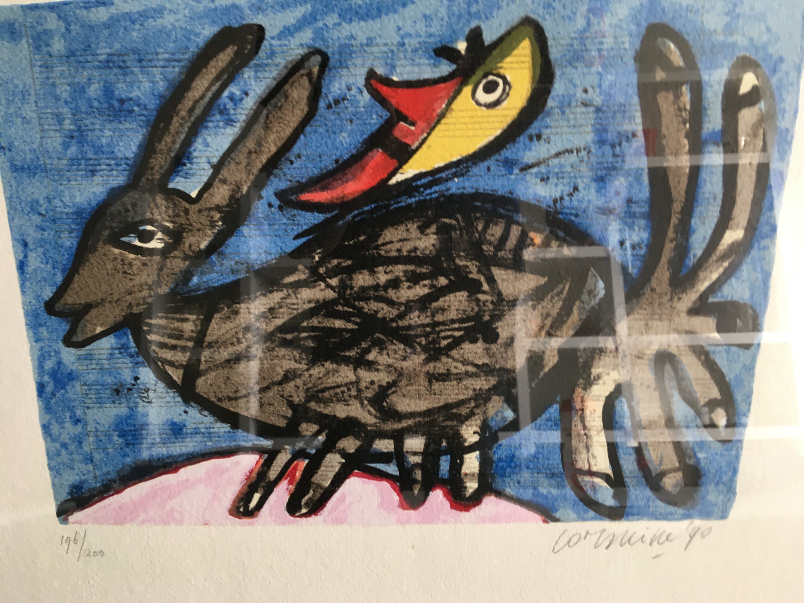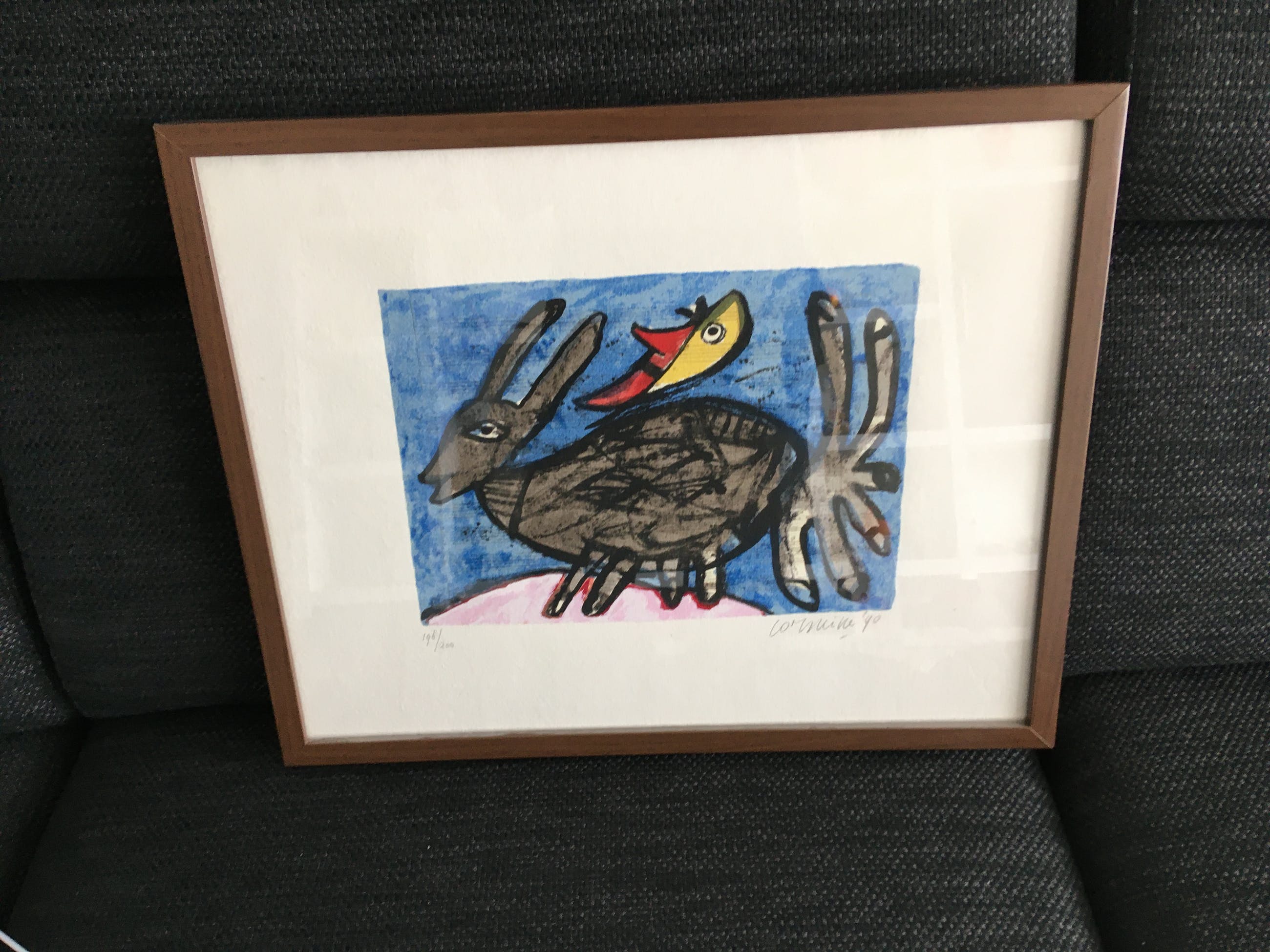 Mooi typerende zeefdruk uit 1990, hand gesigneerd en genummerd in potlood. Het betreft nummer 196 uit een oplage van 200. In fraaie strakke houten omlijsting, passend bij de kleur van het werk. In zeer goede staat.
