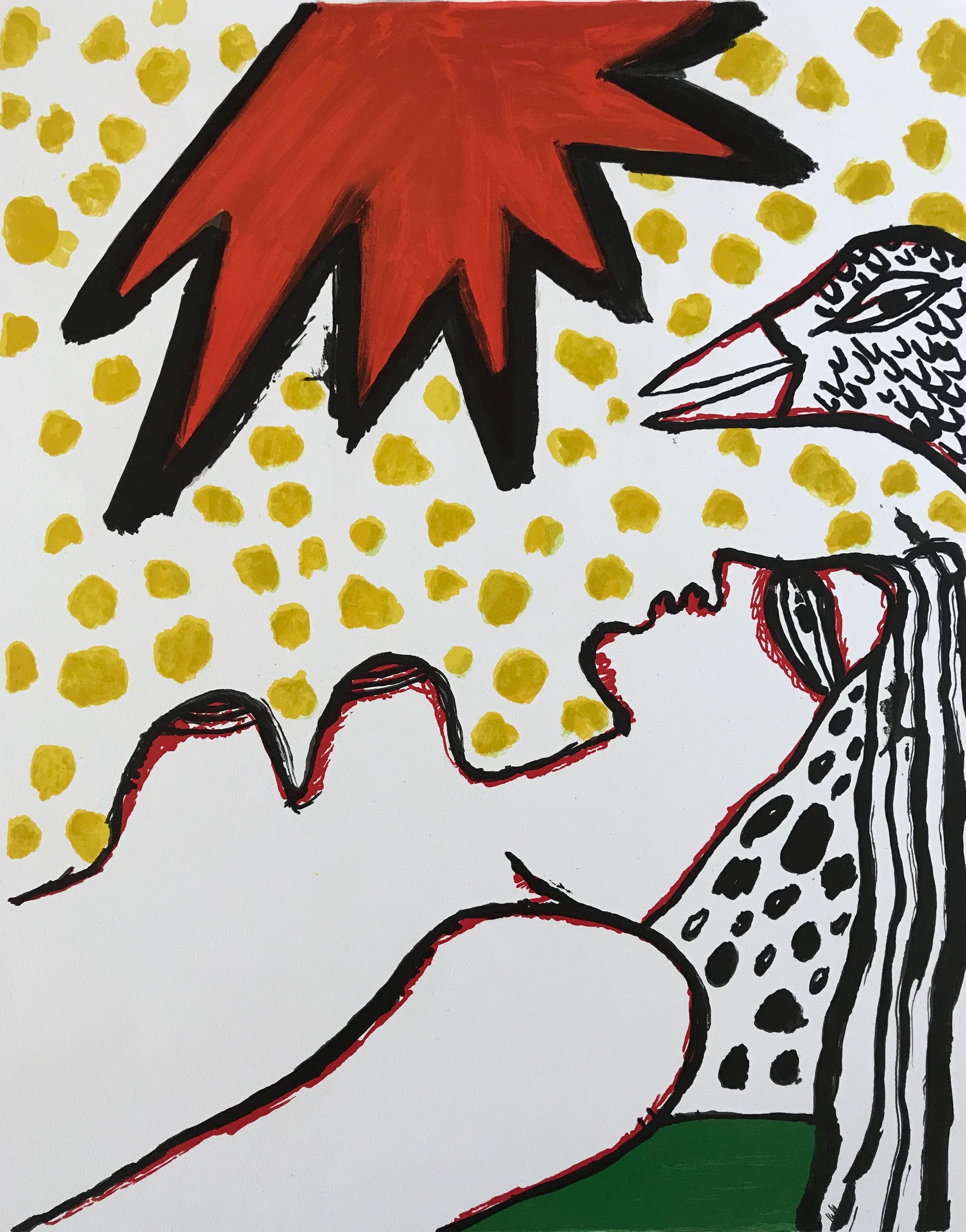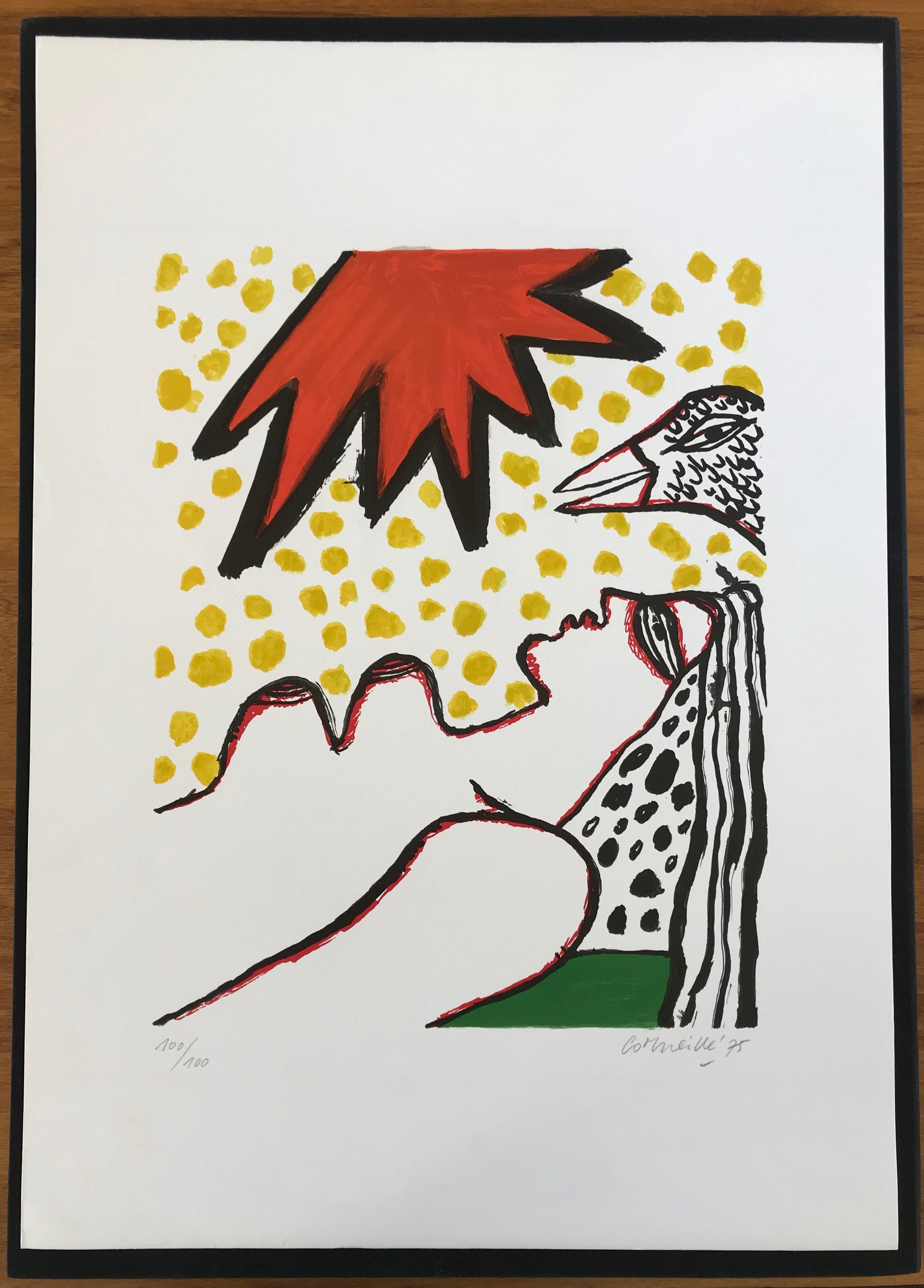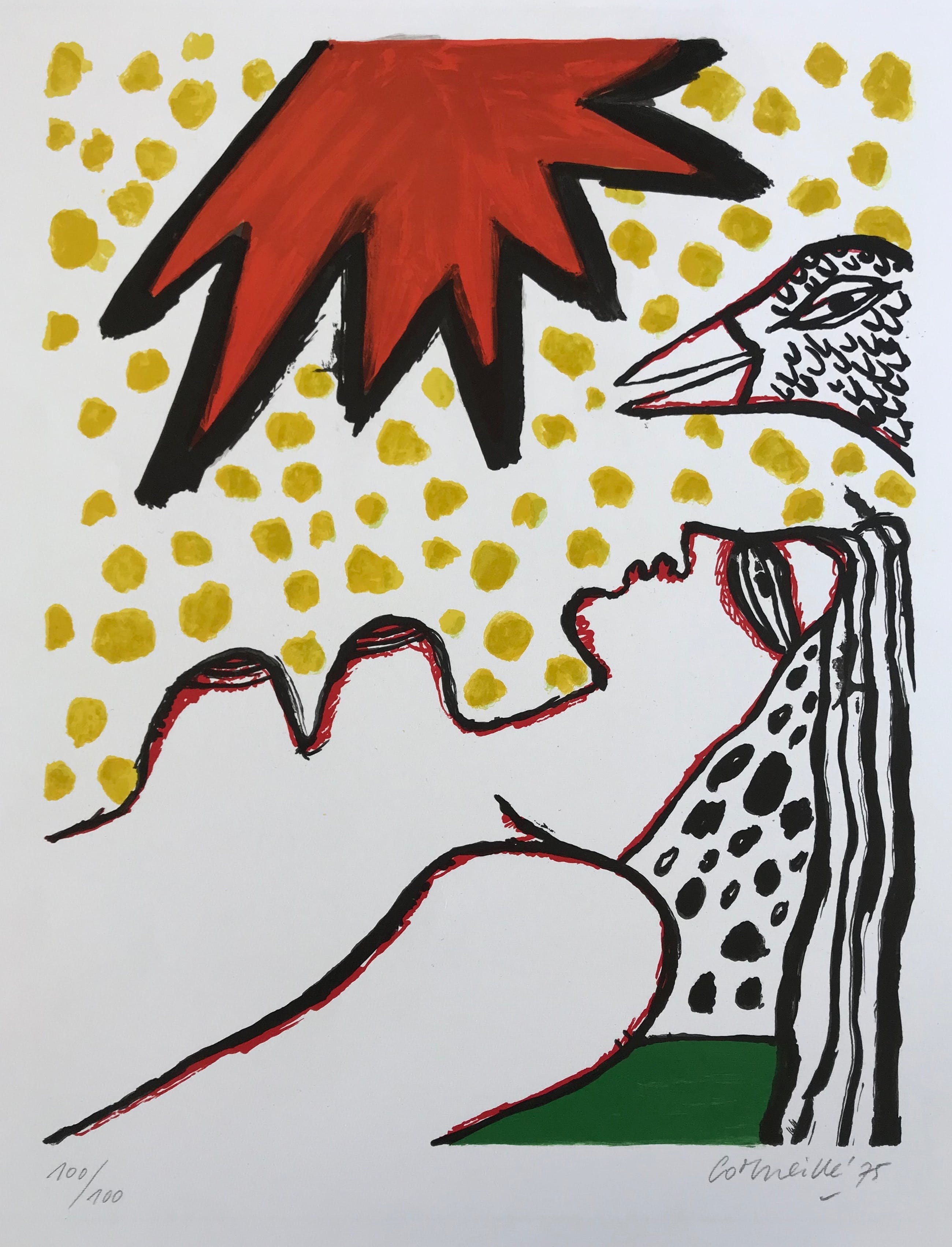 Mooie litho van Corneille Titel: 'Rode zon' Jaartal: 1975 Afmetingen beeld: 45x35 cm Oplage: 100/100 Gesigneerd: Ja, handgeschreven met potlood, alsook gedateerd 75' Materiaal: Zeefdruk op papier Conditie kunstwerk: In zeer goede staat