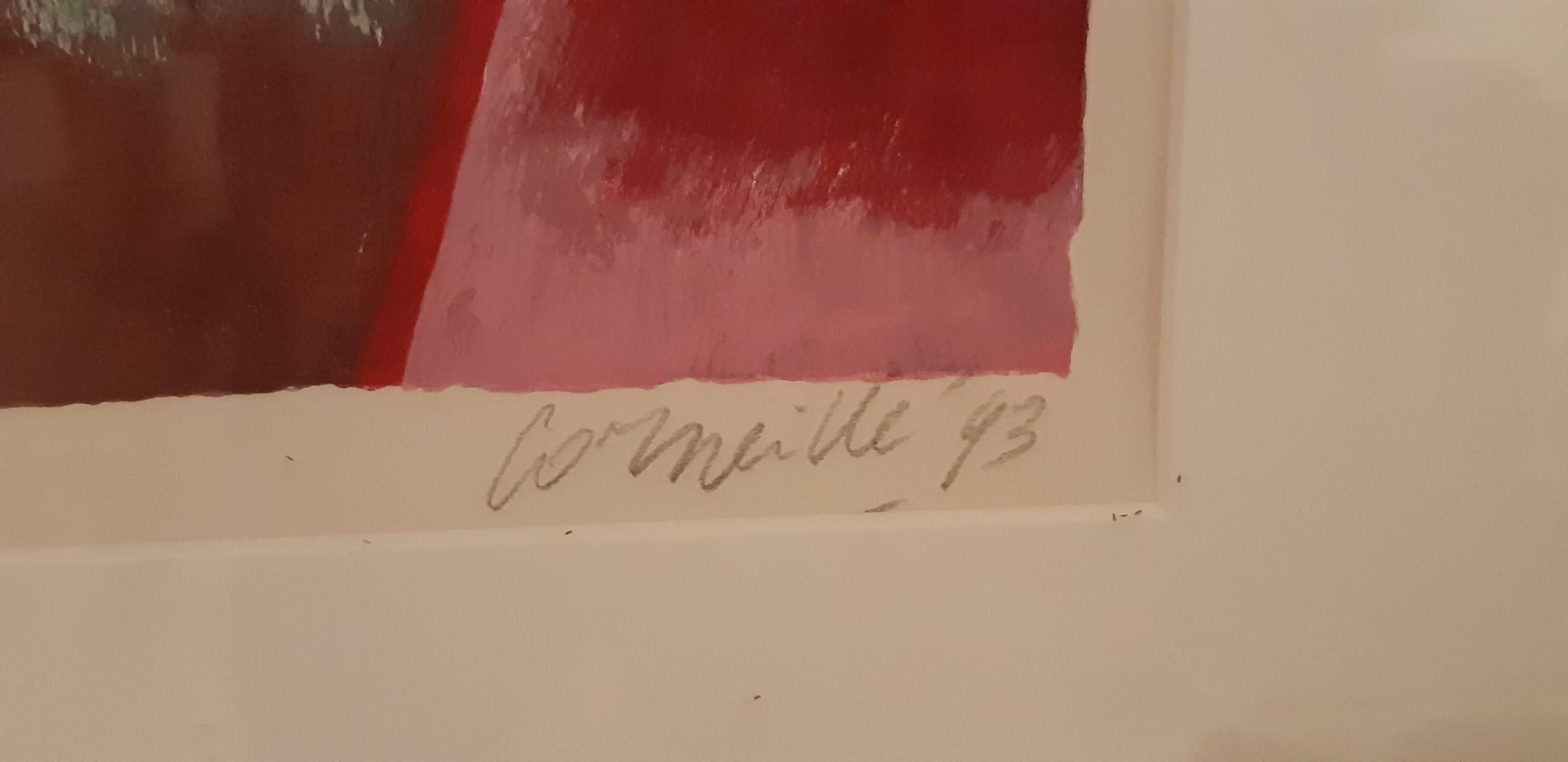 Genummerd 92/200Corneille was een van de oprichters en een van de belangrijkste vertegenwoordigers van de Cobra beweging. Hij was een zeer productieve kunstenaar en heeft een enorme hoeveelheid schilderijen, beelden en grafiek gemaakt. Aanvankelijk sterk onder invloed van Picasso, maar later met de voor Corneille zeer bekende stijlkenmerken van de Cobra. Corneille heeft abstract gewerkt, maar vanaf 1960 ongeveer werkt hij figuratief met de bekende vogels, vrouwen, en bloemen als onderwerp.