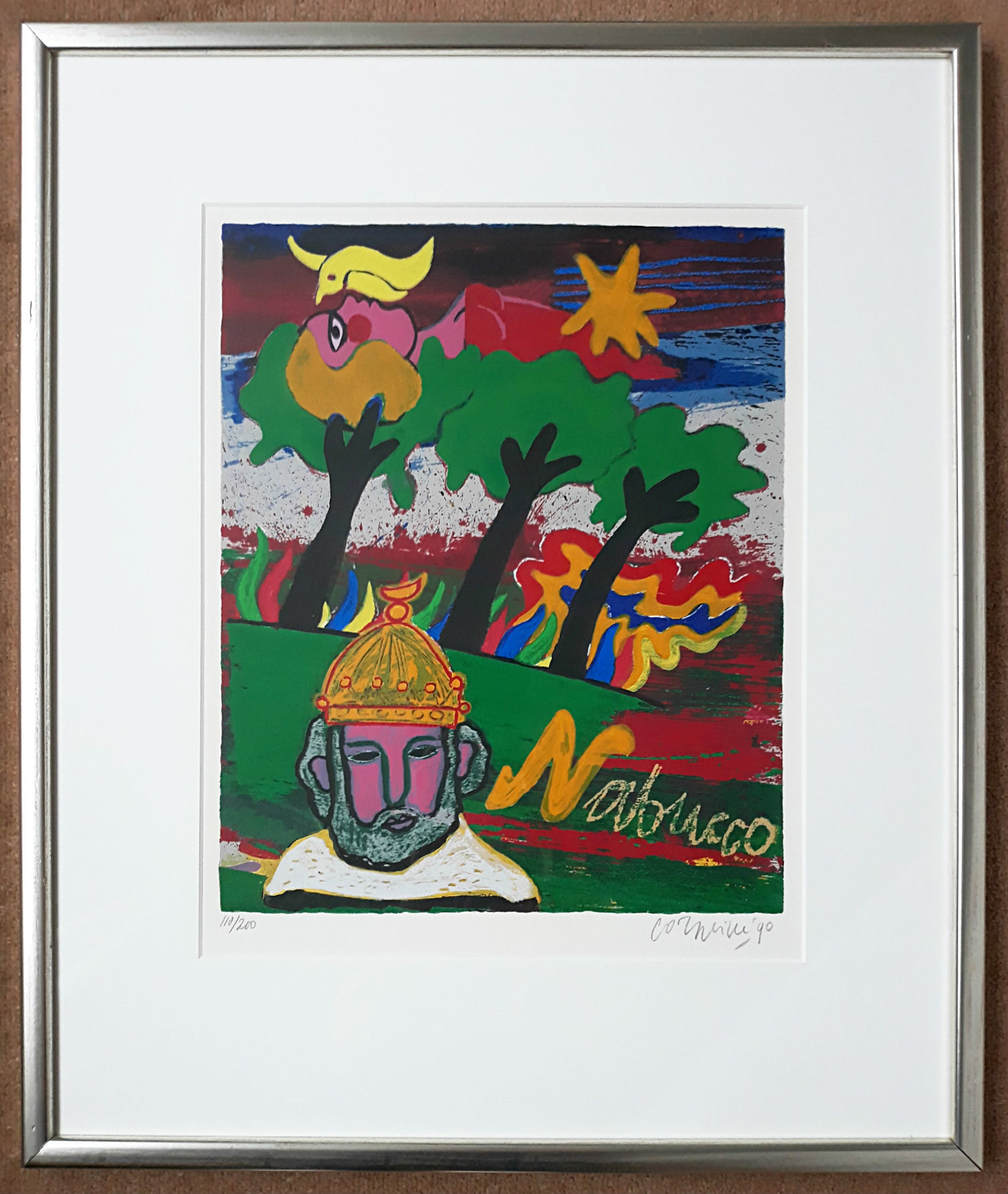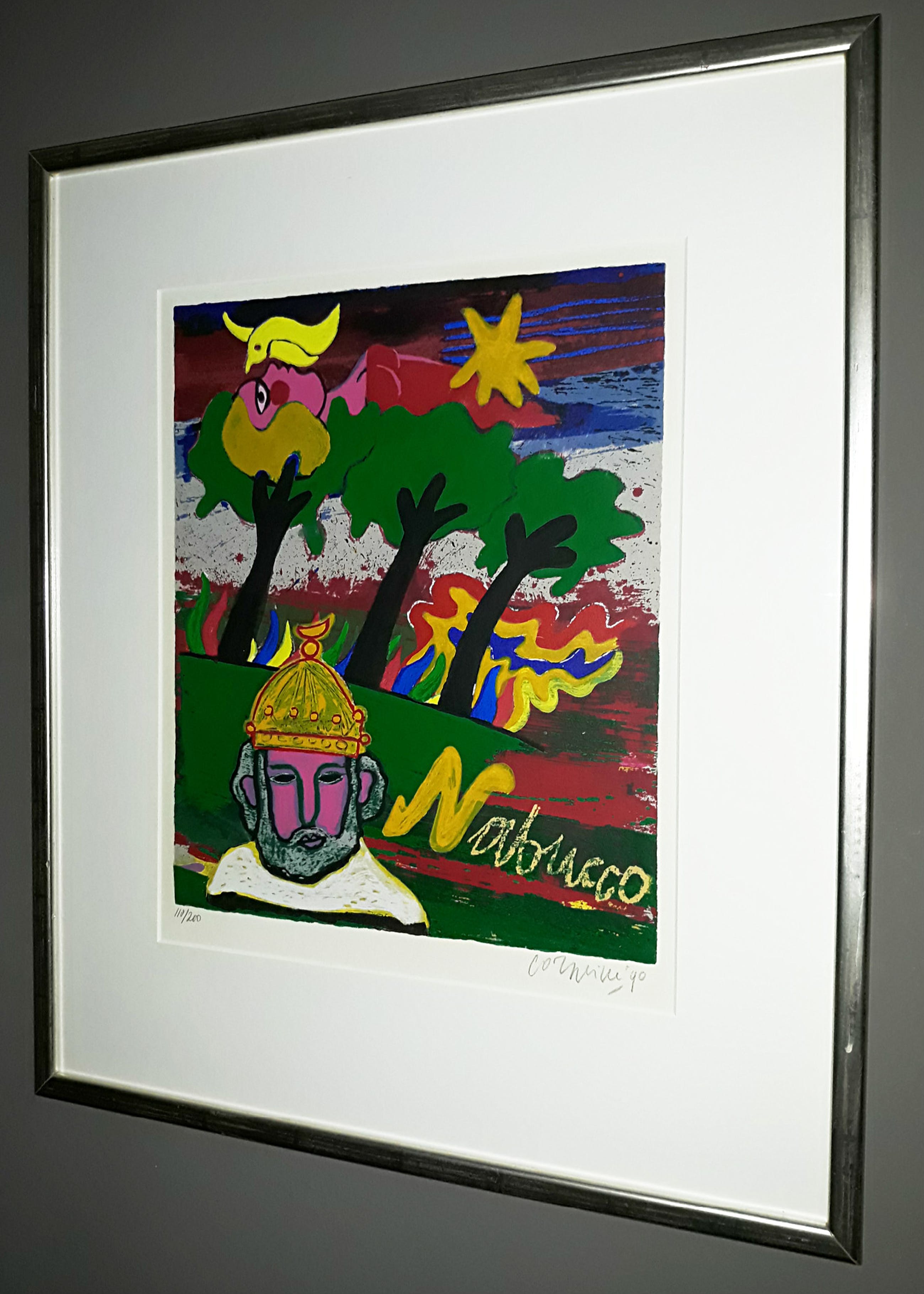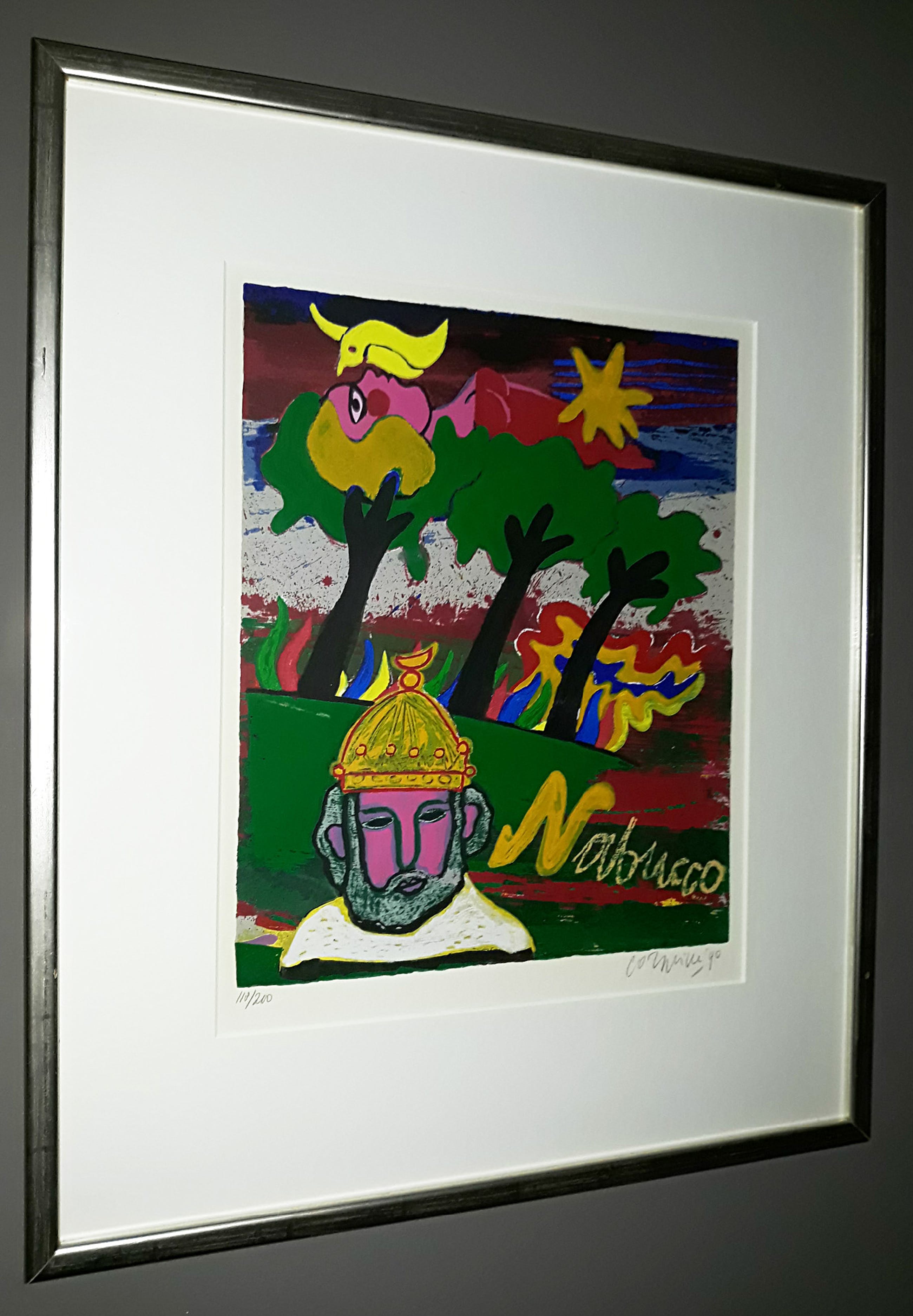 Mooi, herkenbaar werk uit de serie “Ommagio a G. Verdi”. Zeefdruk op 300 grams Eskulan papier, met potlood gesigneerd, gedateerd (‘90) en genummerd (118/200). In prachtige lijst, achter glas en met smetteloos, zuurvrij passe-partout. Alles in uitstekende conditie. Afkomstig uit de kunstcollectie van Price Waterhouse.