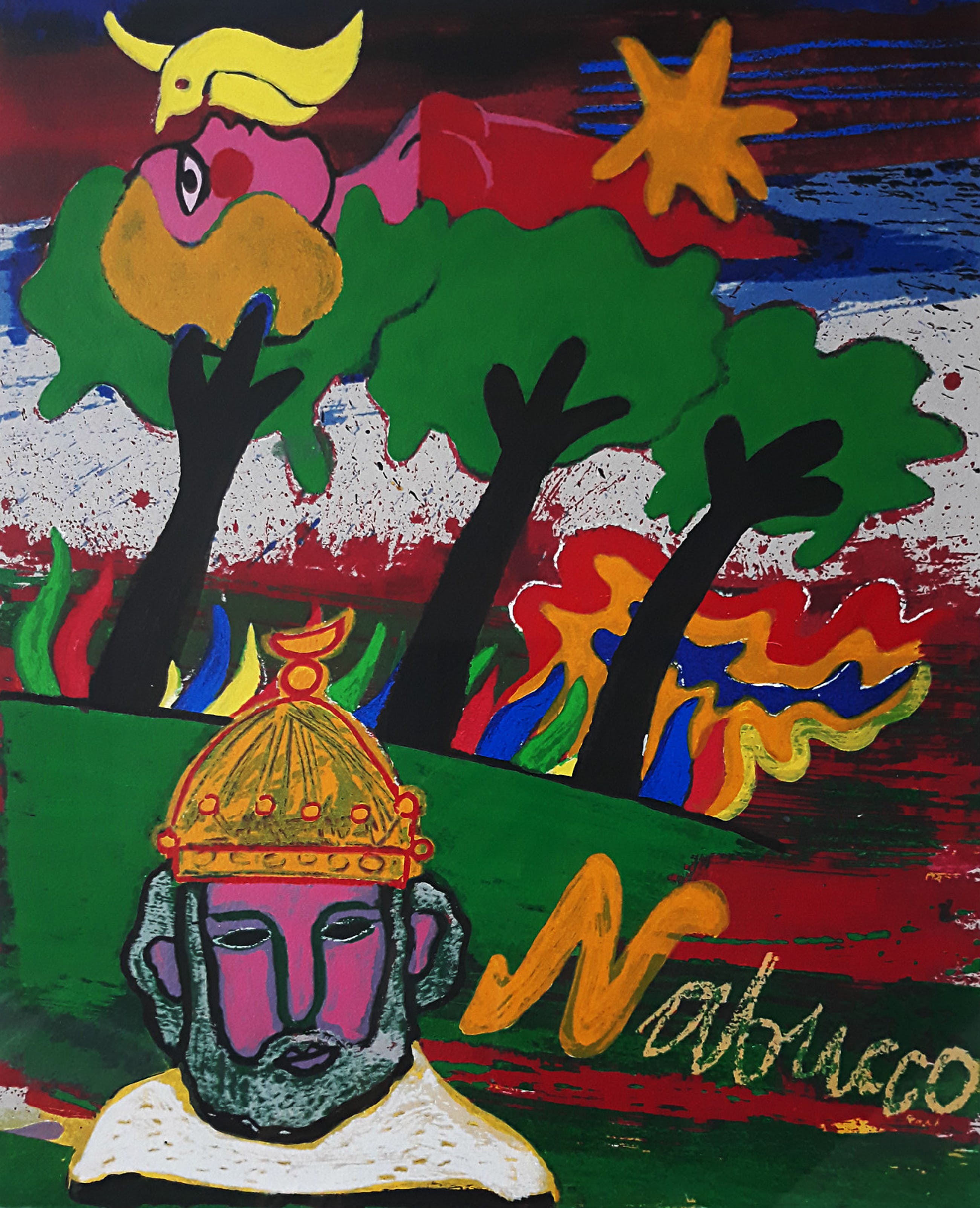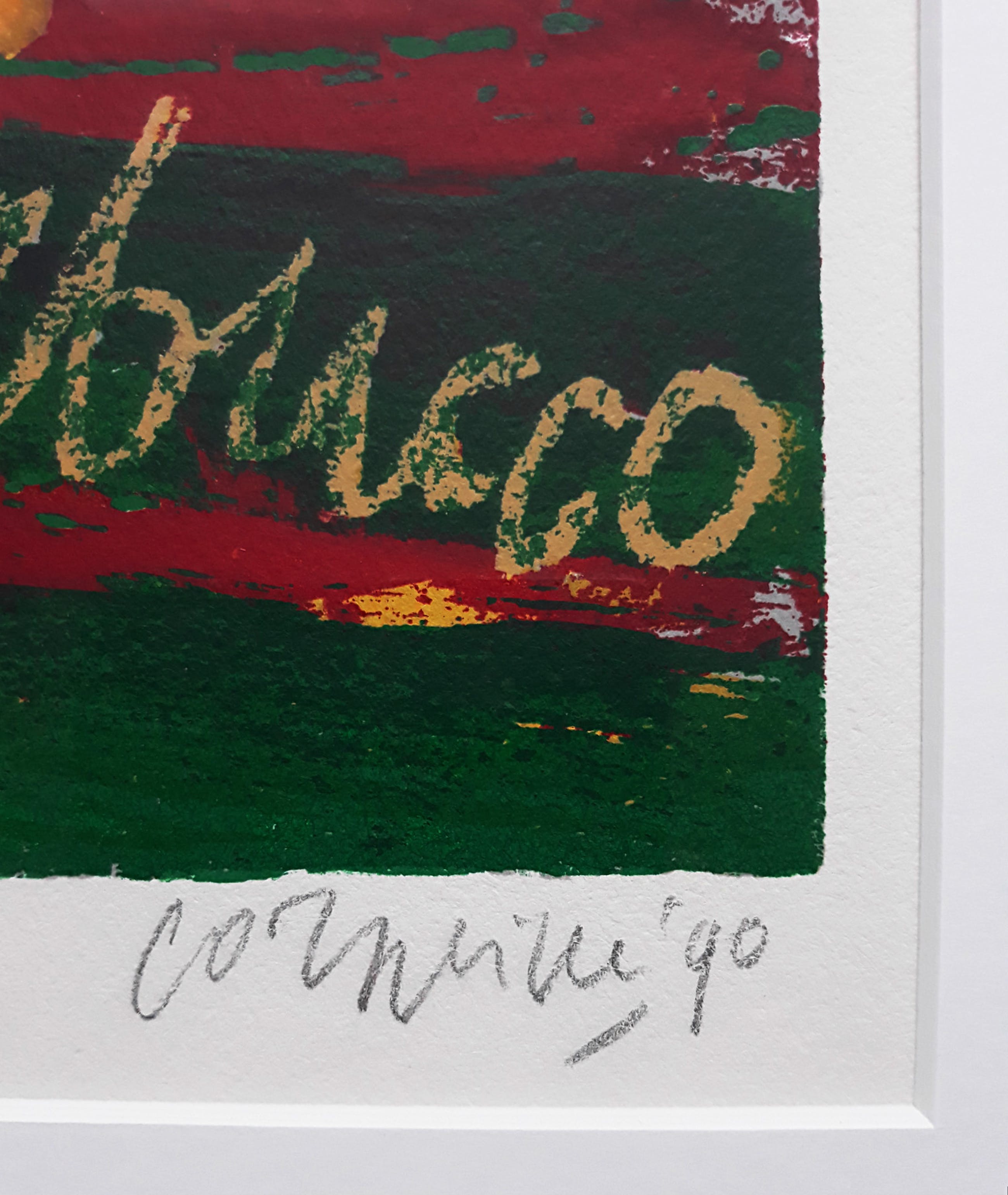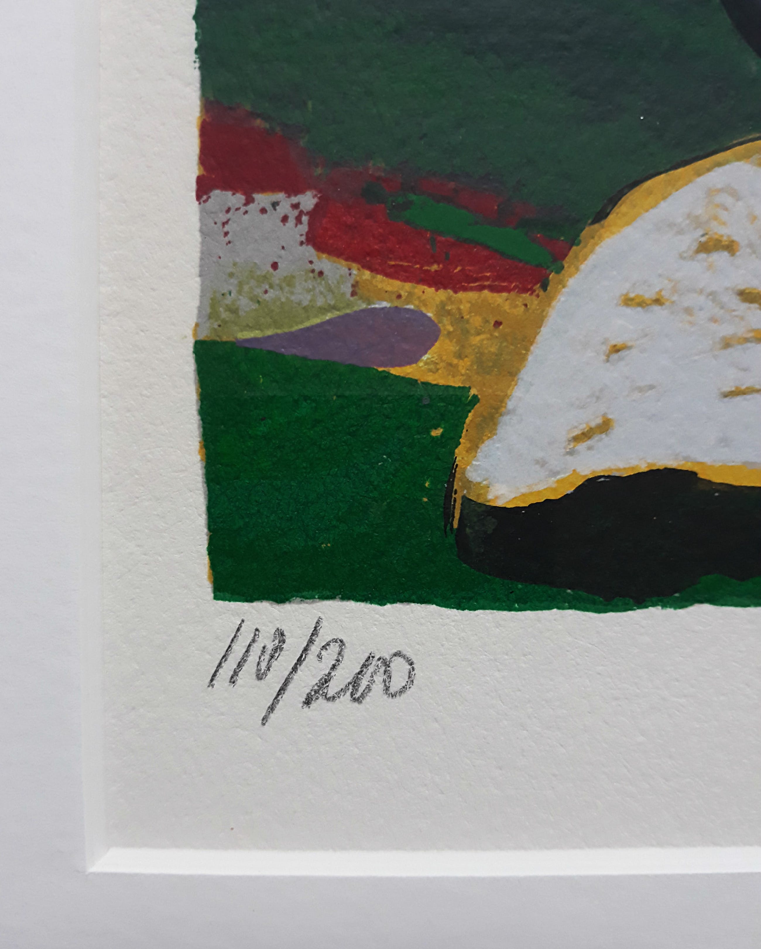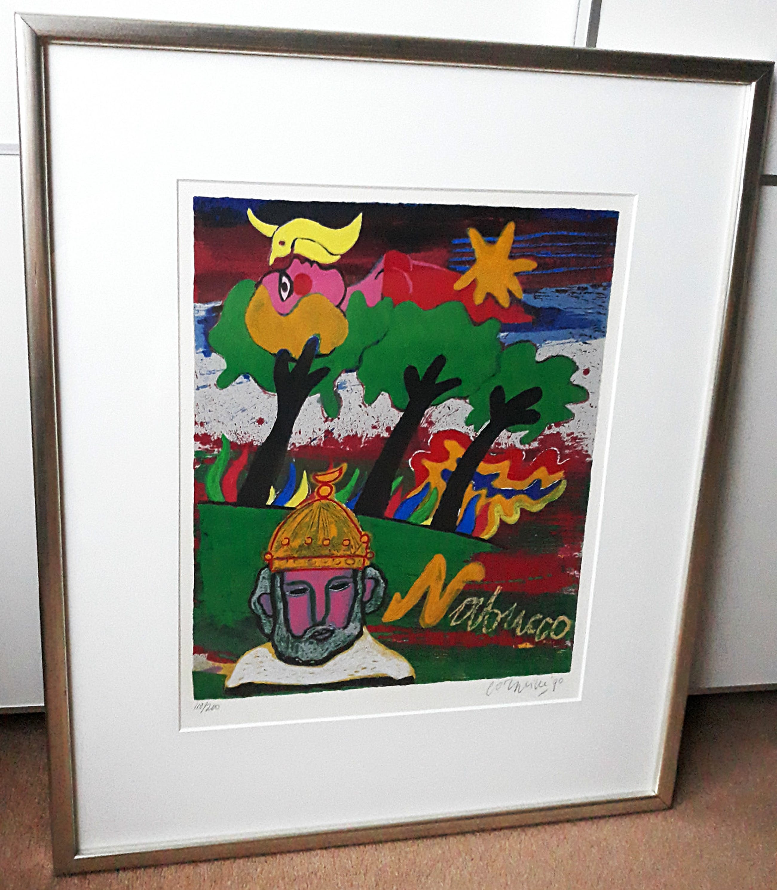 Mooi, herkenbaar werk uit de serie “Ommagio a G. Verdi”. Zeefdruk op 300 grams Eskulan papier, met potlood gesigneerd, gedateerd (‘90) en genummerd (118/200). In prachtige lijst, achter glas en met smetteloos, zuurvrij passe-partout. Alles in uitstekende conditie. Afkomstig uit de kunstcollectie van Price Waterhouse.