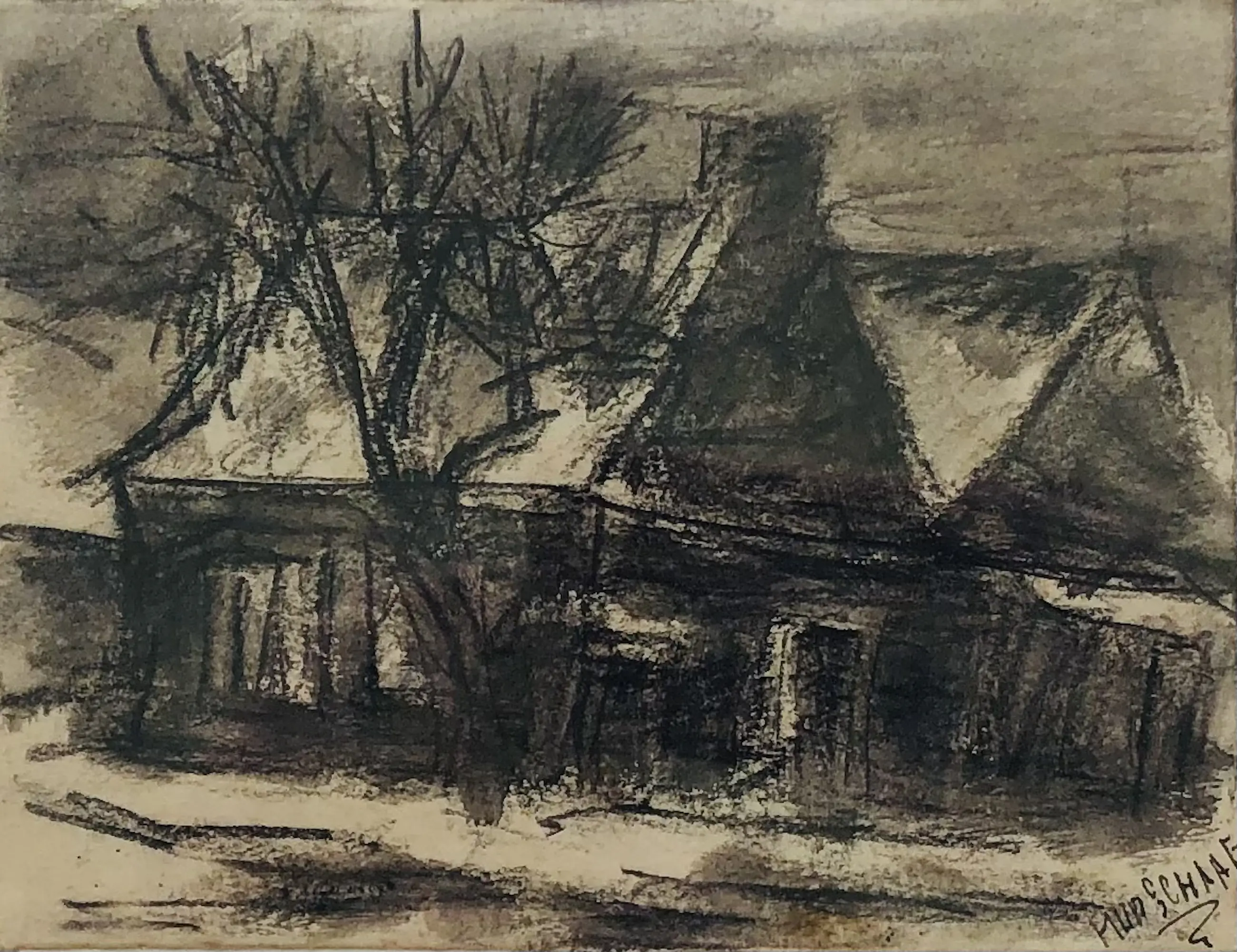 Leuk klein werk van de Nederlandse kunstenaar Hans van der Schaaf.. Gesigneerd in potlood aan de voorkant.