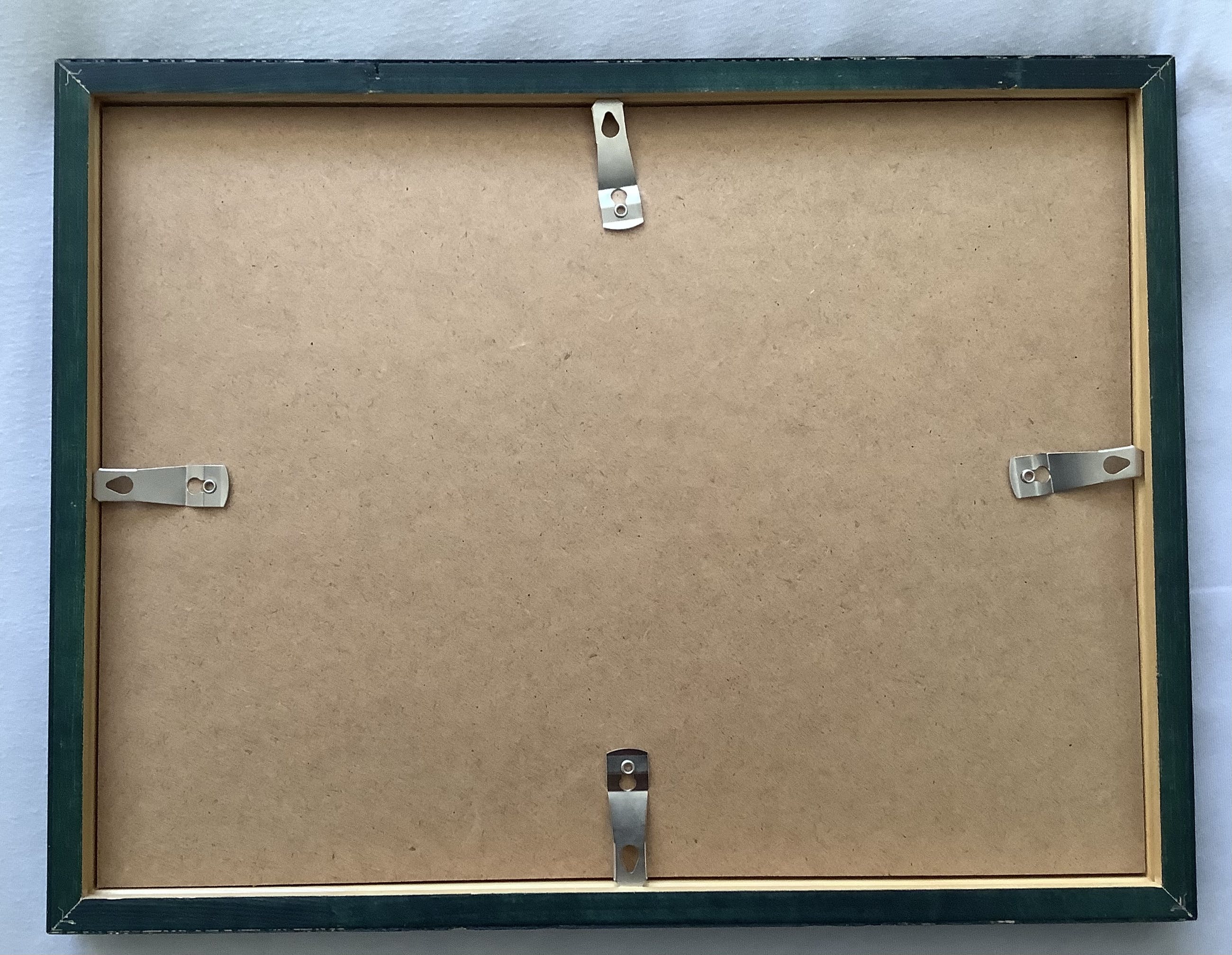 Zeefdruk goed. Lijst eenvoudig zilverkleurig met zwarte zijkant.