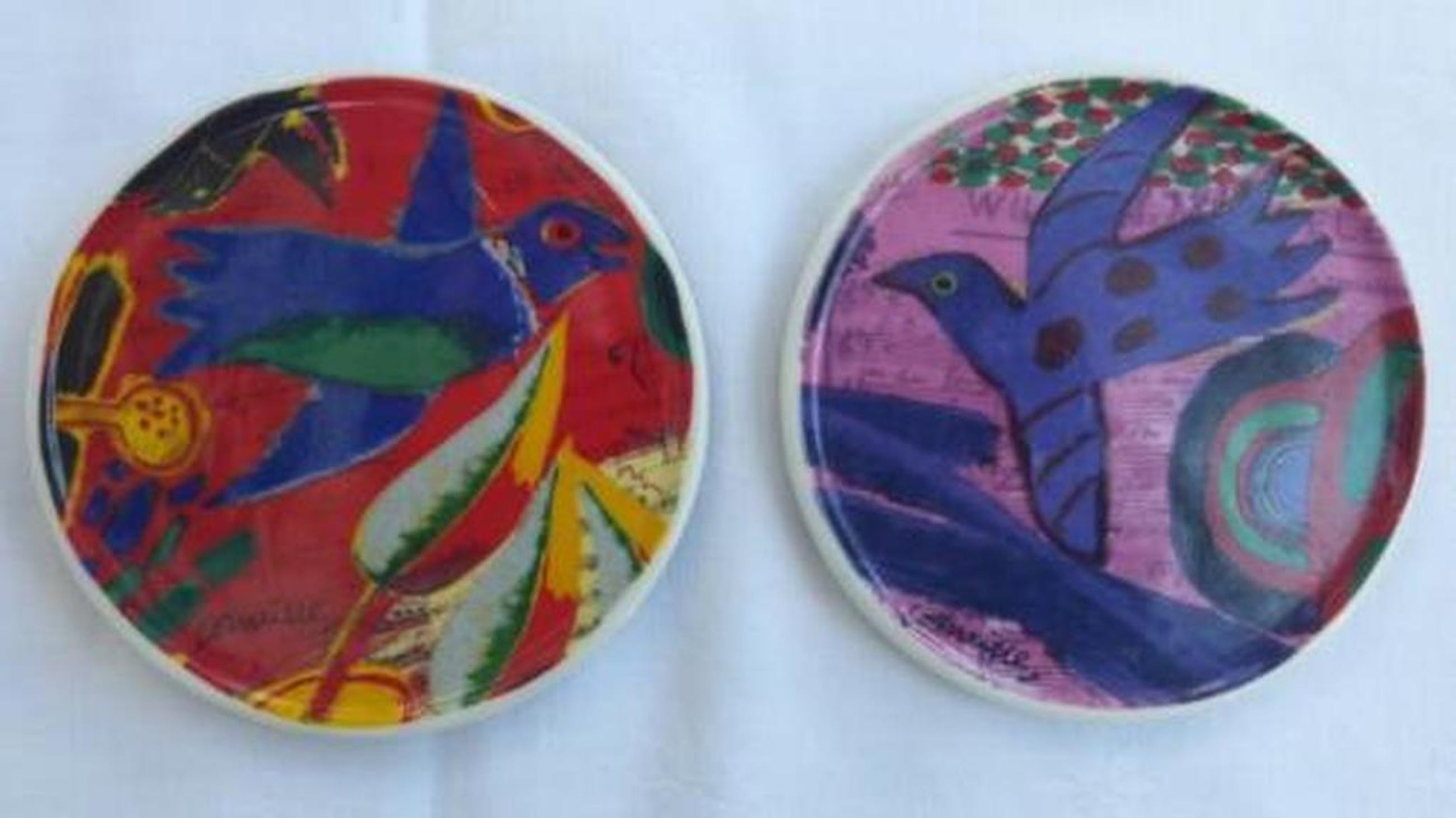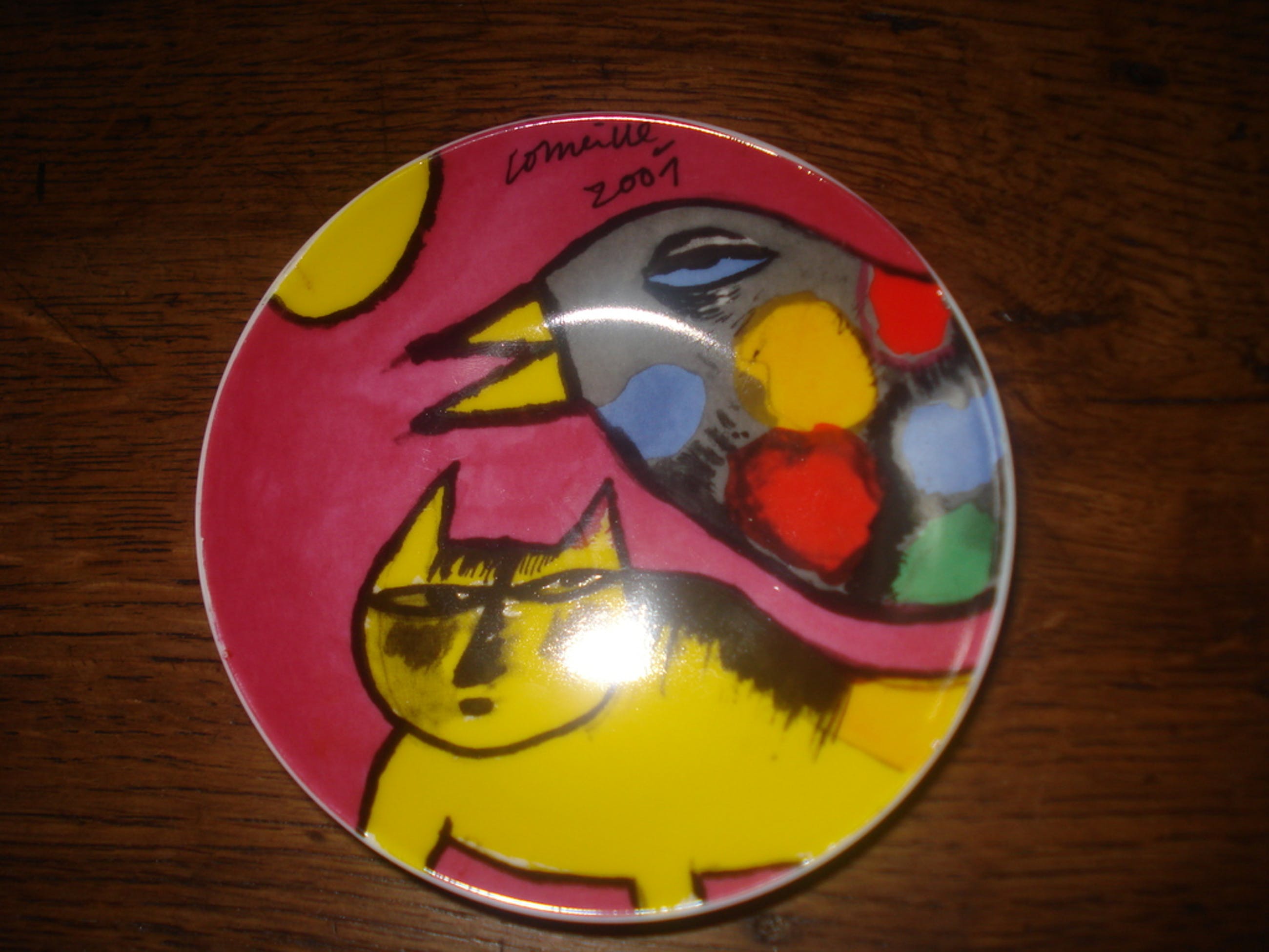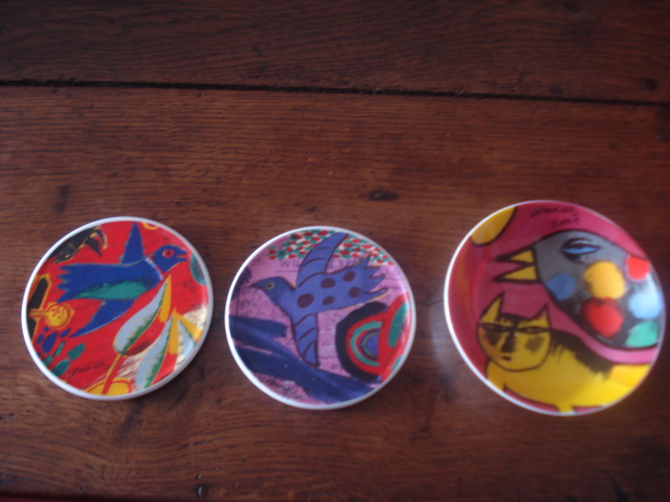 Twee Corneille onderzetters, diameter 10 cm, en 1 schaaltje diameter 12 cm.