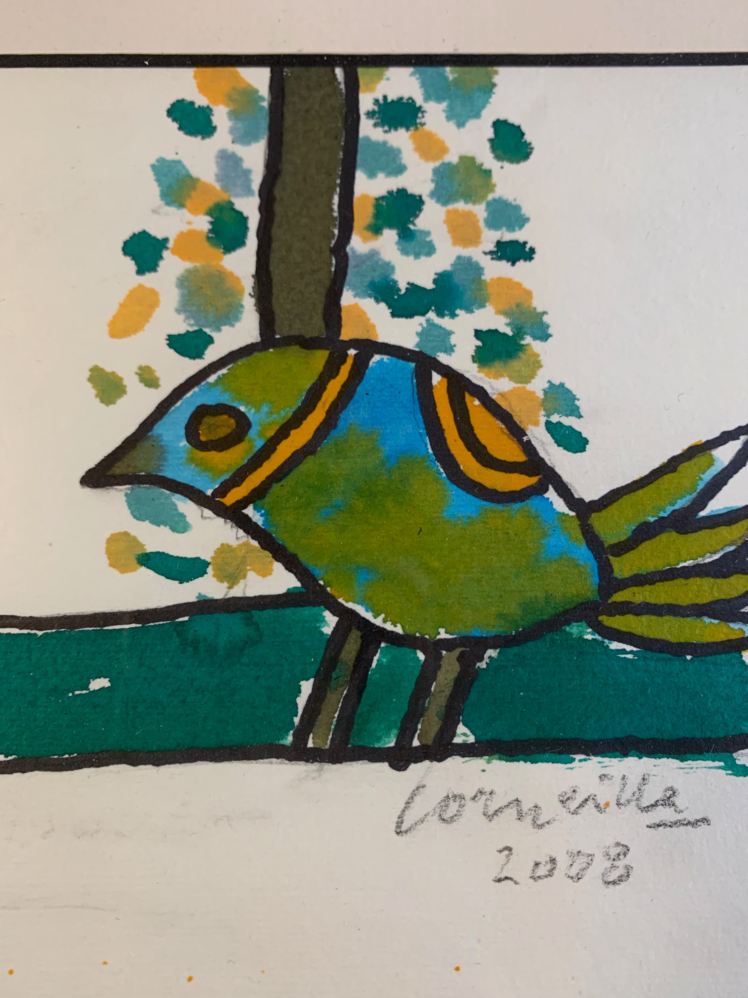 In het spoor van Miro, Matisse of Gauguin, creëert Guillaume Corneille hier een kleurrijk werk tussen figuratie en abstractie.