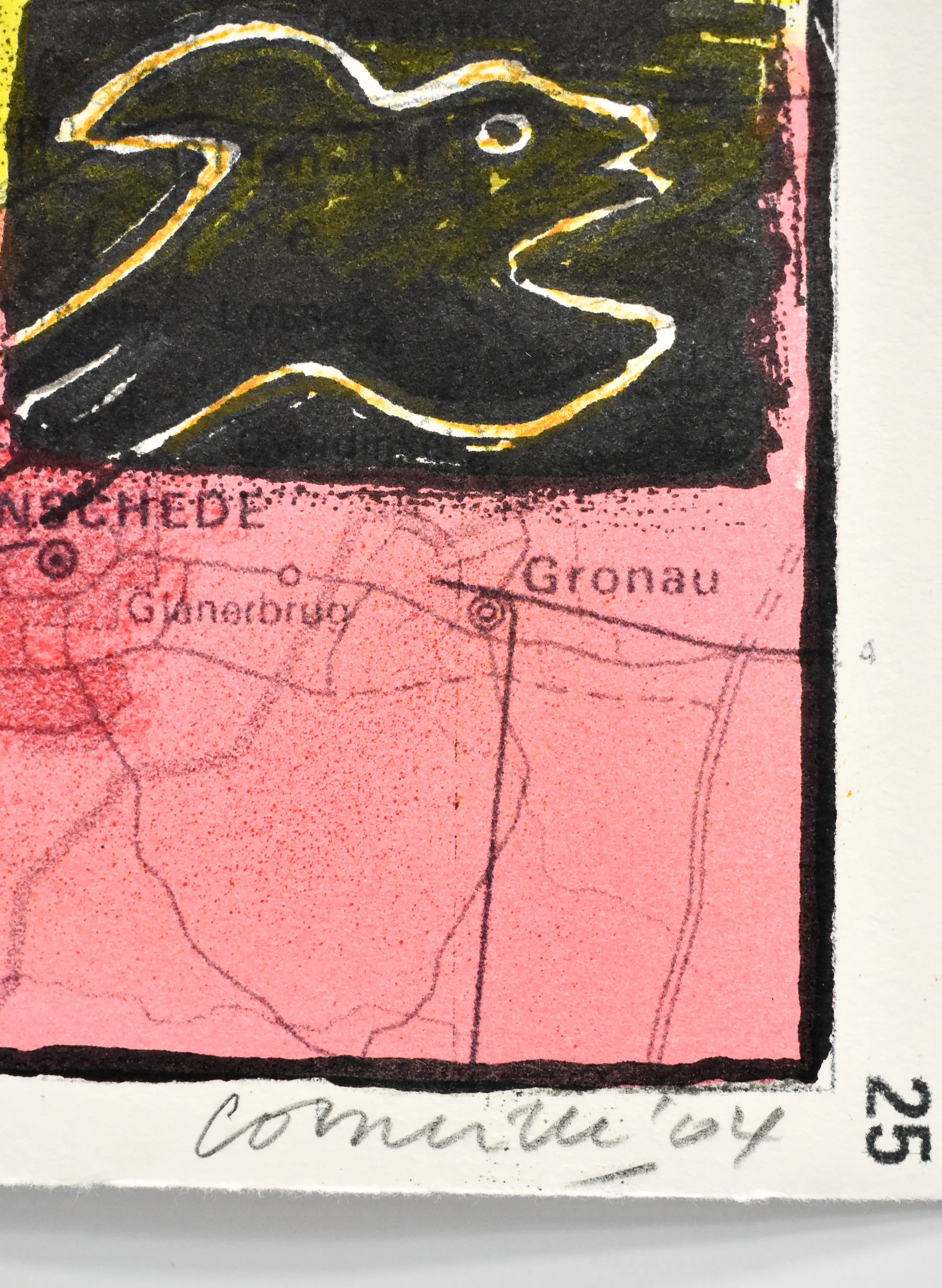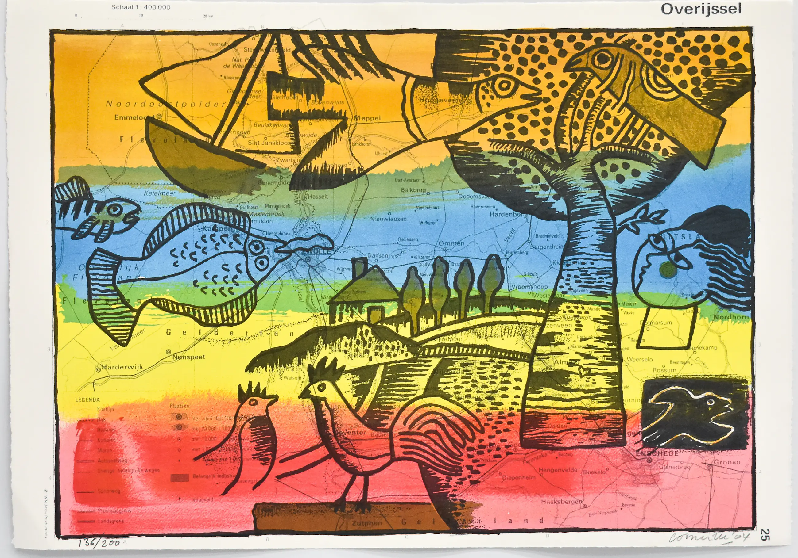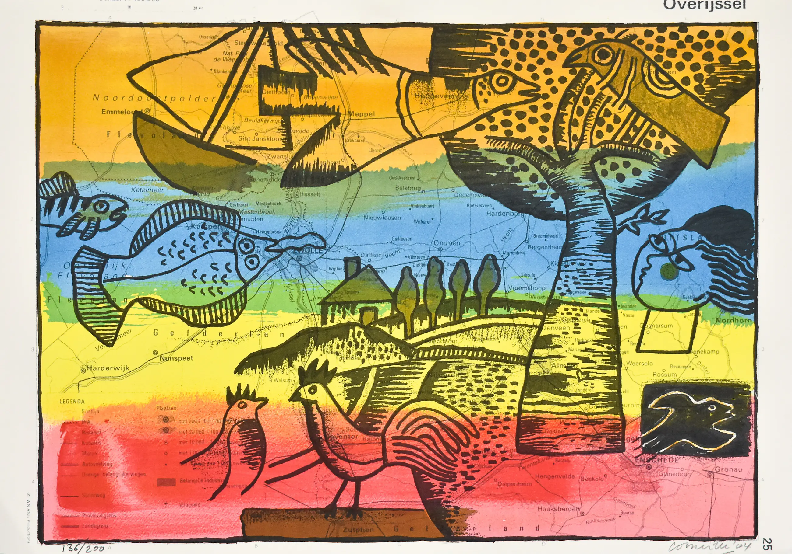 Deze kleurrijke litho getiteld “Overijssel” is een werk van Corneille (1922–2010), een van de medeoprichters van de CoBrA-beweging (samen met o.a. Karel Appel en Constant). Zijn werk kenmerkt zich door levendige kleuren, speelse vormen en terugkerende thema’s als vogels, vrouwen en exotische landschappen.