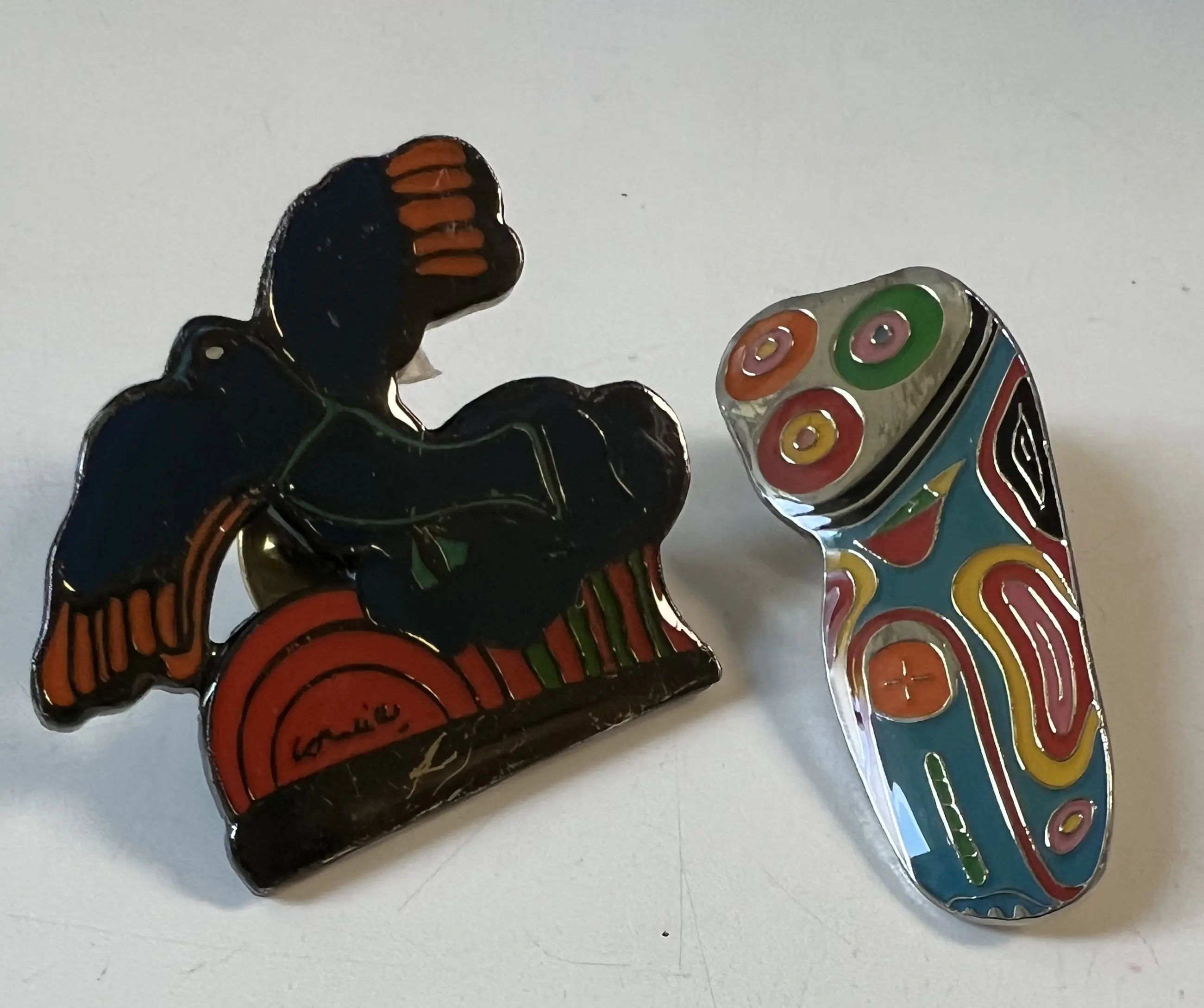 Philips Scheermesspeld in kleur 1996 Afmetingen: 3,5 x 1,5 cm - Zeer goede staat + Blauwe Vogel pin Zeldzaam - Afmetingen : 2,7 x 3,6 cm - Jaren 1990 - Oppervlak met fijne krasjes op één vleugel en op het zwarte gedeelte. Handtekening in de plaat in het hart van de rode regenboog