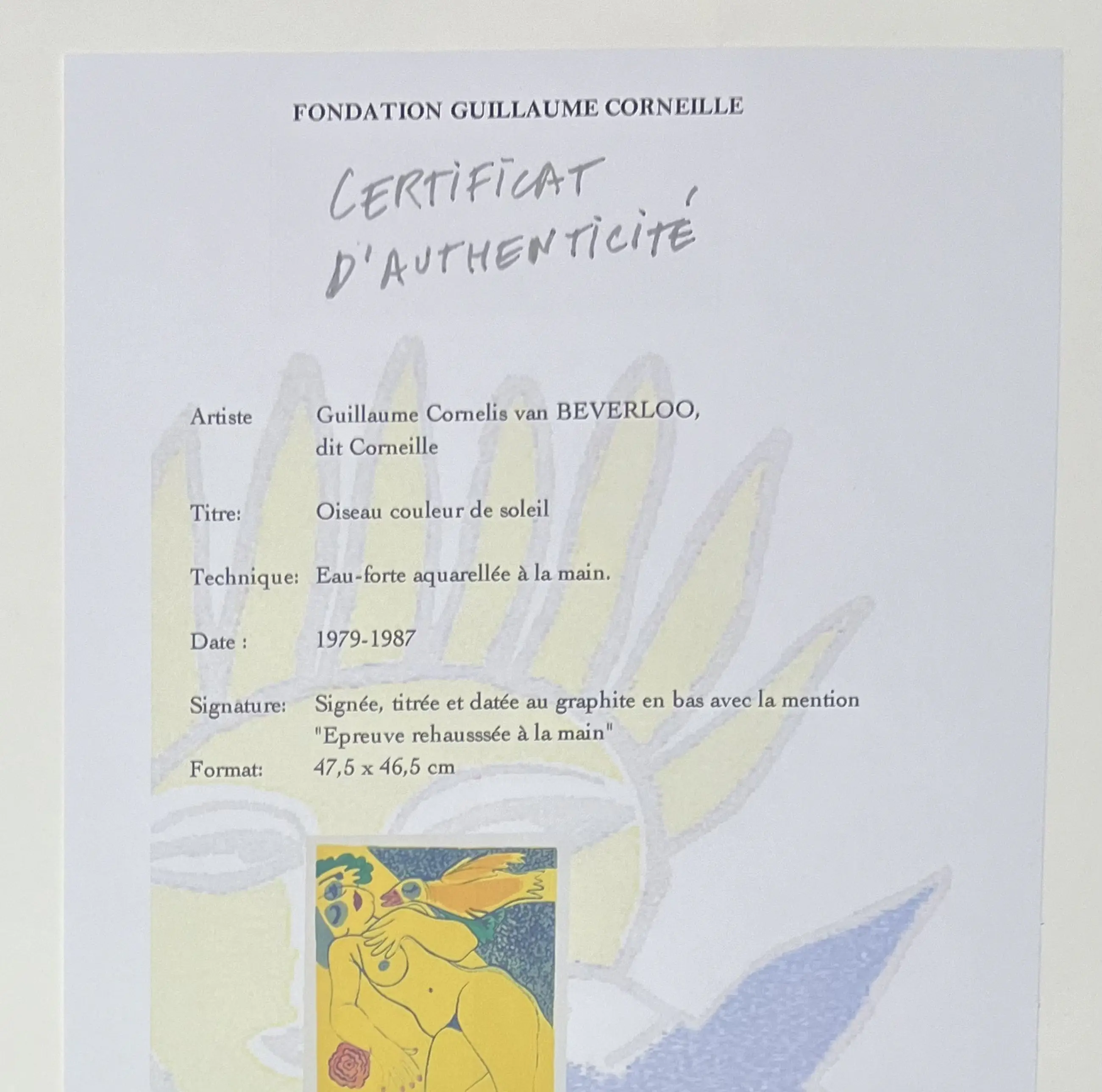 Uniek stuk. Antieke aquarel ets geleverd met een certificaat van echtheid van de Fondation Guillaume Corneille. Kunstenaarsexemplaar EA, 1979, ingekleurd door de schilder in 1987. Onderaan gesigneerd, getiteld en gedateerd in grafiet door de schilder.