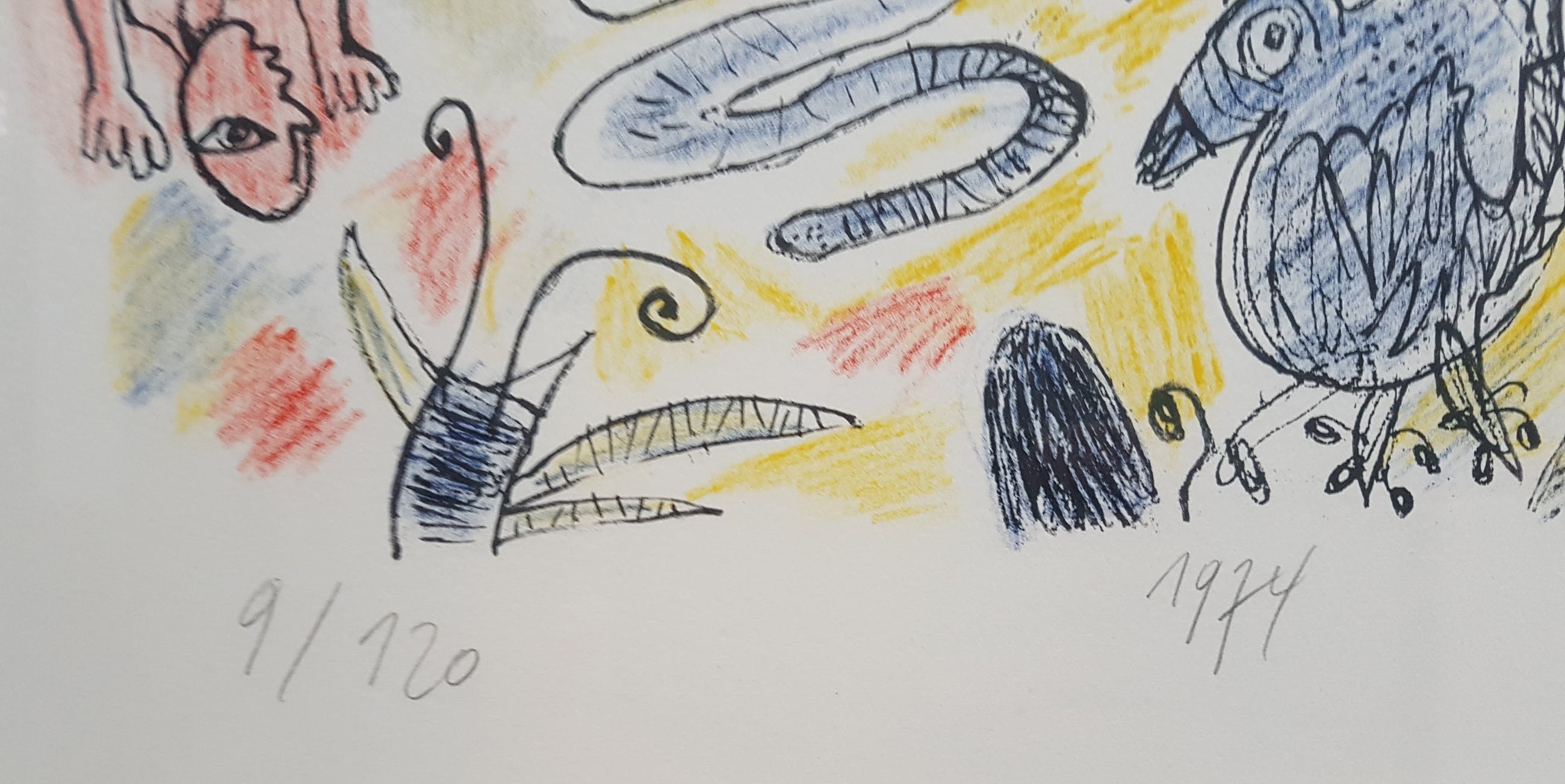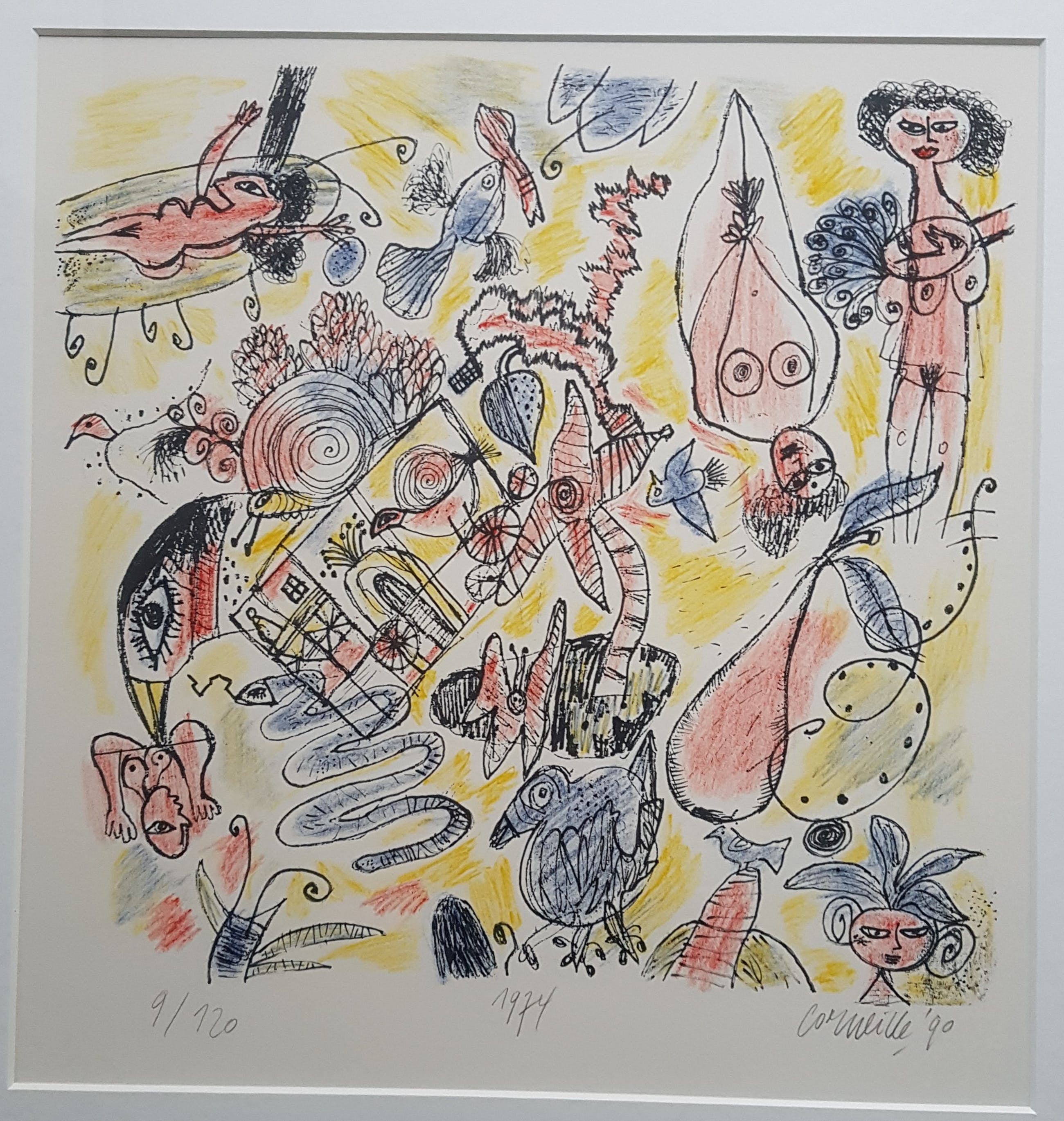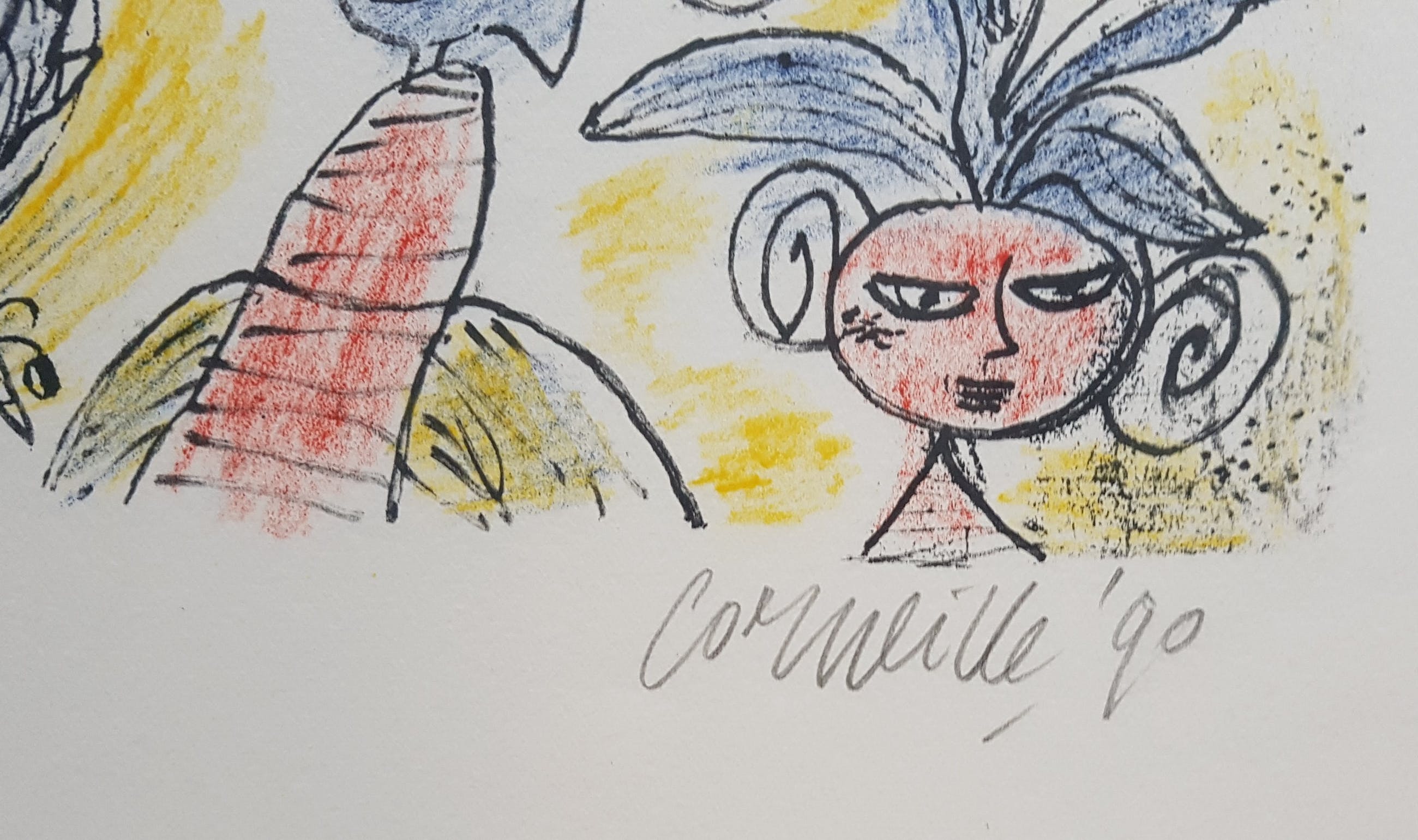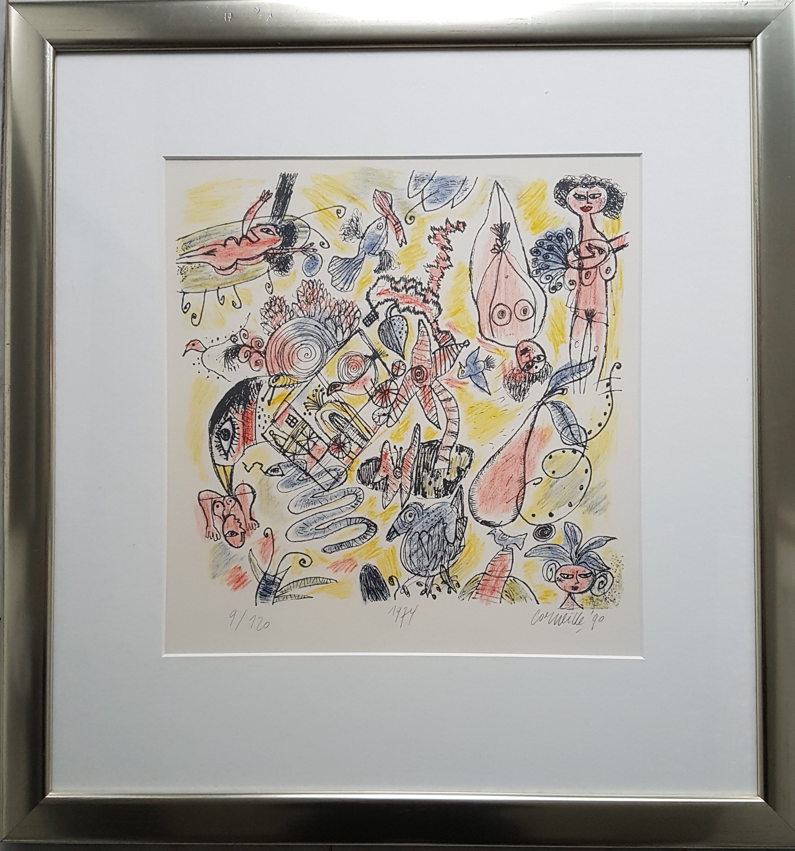 Corneille Prachtige litho van Corneille Titel : Vrouw met vogels Luxe zilveren omlijsting en onder zuurvrij passepartoutAfmeting van de litho is +/- 50*50 cm en de lijst is 75x75 cm Gesigneerd rechtsonder en links onder nummering 9/120 (oplagenummer 9 van 120) gedateerd 1990 Deze litho is in 1990 gedrukt - de originele tekening komt uit 1974