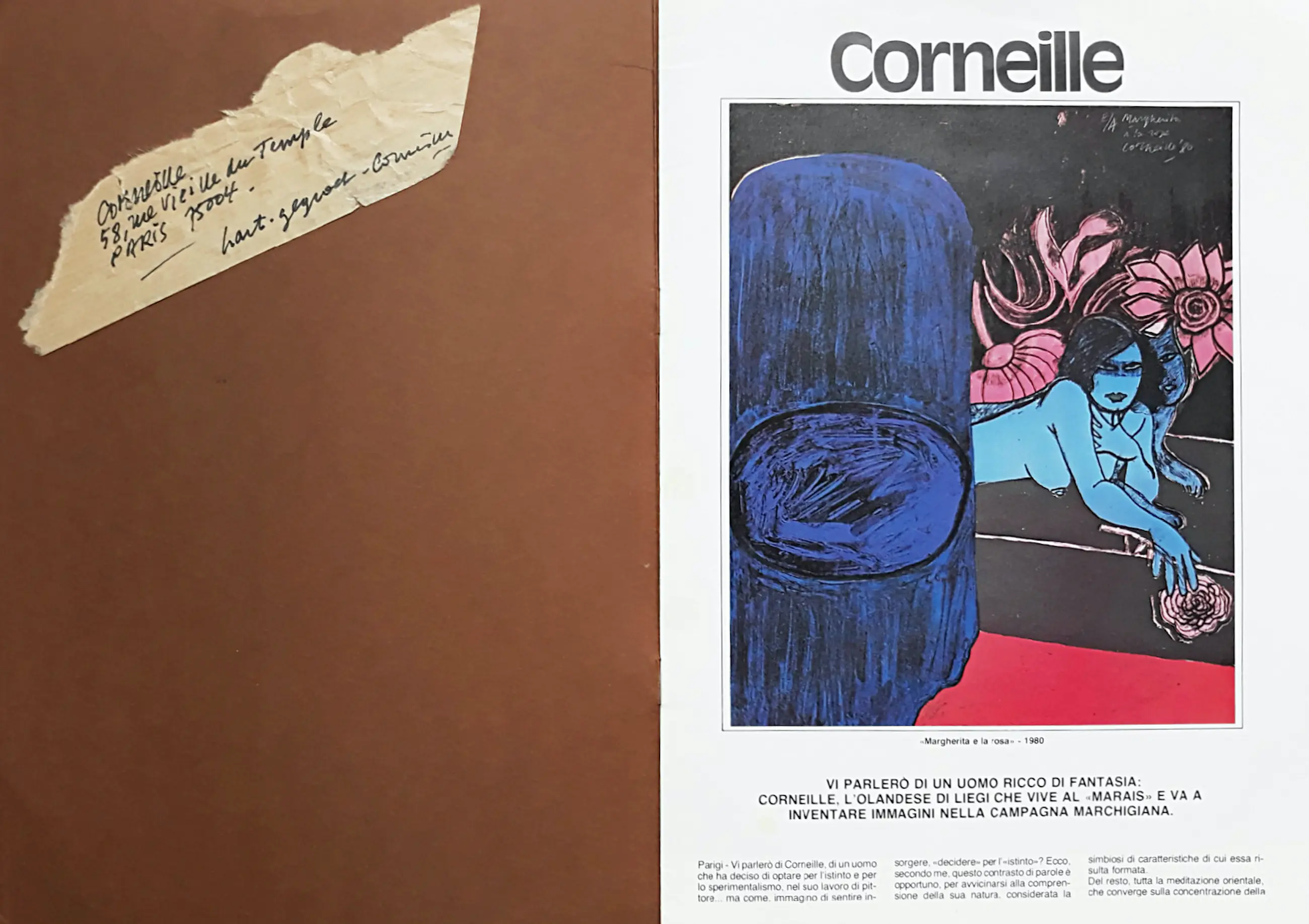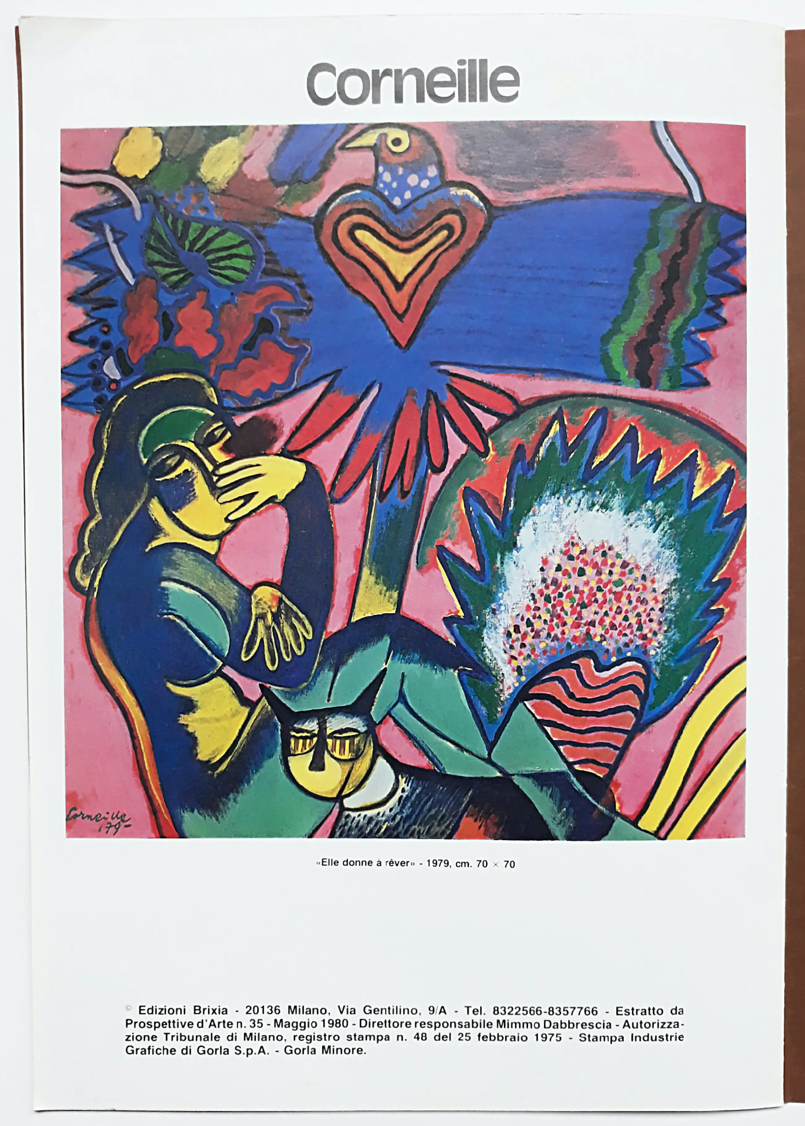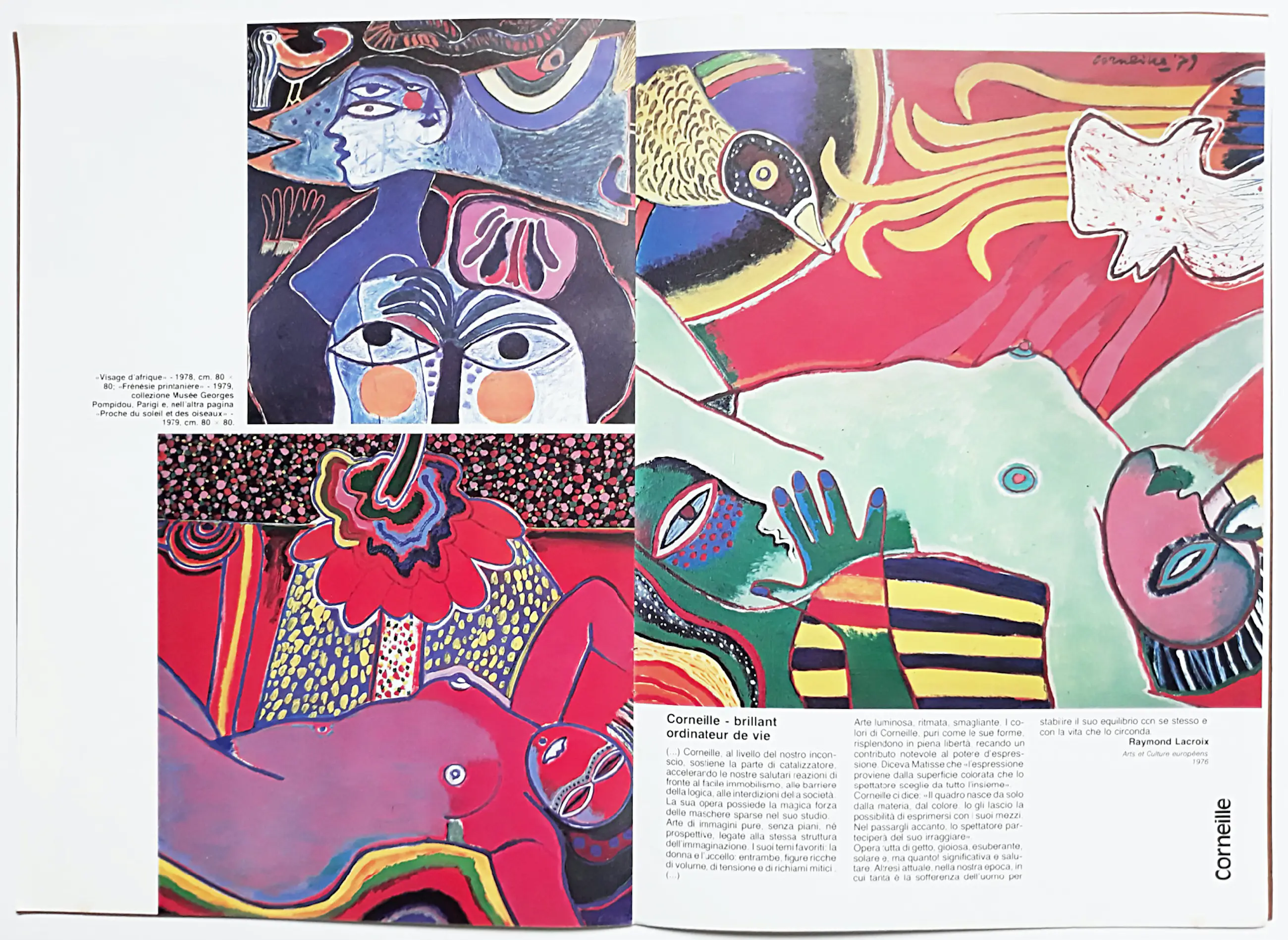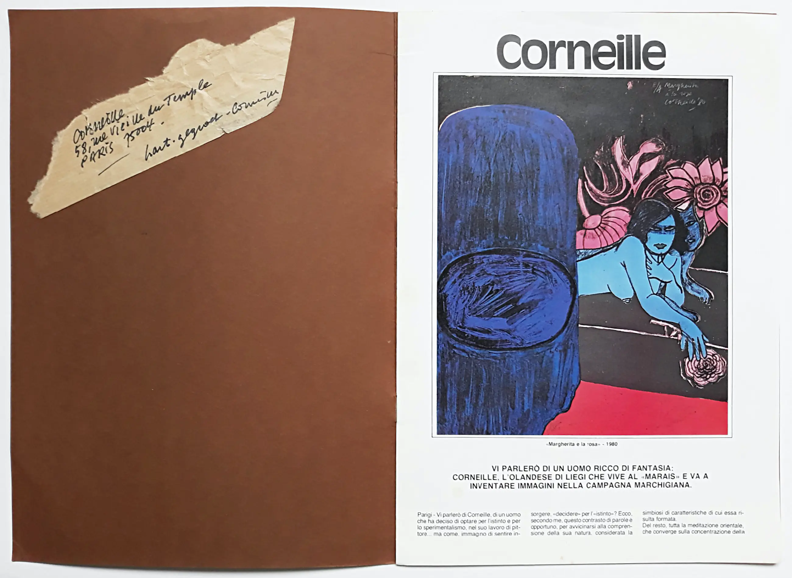 Italiaanse publicatie uit 1980 met veel foto’s van Corneille en zijn werk. Als bonus is dit exemplaar gesigneerd door Corneille, inclusief zijn adres in Parijs en met “hart. gegroet”. In goede conditie, slechts lichte verkleuring van de omslag en een paar kleine vlekjes op sommige bladzijden.