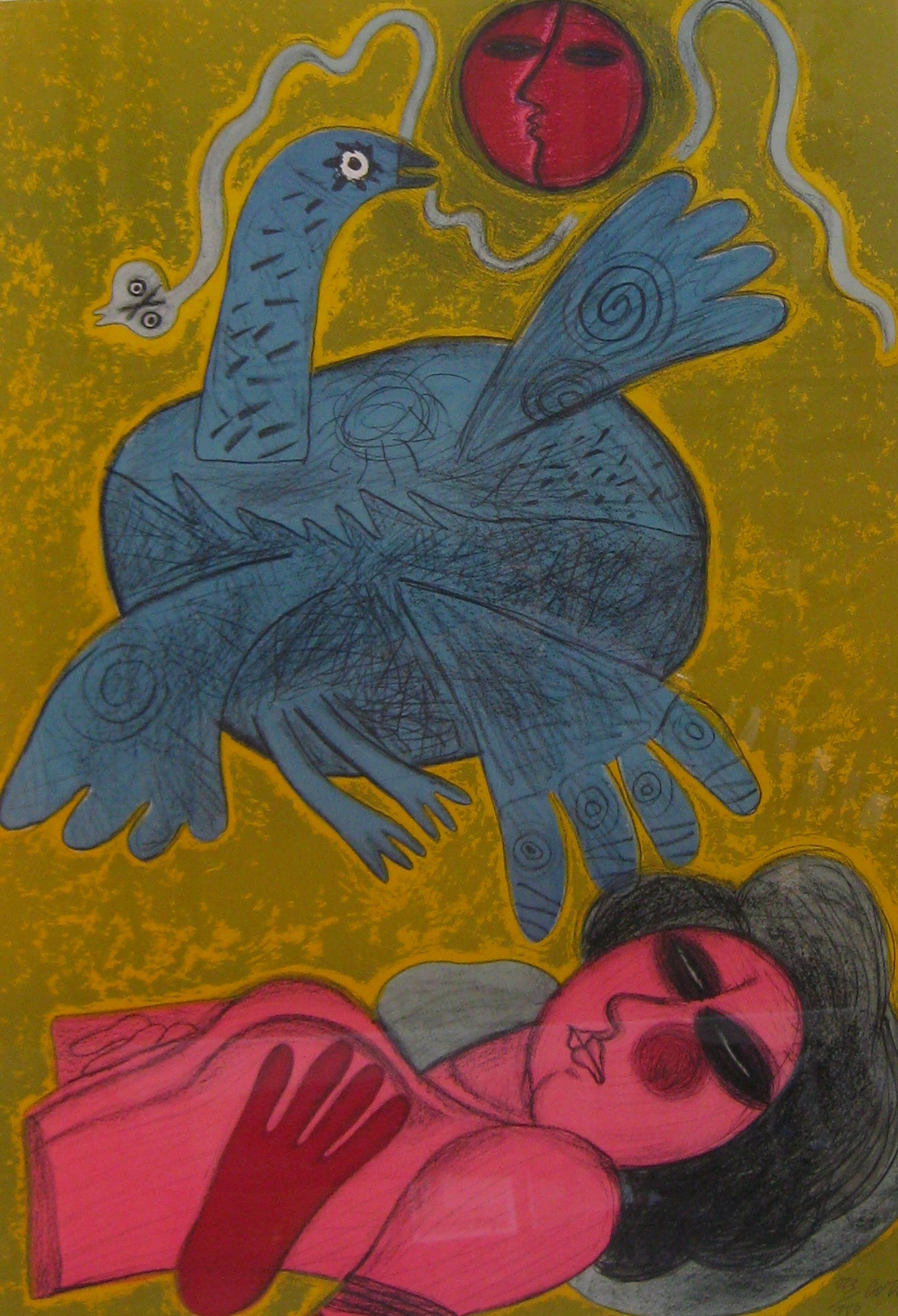 thema de vrouw met daarnaast of daarboven, de gedaante van een vogel die