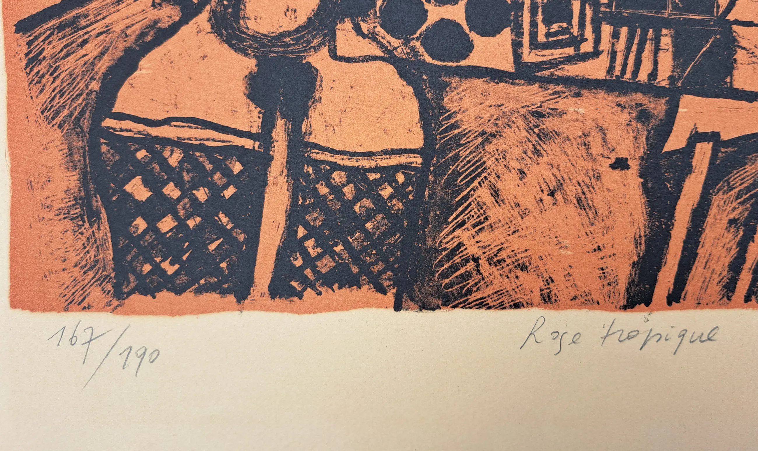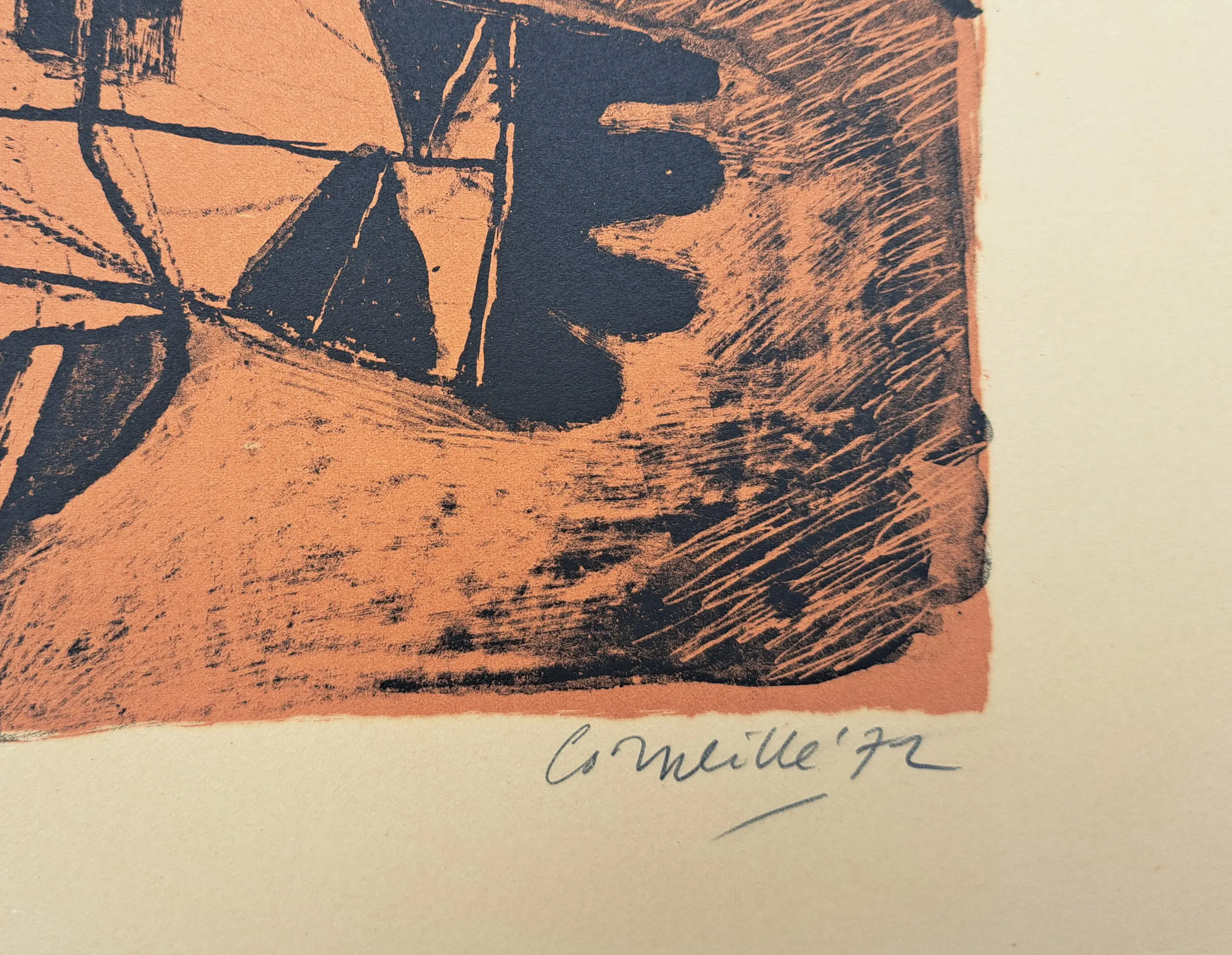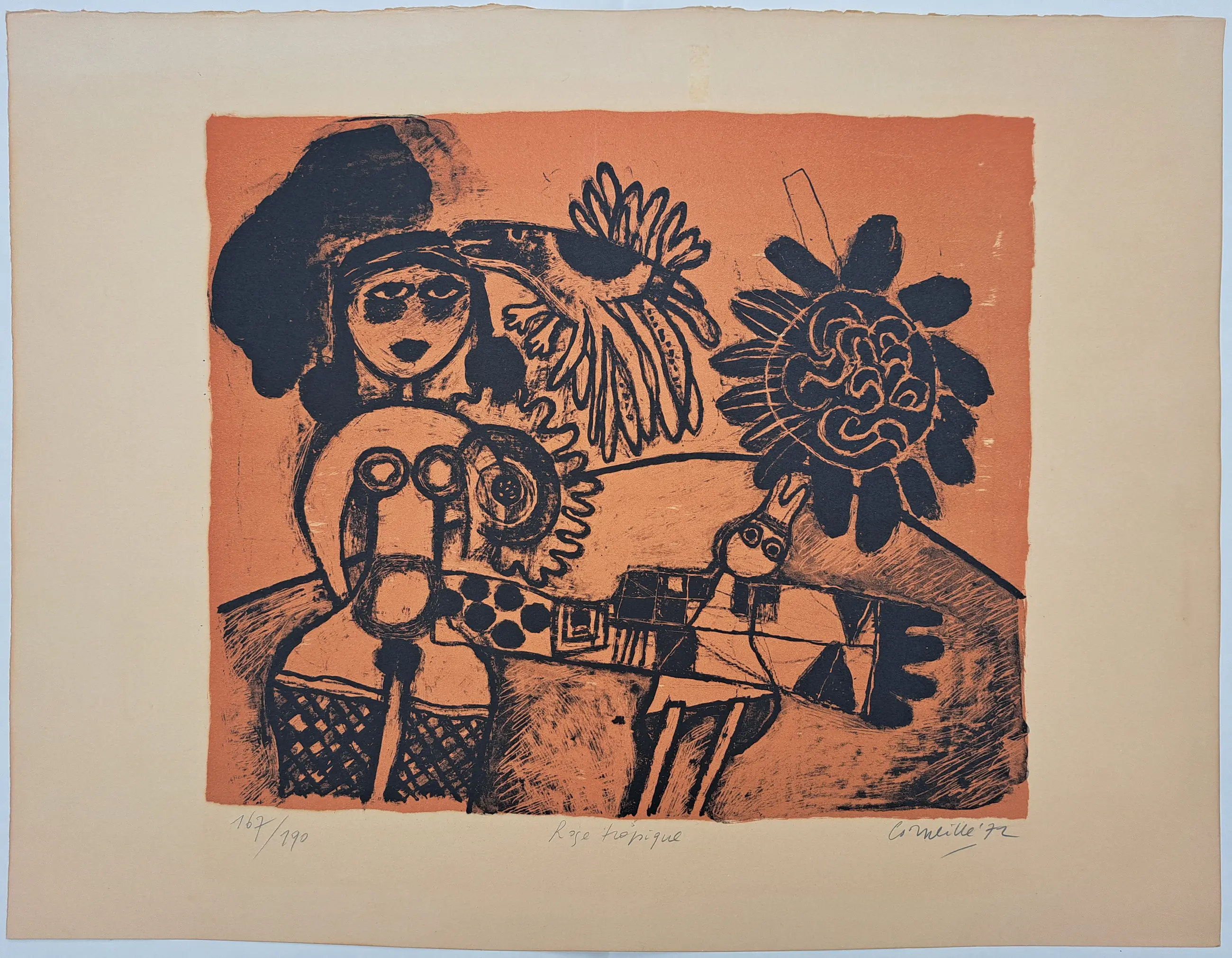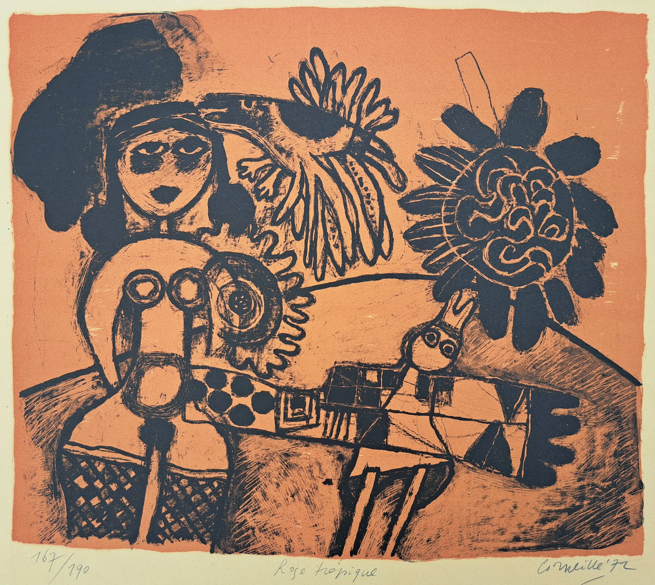 Originele kleurenlithografie van Corneille (Guillaume Cornelis van Beverloo) uit 1972, getiteld "Rose Tropique". Dit werk maakt deel uit van de bekende reeks 'Prent 190', een initiatief dat kwaliteitsgrafiek van belangrijke hedendaagse kunstenaars toegankelijk maakte voor een breder publiek. Het blad is rechtsonder met potlood handgesigneerd door de kunstenaar en gedateerd ('72). Linksonder is het werk genummerd 167 uit een oplage van 190 exemplaren.