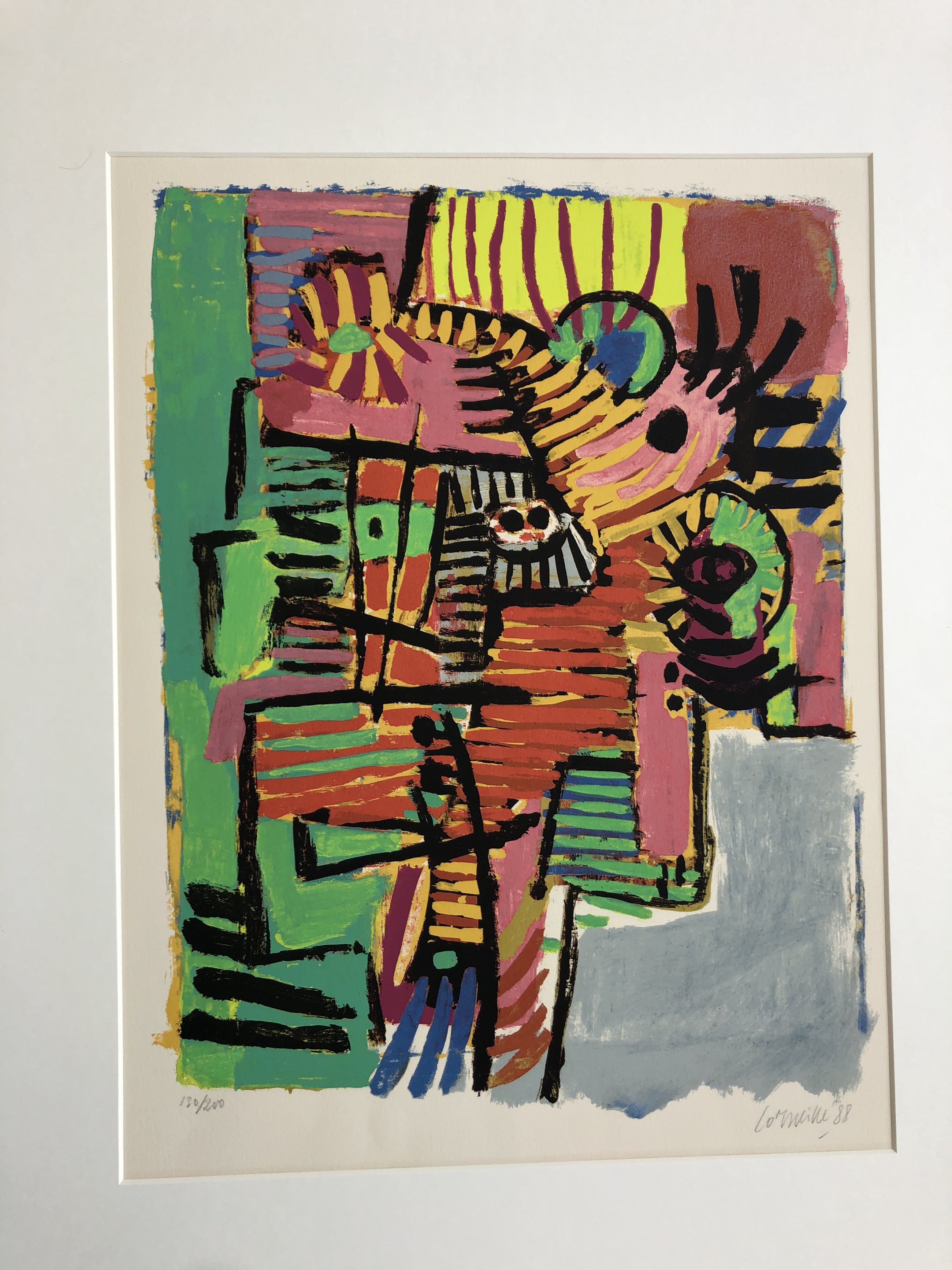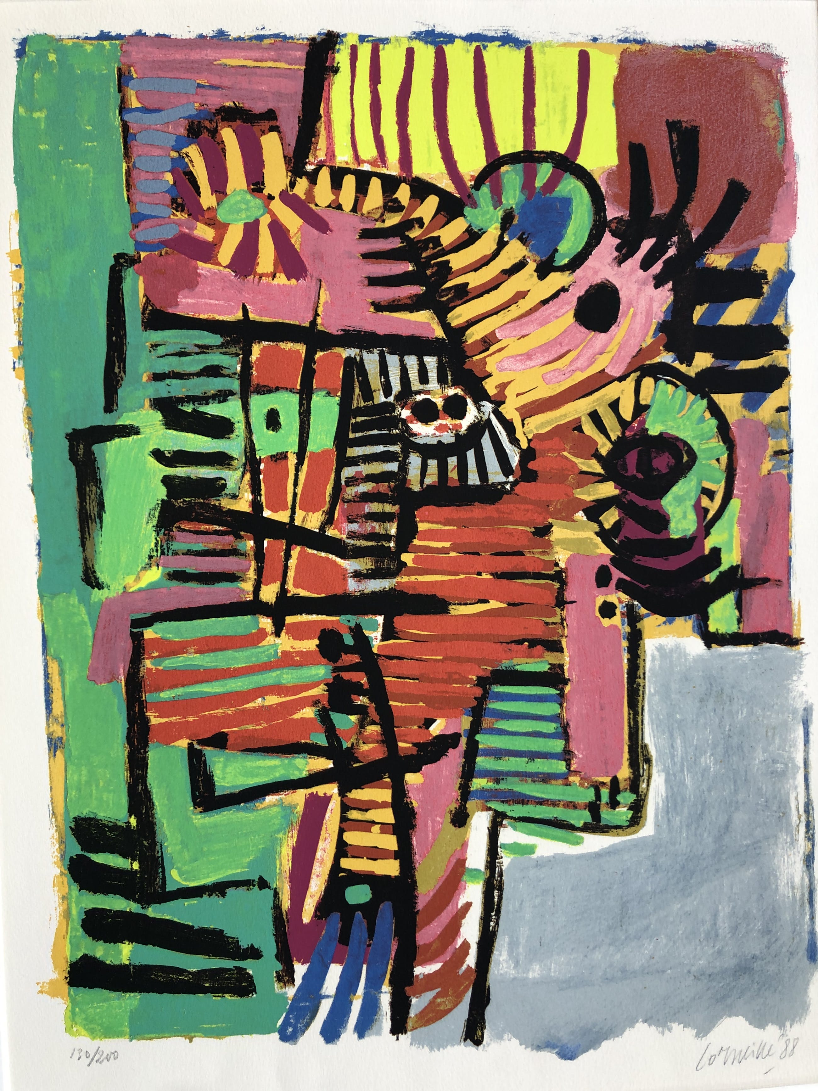 Een kleurrijk werk van Corneille . Het werk is ingelijst (niet nieuw maar nette lijst) en kan zo worden opgehangen aan de muur. Gesigneerd en genummerd door de meester.