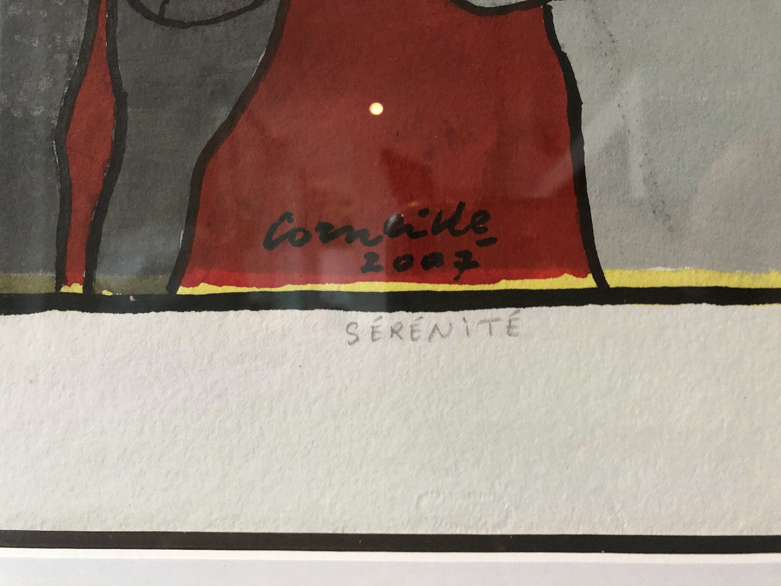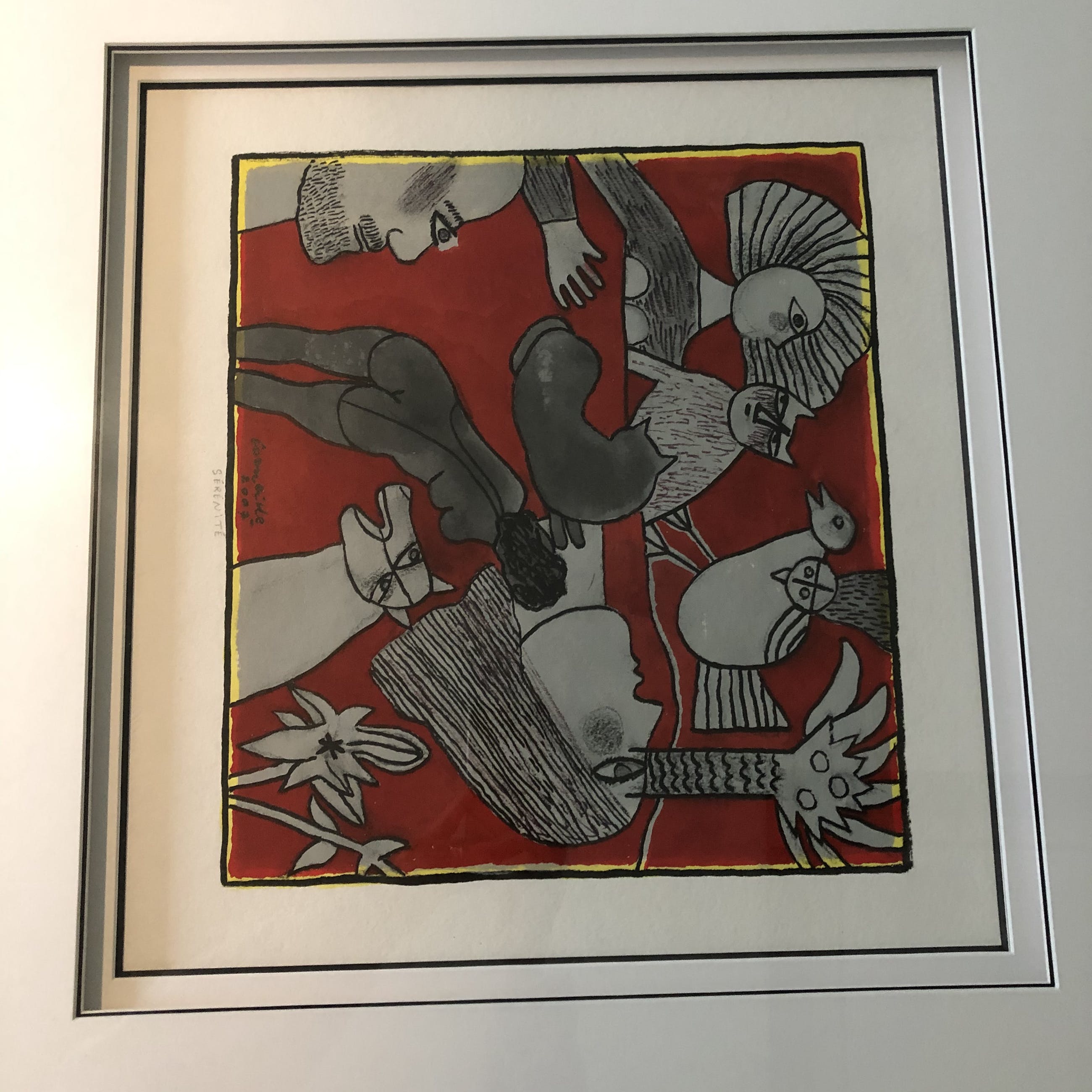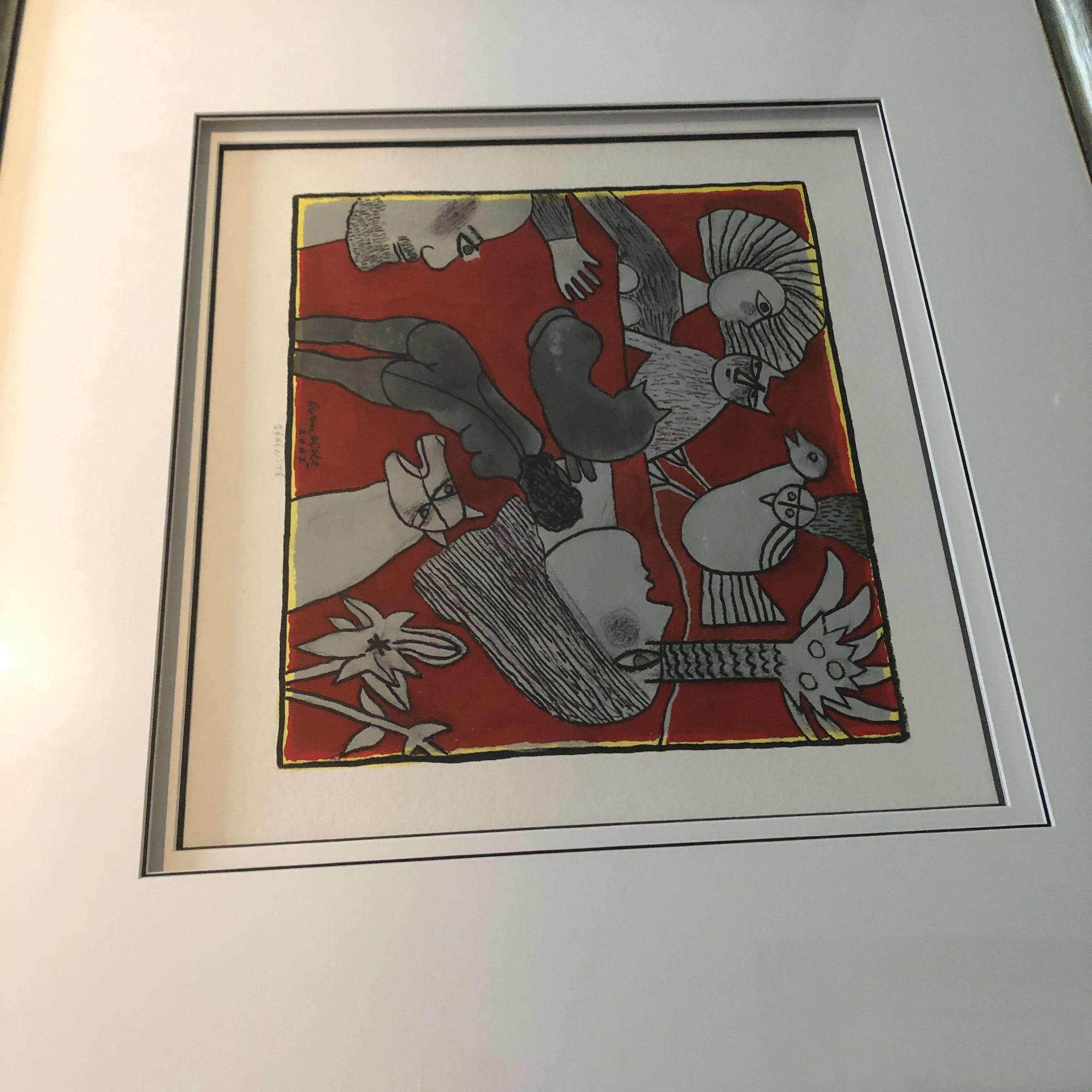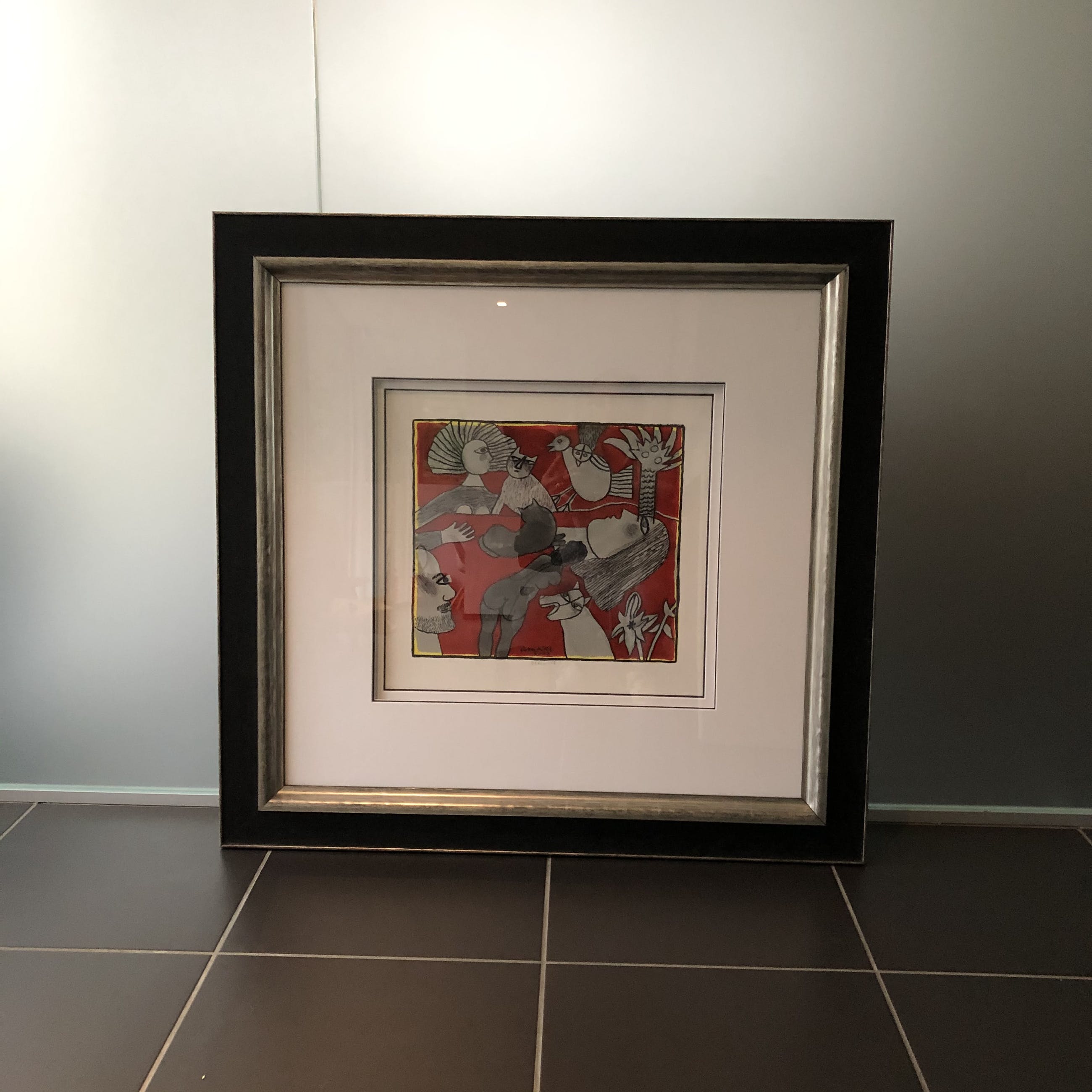 Prachtig werk. Originele gouache en tekening op papier, gedateerd en gehandtekend. Kleuren rood en zilver. Figuratief.