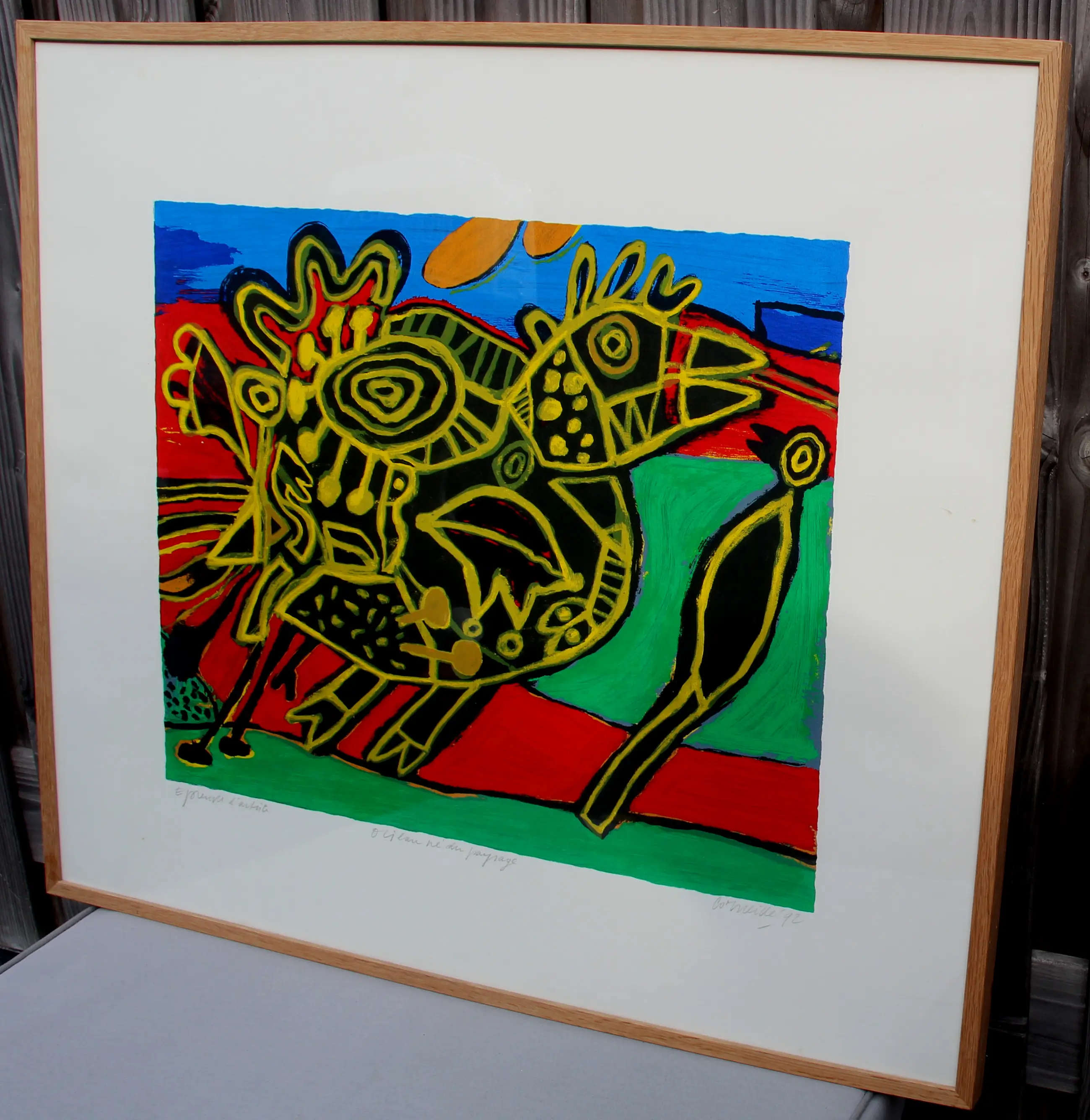 Ingelijste zeefdruk van Corneille. Titel: Oiseau né du paysage. Jaar: 1992. Oplage: epreuve d'artiste. Afmetingen incl lijst: H78 x b89cm. Afmetingen voorstelling: H50 x b60cm. Het werk is rechts onderaan, gesigneerd door de kunstenaar. De authenticiteit van het aangeboden werk wordt volledig gegarandeerd. Een certificaat van echtheid kan, op aanvraag, worden gemaild.