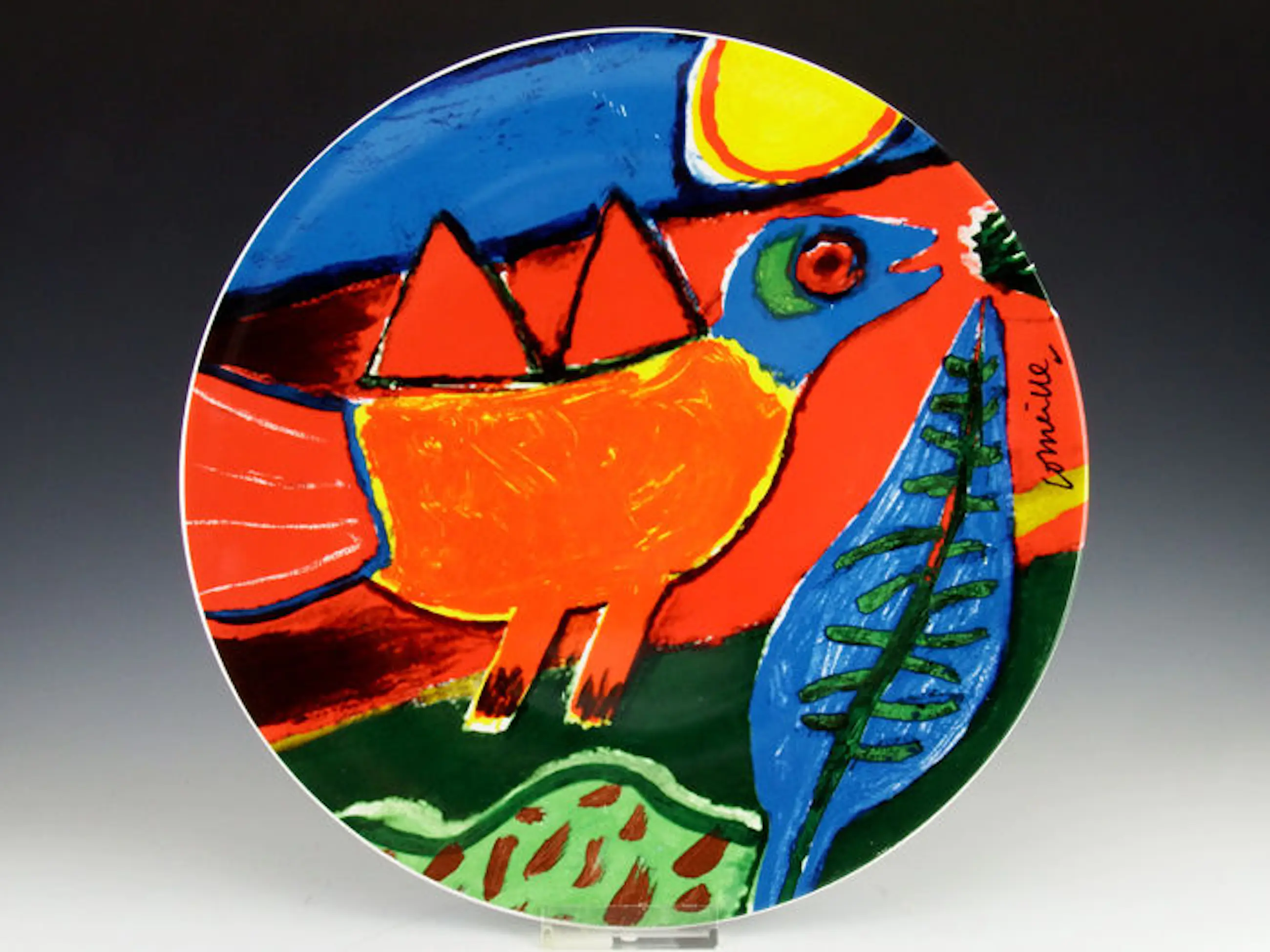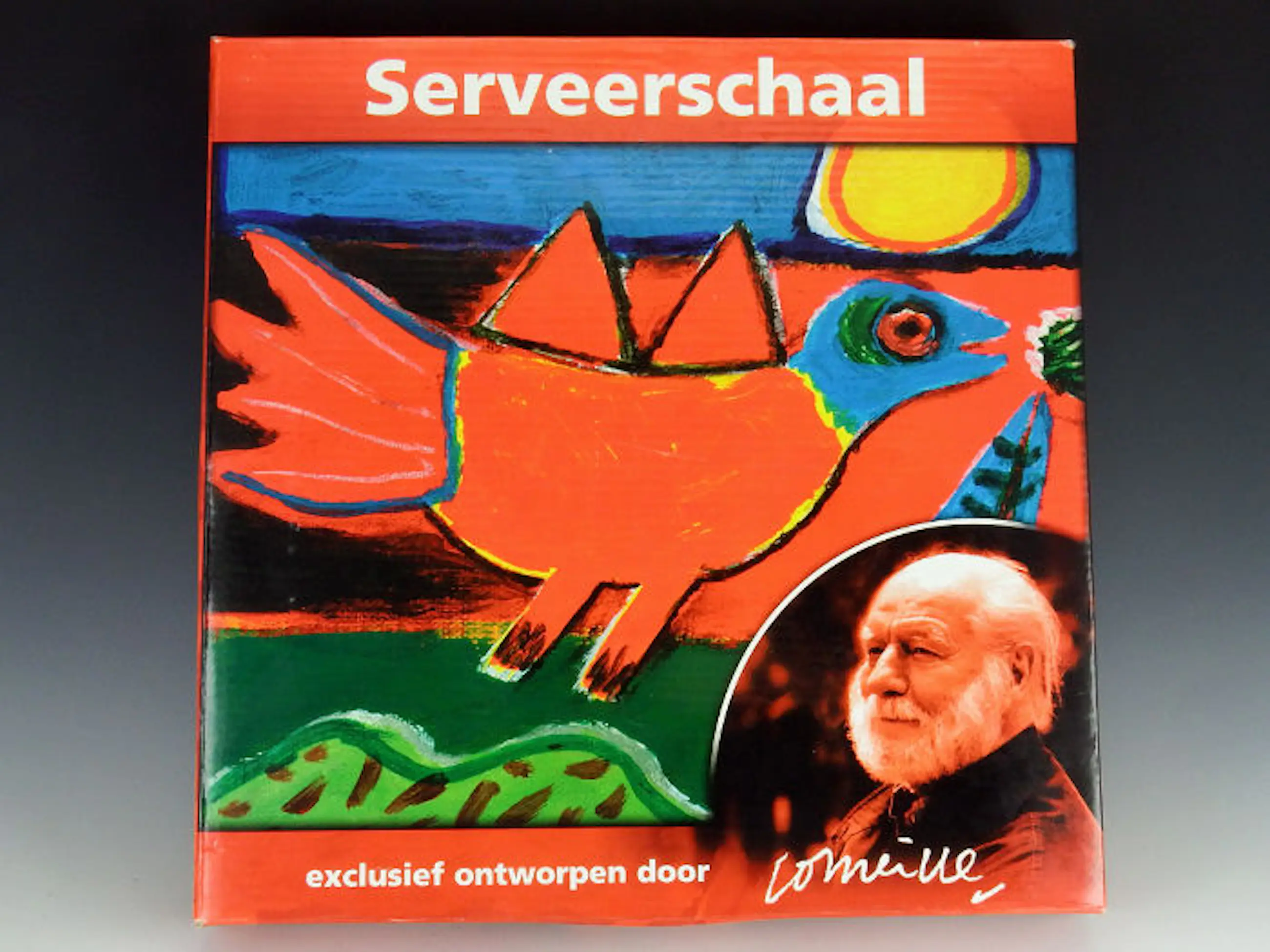 Een keramische serveerschaal, gedecoreerd met een geliefd onderwerp van Corneille: een vogel. Deze veelkleurige schaal is zowel op de voorzijde als de achterzijde gesigneerd en wordt geleverd inclusief de originele doos met extra informatie over Corneille. Dit bord is een goed voorbeeld van wat Corneille heeft gemaakt vanaf de jaren '60 tot aan het einde van zijn carrière. zie afbeeldingen voor eigen indruk. Onbeschadigd en in nieuwstaat.