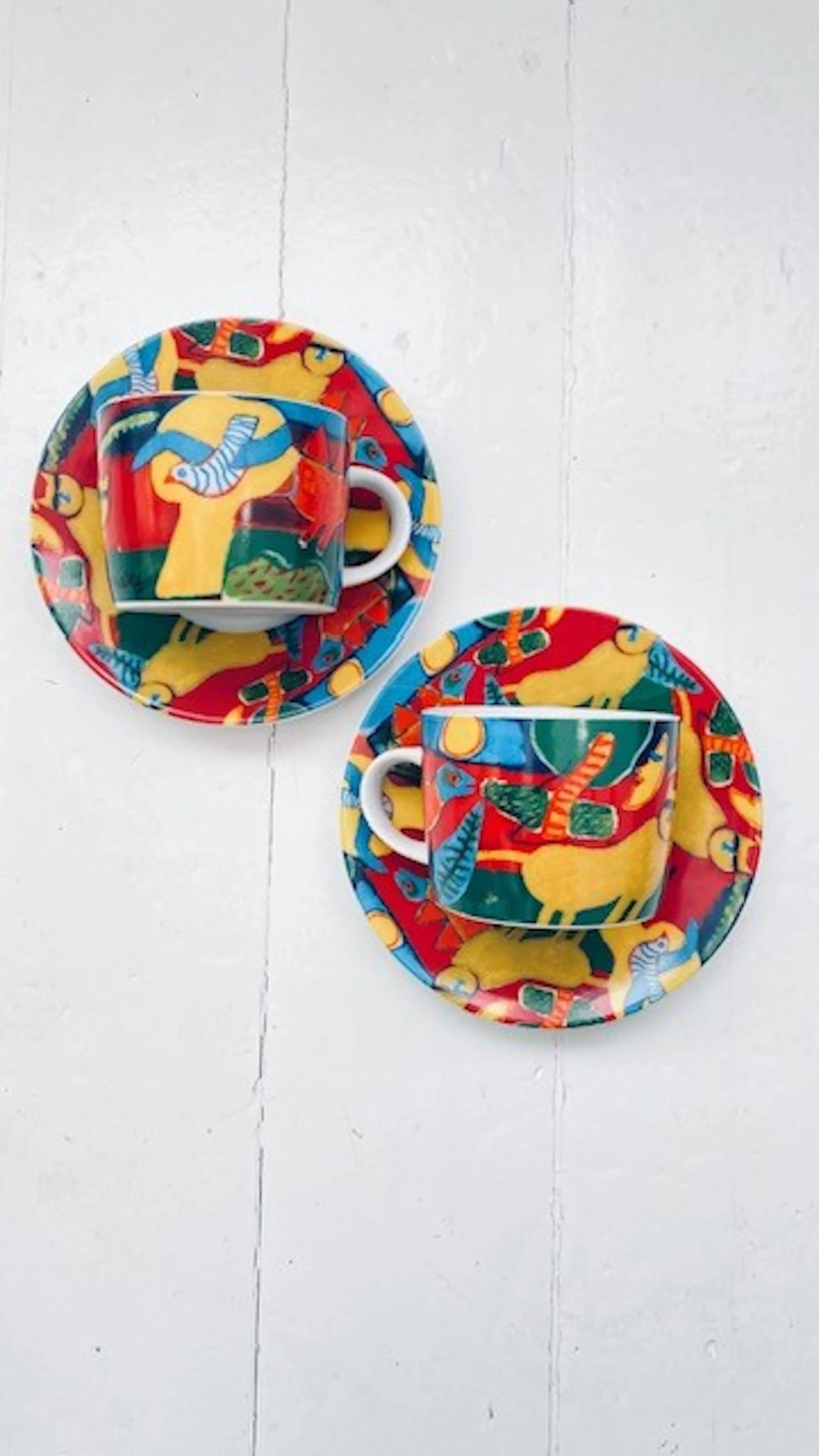 Corneille - set van 2 kop en schotels (porselein) in kleurrijk diermotief
