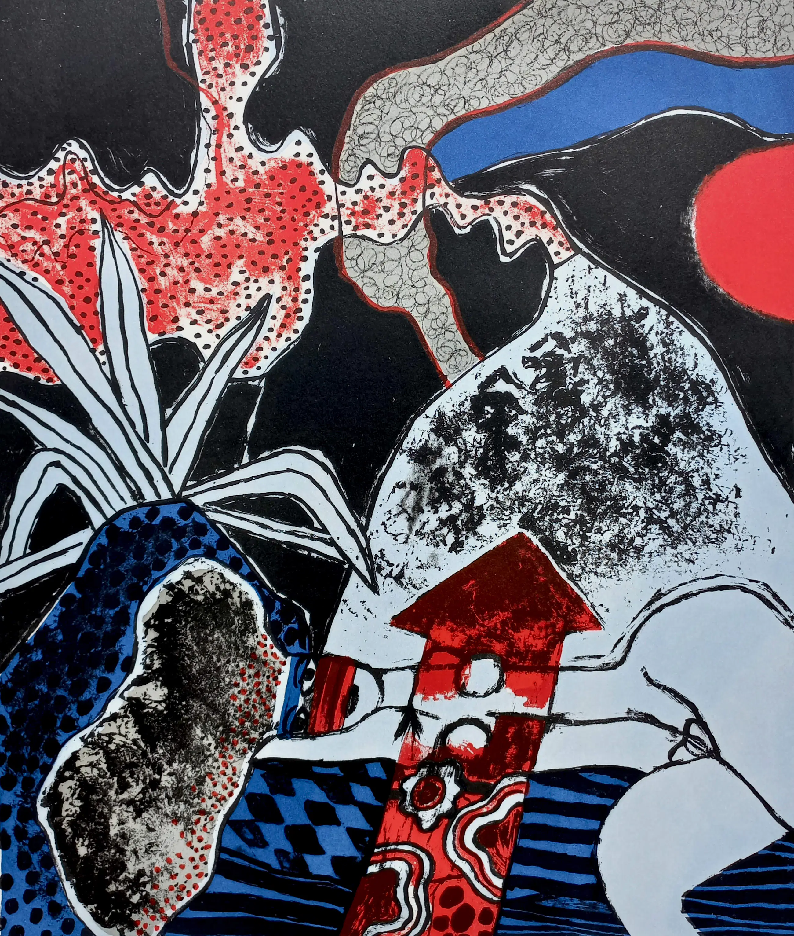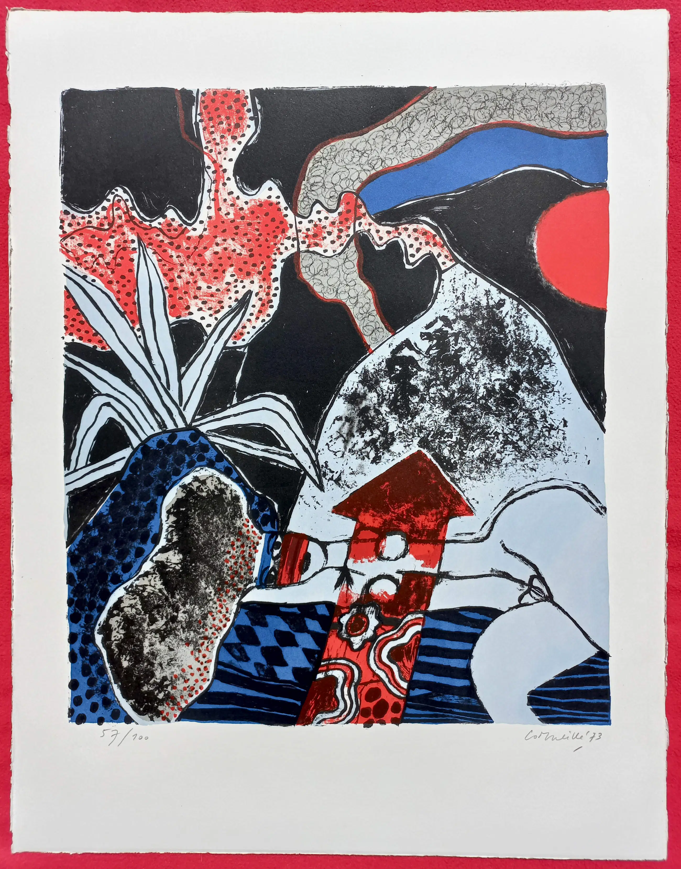 Mooi, karakteristiek werk van Corneille uit de uitgave Ollintonatiuh. Litho op Hahnemühle papier, met potlood gesigneerd, gedateerd (‘73) en genummerd (57/100). In uitstekende conditie. Literatuur: Donkersloot 331.