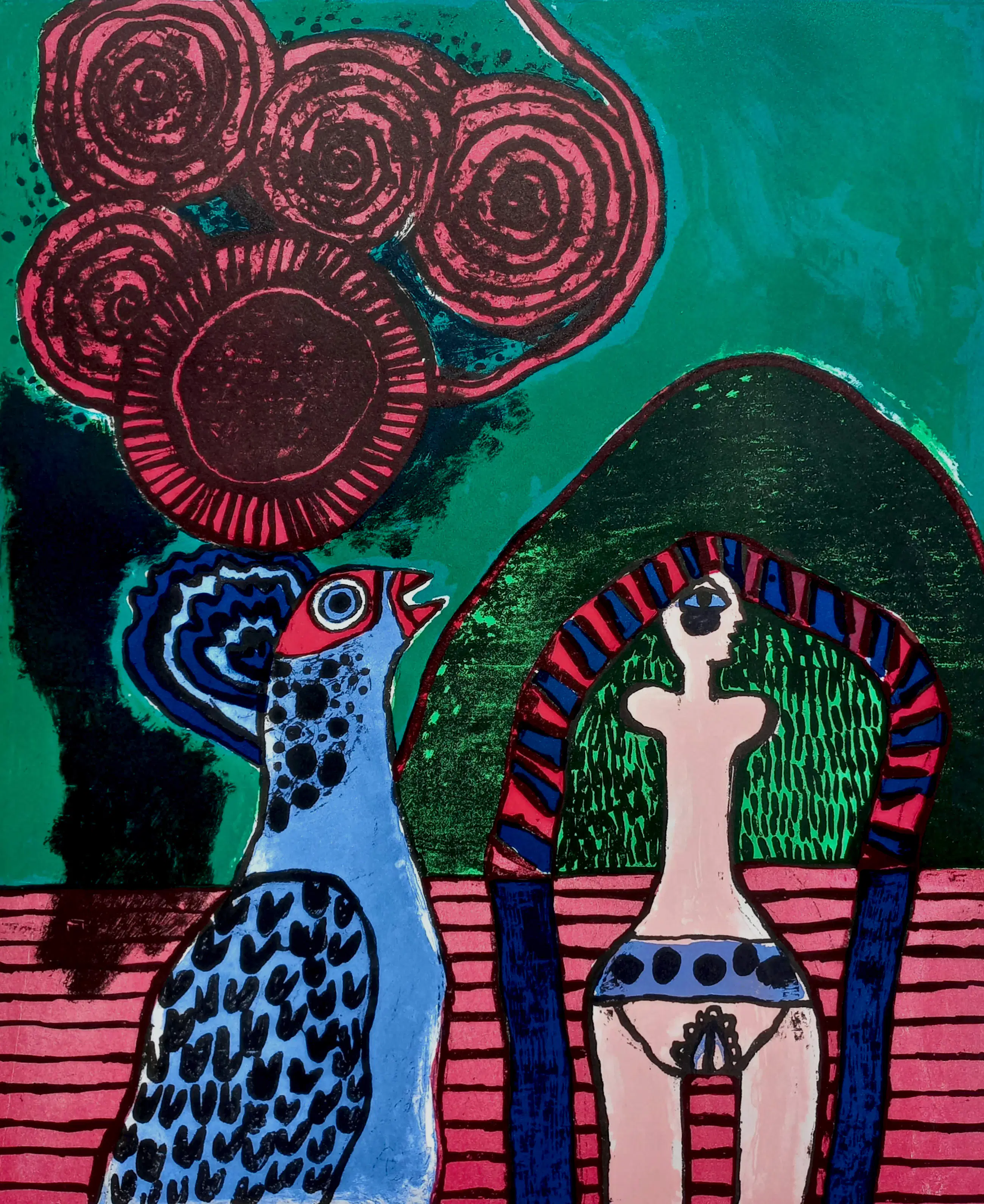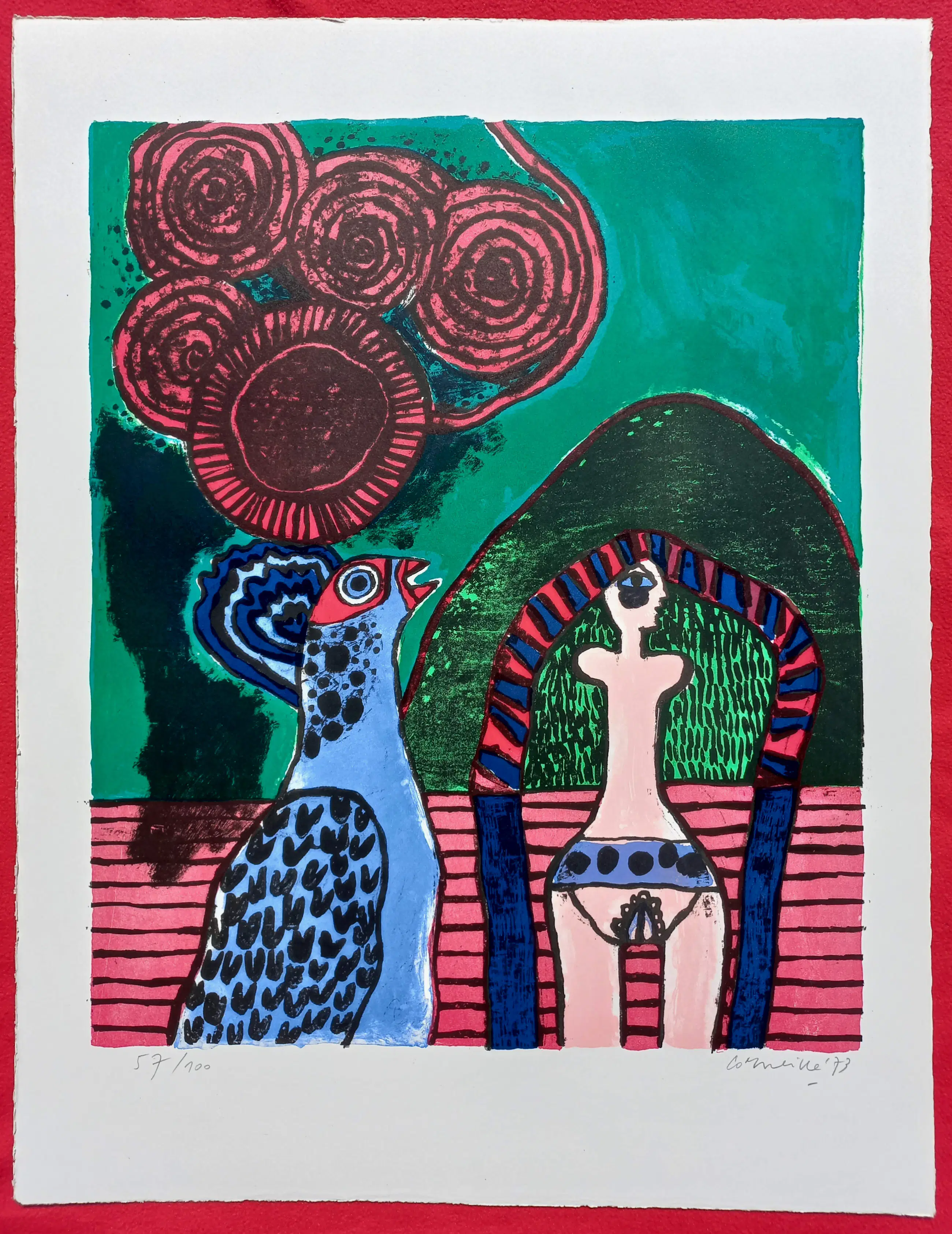 Prachtig, karakteristiek werk van Corneille uit de uitgave Ollintonatiuh. Litho op Hahnemühle papier, met potlood gesigneerd, gedateerd (‘73) en genummerd (57/100). In uitstekende conditie. Literatuur: Donkersloot 329.