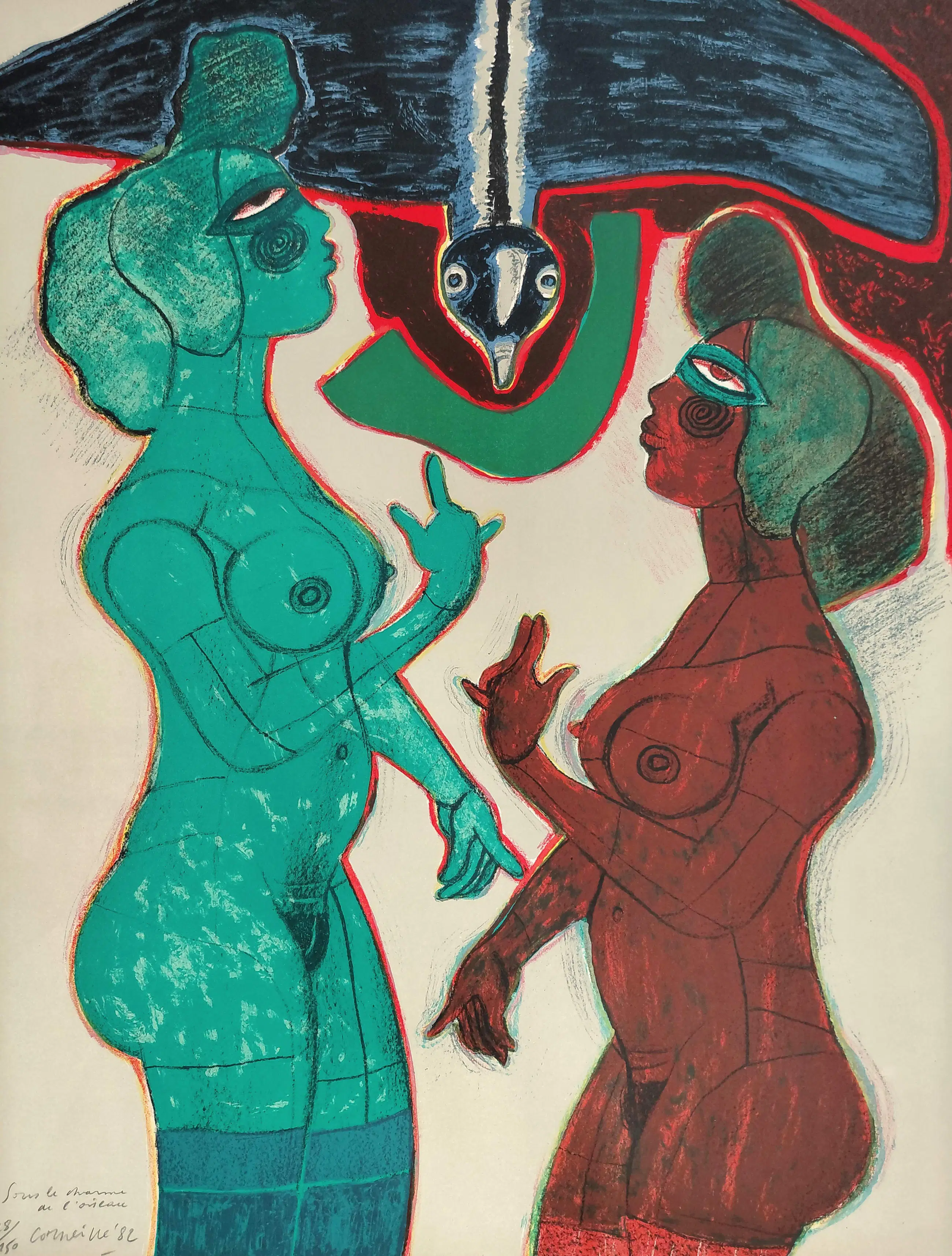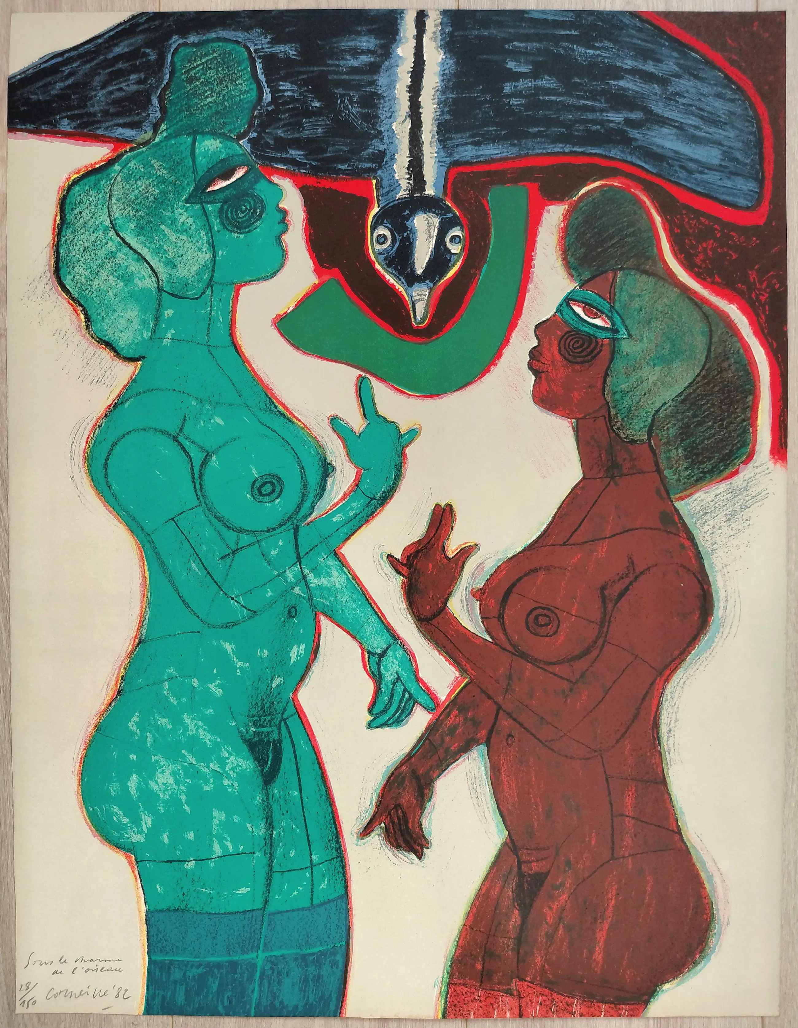 Mooi, karakteristiek werk van Corneille dat zelden wordt aangeboden, wat opvallend is gezien de oplage. Litho op geschept papier, met potlood gesigneerd, gedateerd (‘82), getiteld en genummerd (28/150). In zeer goede conditie.