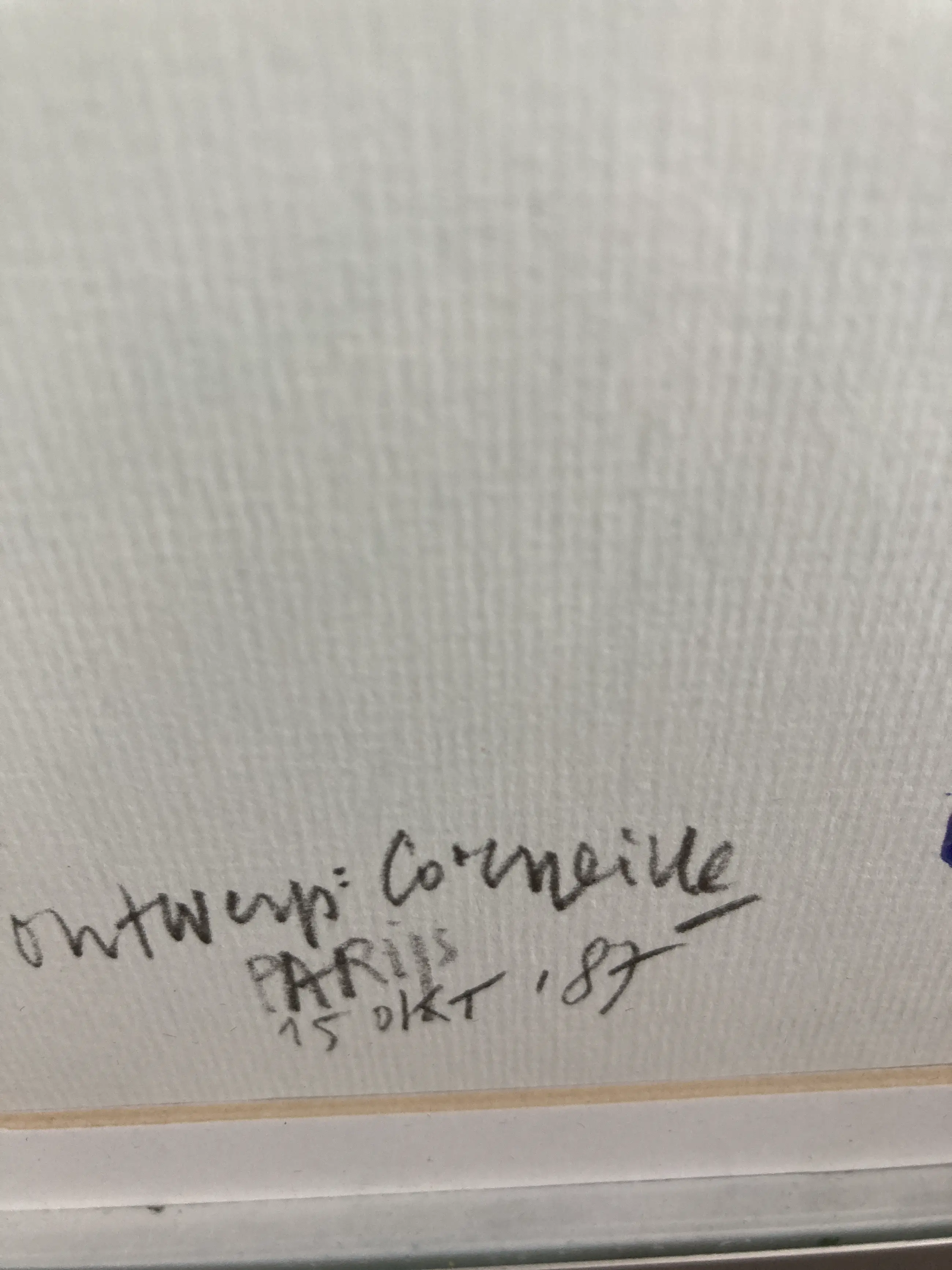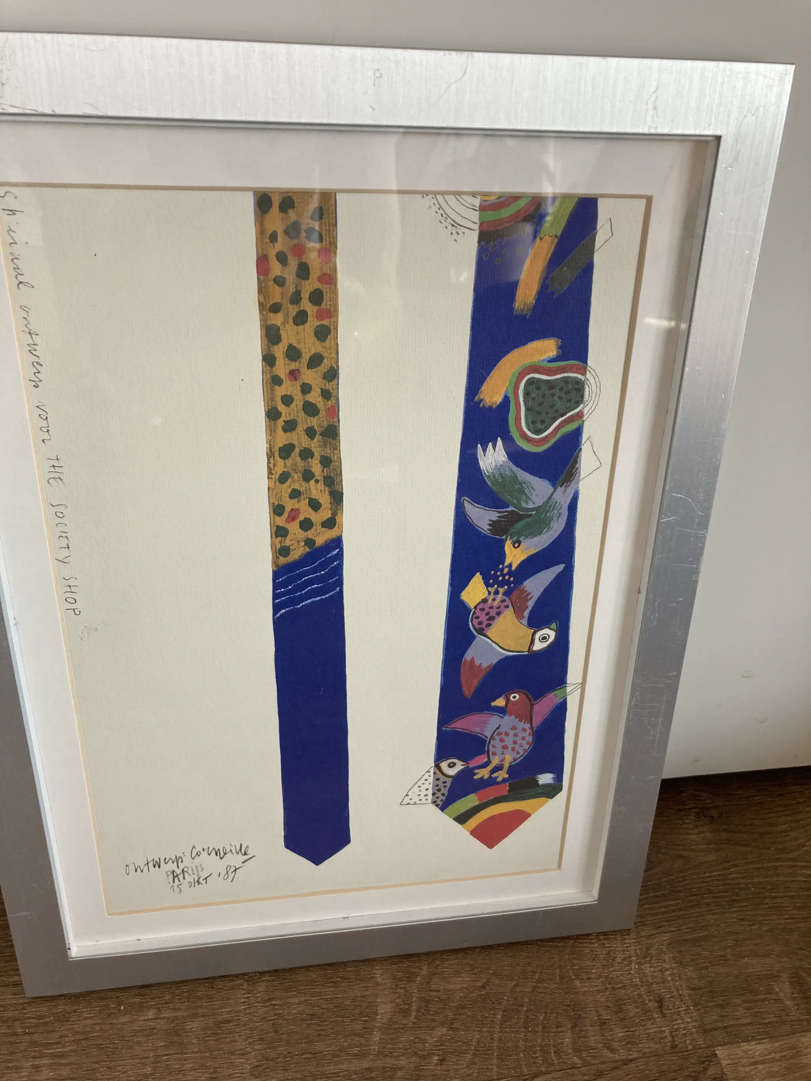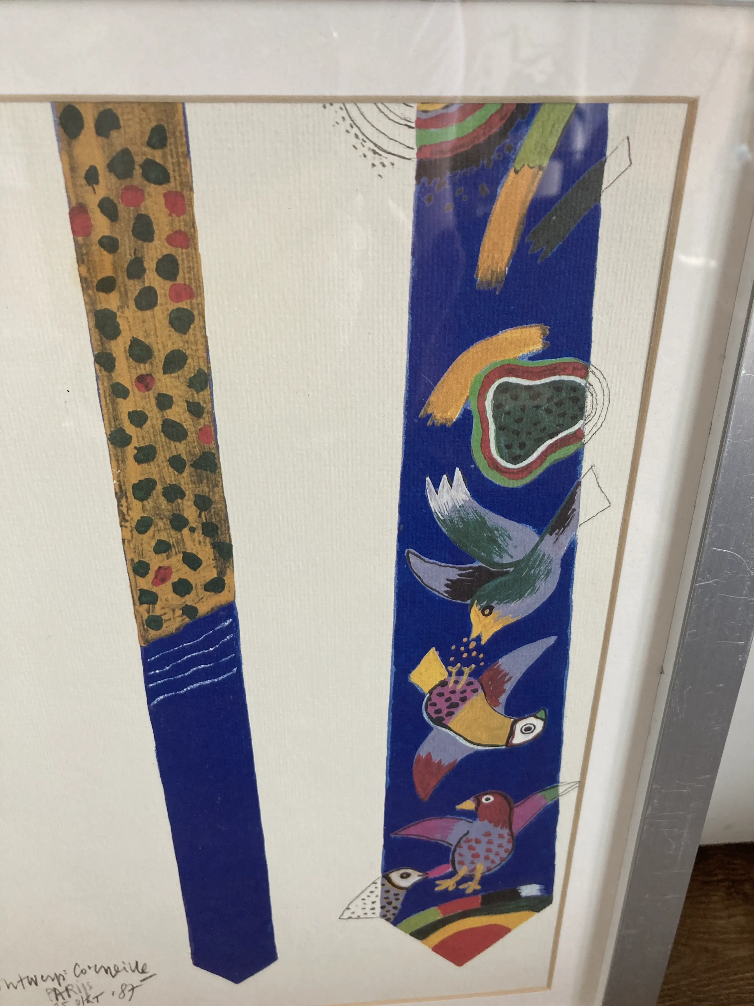 The Society Shop gaf in 1987 Corneille de opdracht een lithoprint te ontwerpen bedoeld als Kerstcadeau voor de vaste klanten. Corneille ontwierp een ‘ vogeltjes ‘ stropdas. Met l.o. Ontwerp Corneille PARIJS 15 oktober ‘87 en links langs de zijkant ‘Speciaal ontwerpverdrag The Society Shop.