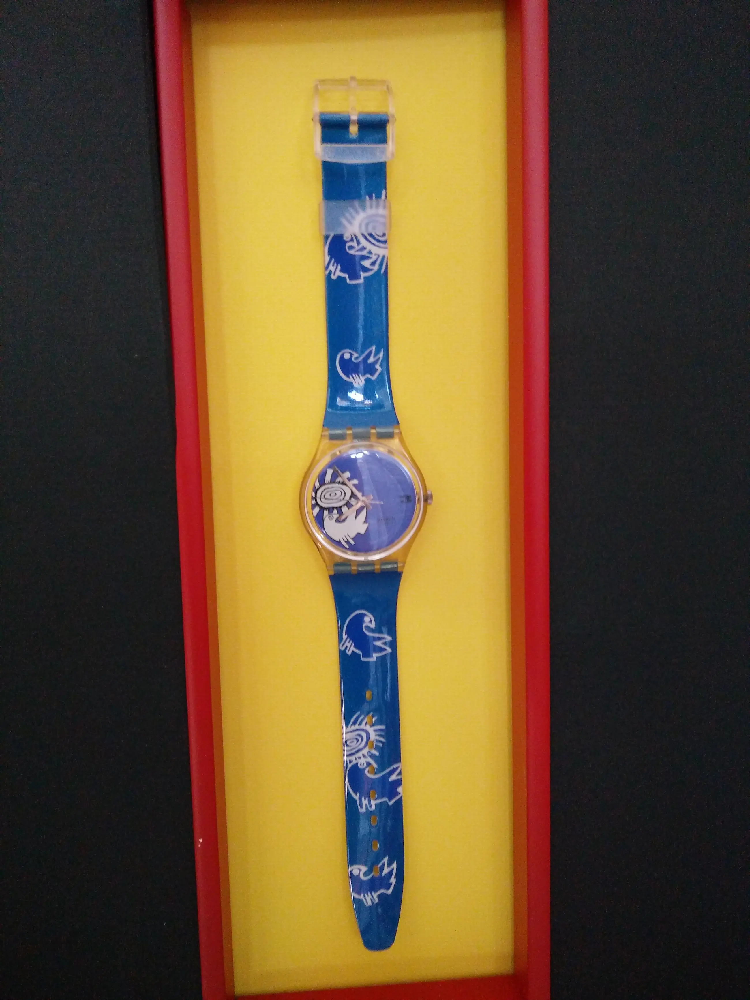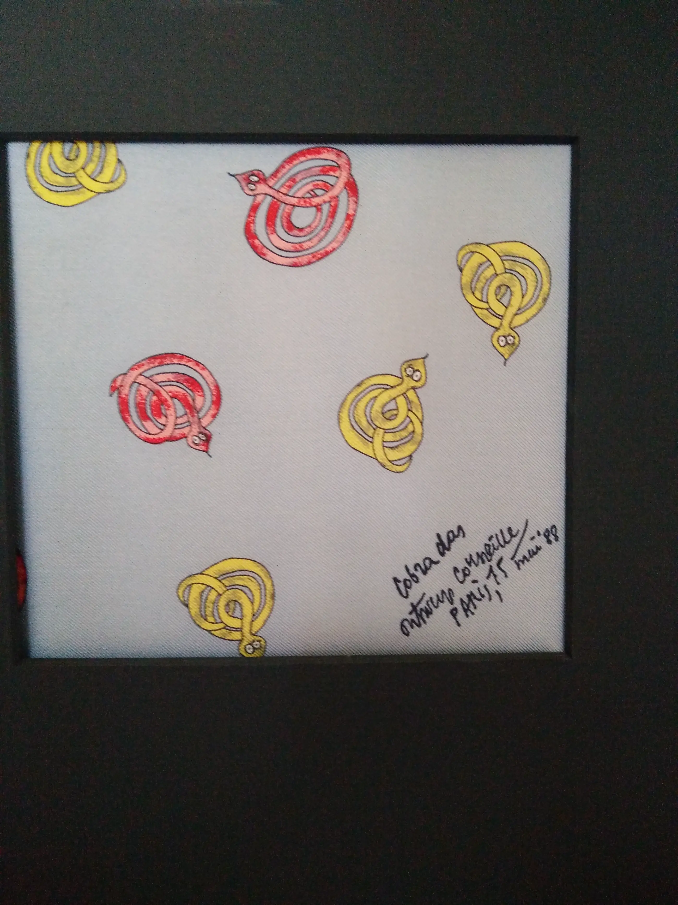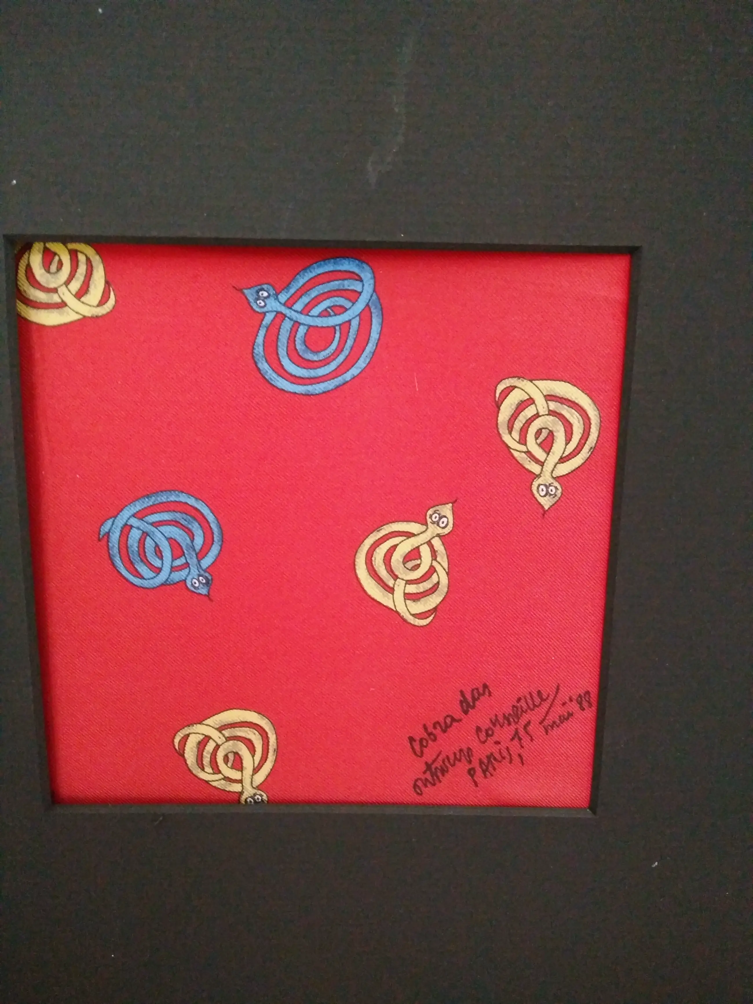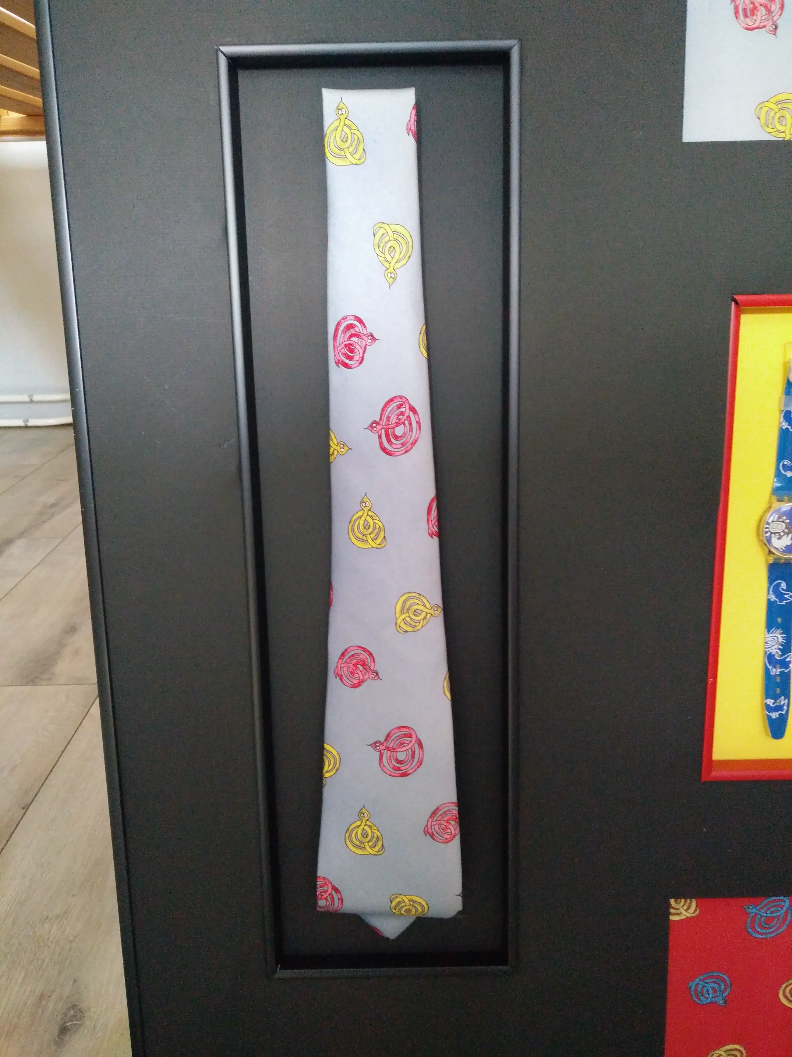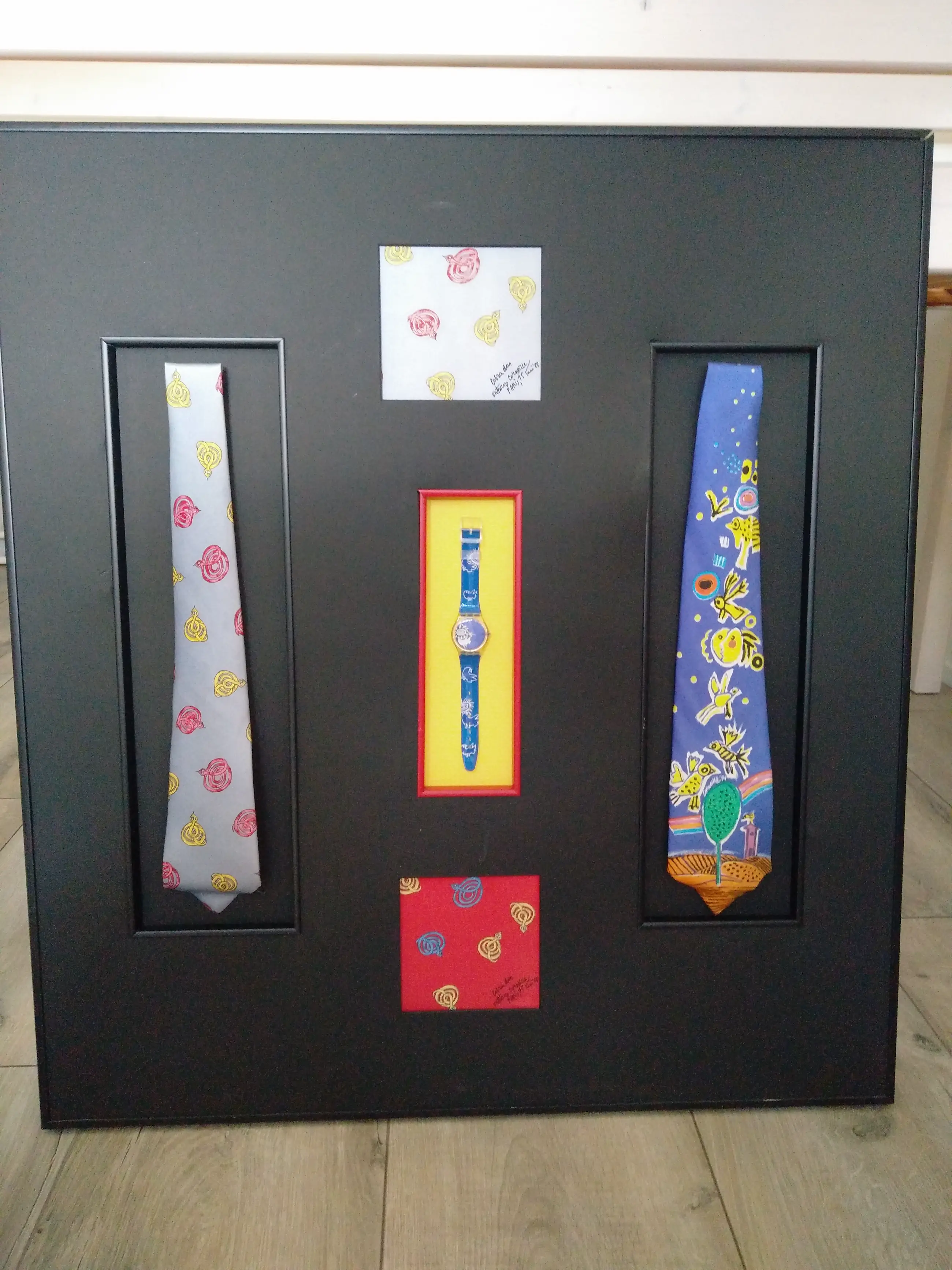 2 stropdassen en een horloge, naar ontwerp van Corneille, in een lijst. Helaas is onlangs het glas van de lijst gesneuveld en is daarbij de lijst ook op 1 hoek beschadigd. De items zijn onbeschadigd.