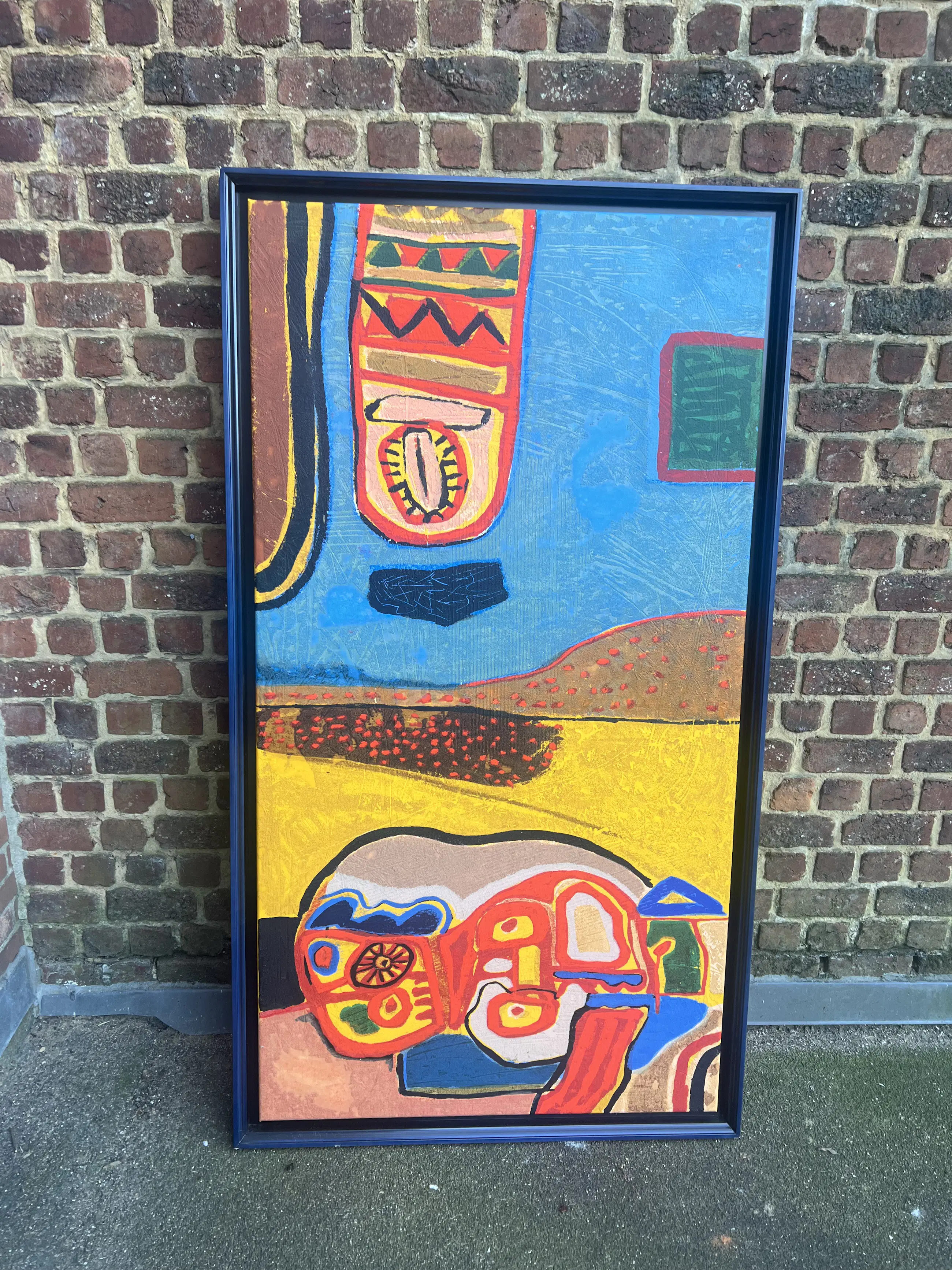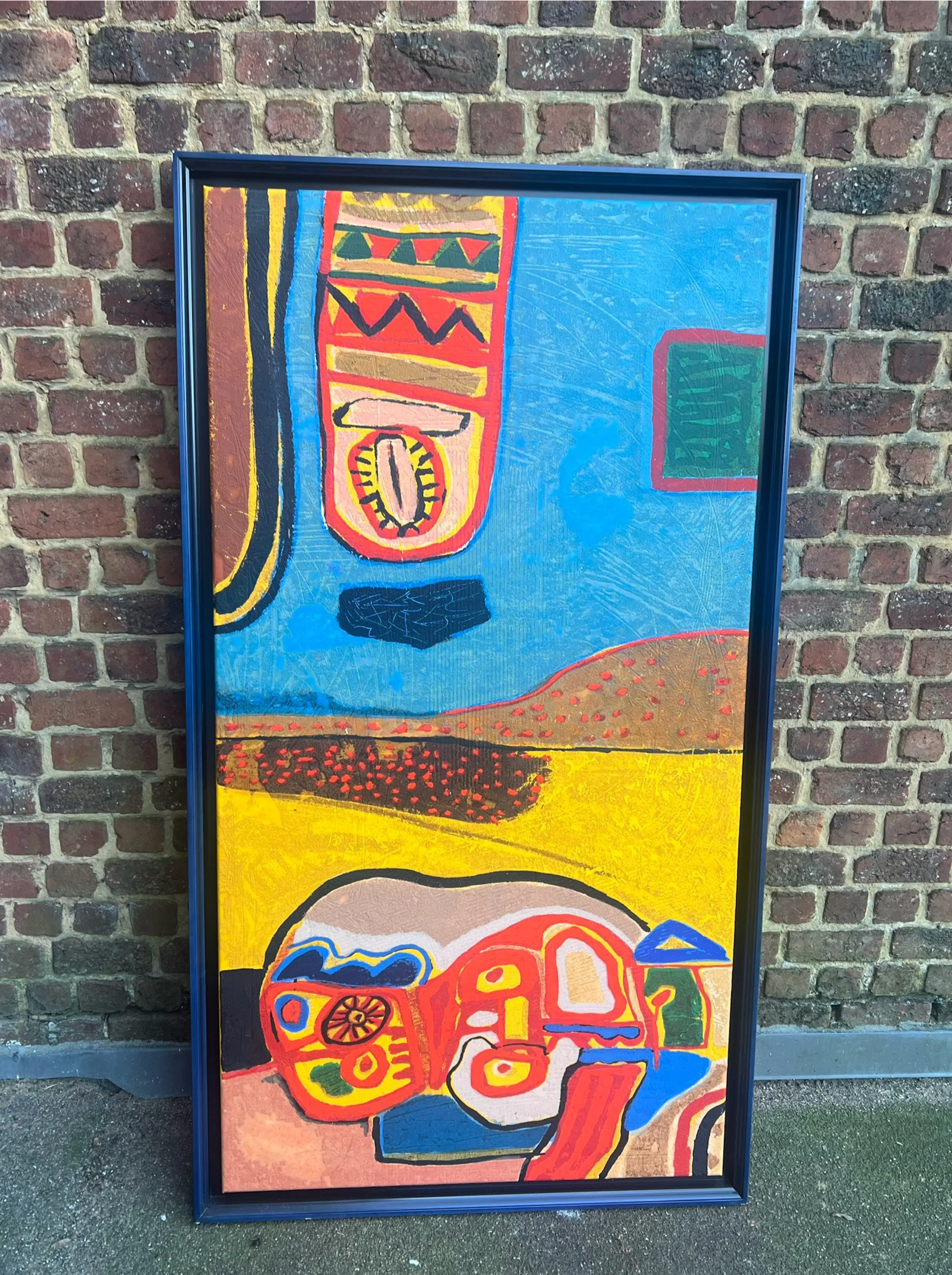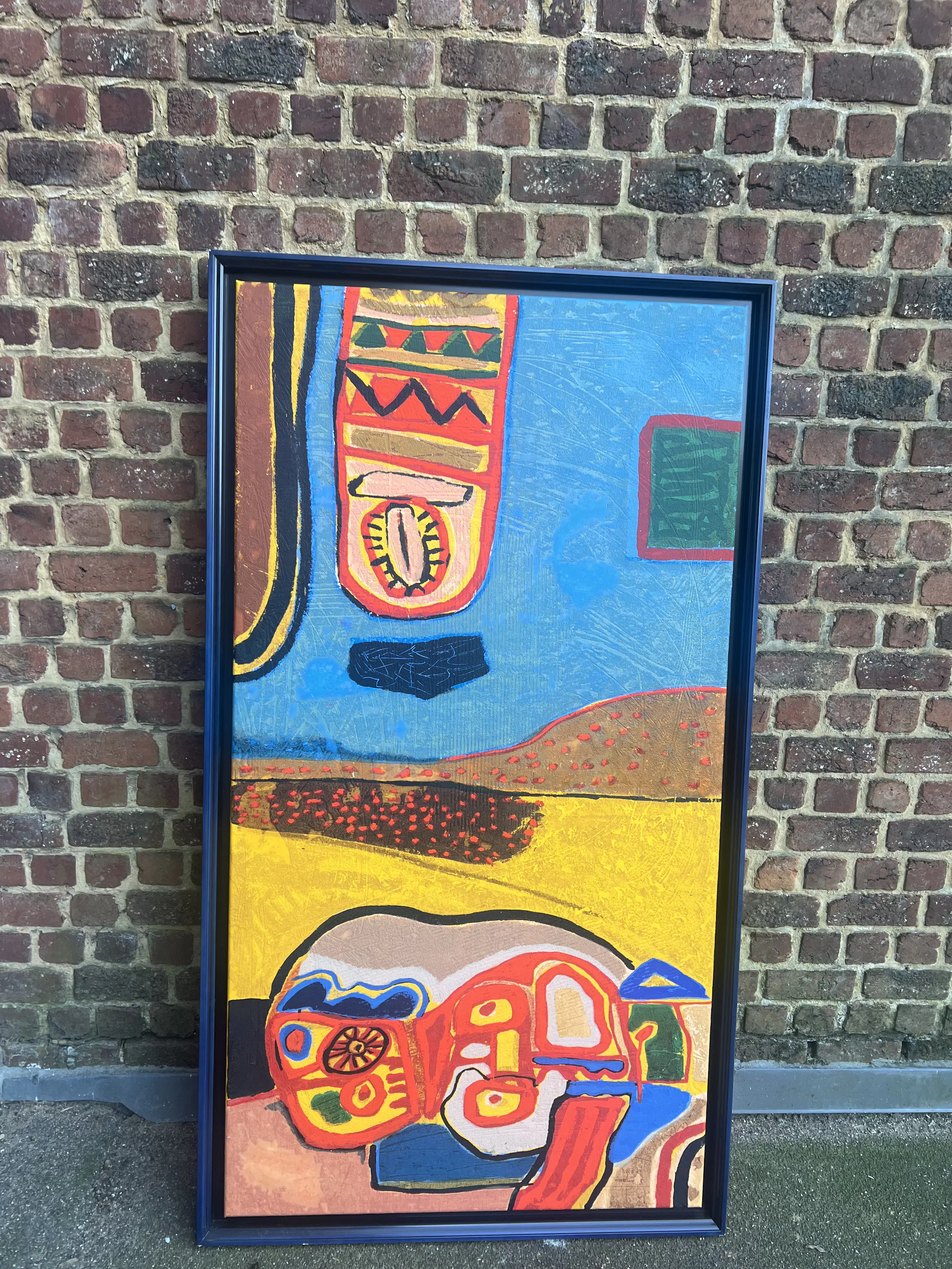 Grote ingelijste terragrafie op doek van de schilder Guillaume Corneille, een van de oprichters van de Cobra-groep met Asger Jorn, Karel Appel, Constant, Dotremont en later Alechinsky en Jacques Doucet.