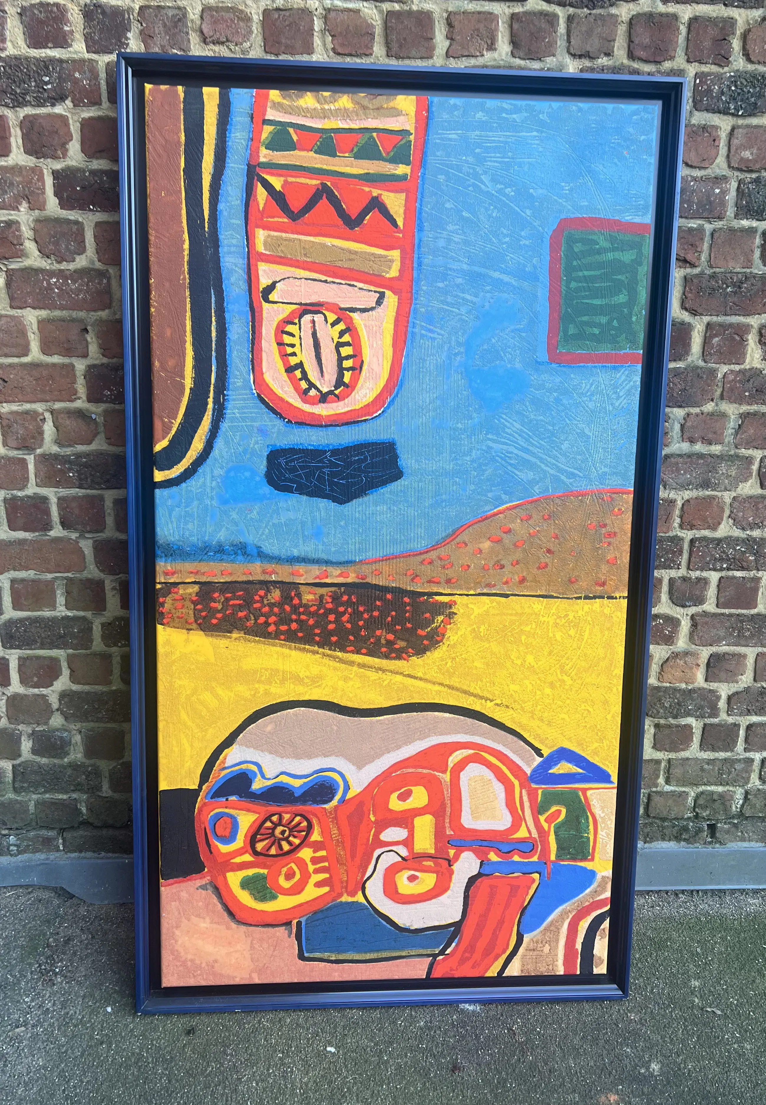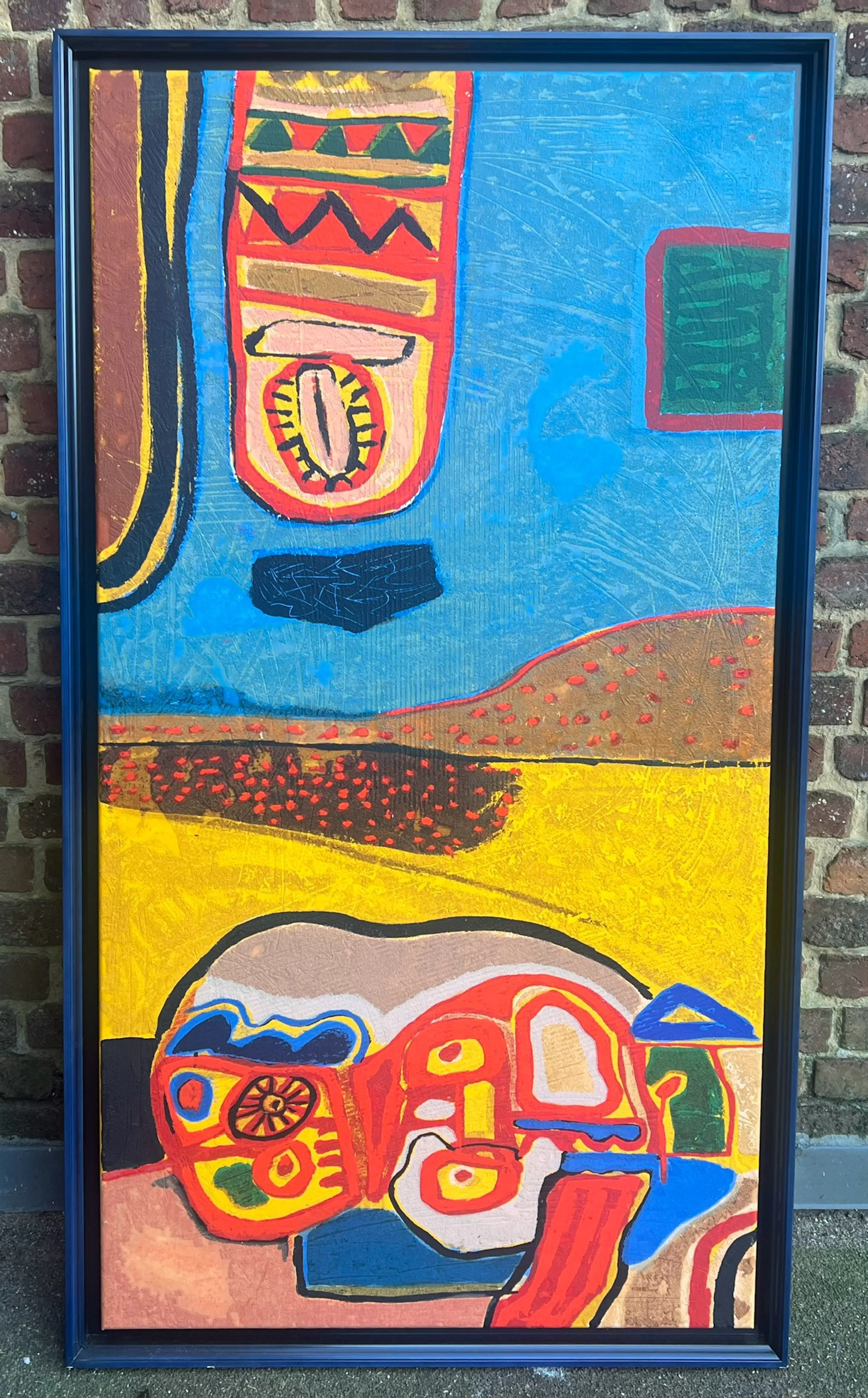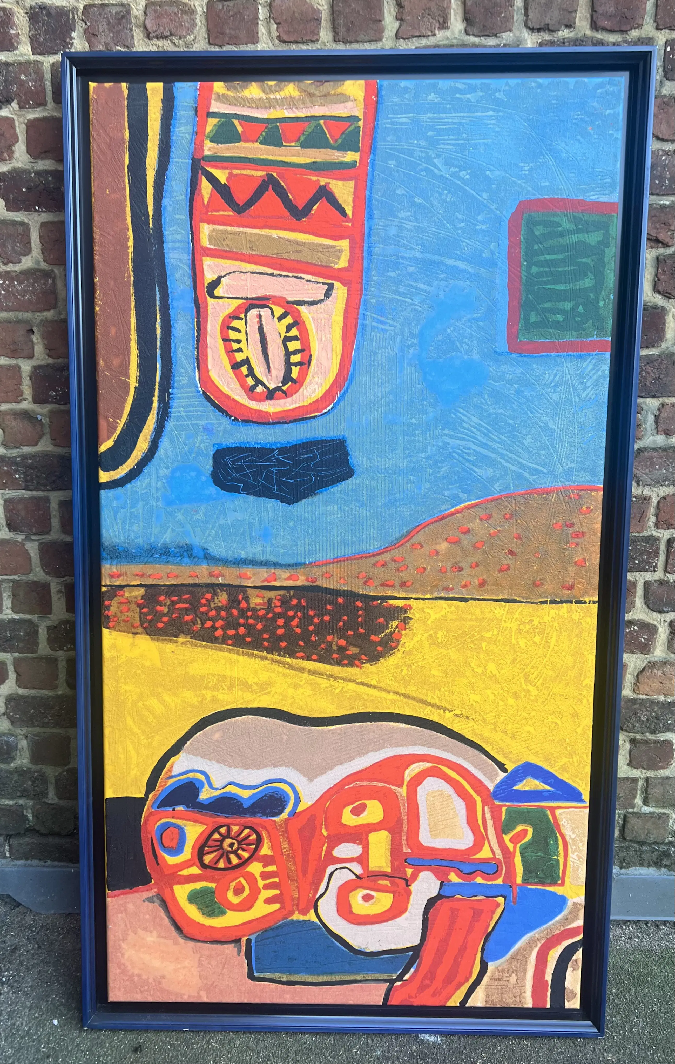 Grote ingelijste terragrafie op doek van de schilder Guillaume Corneille, een van de oprichters van de Cobra-groep met Asger Jorn, Karel Appel, Constant, Dotremont en later Alechinsky en Jacques Doucet.
