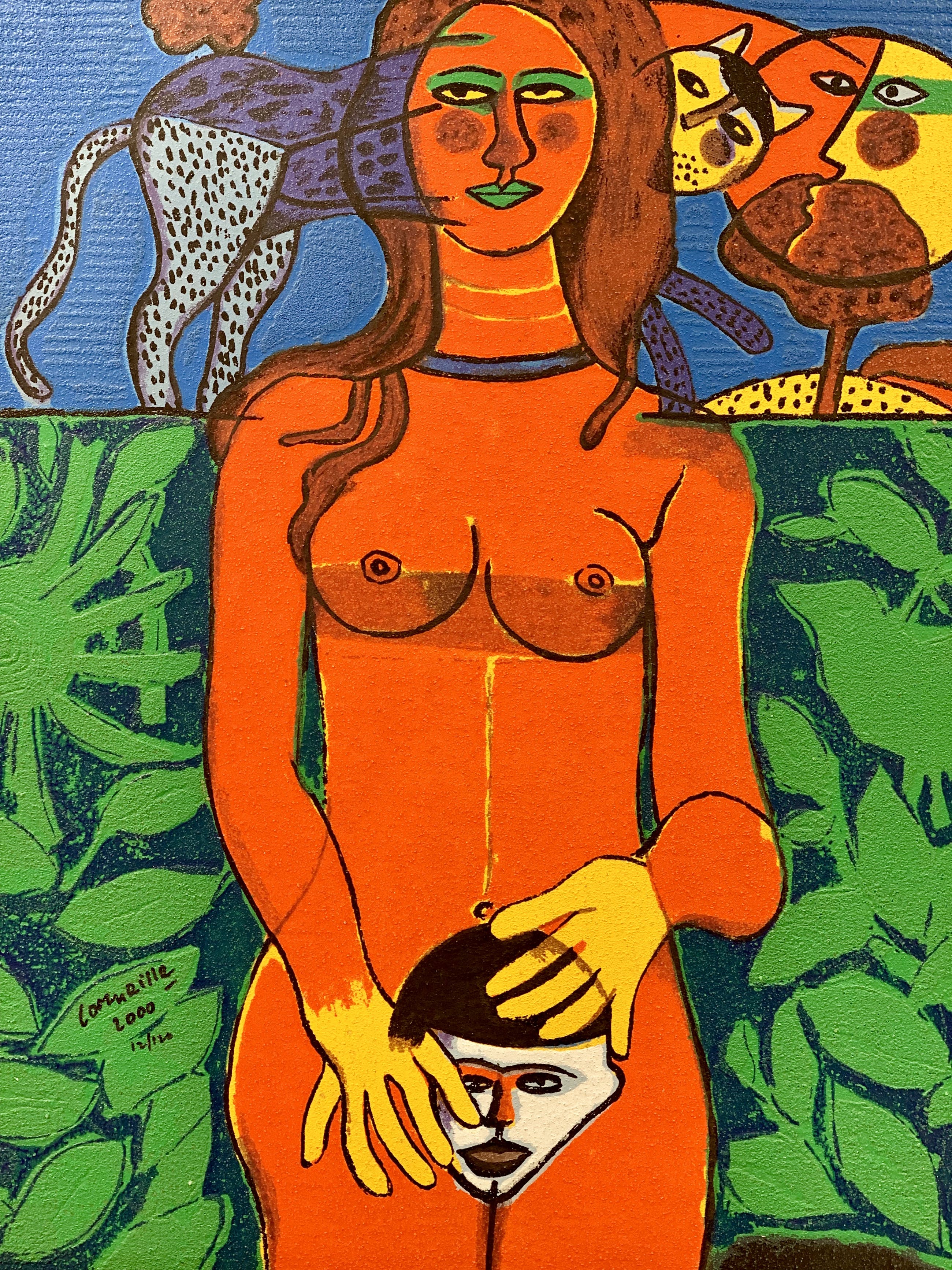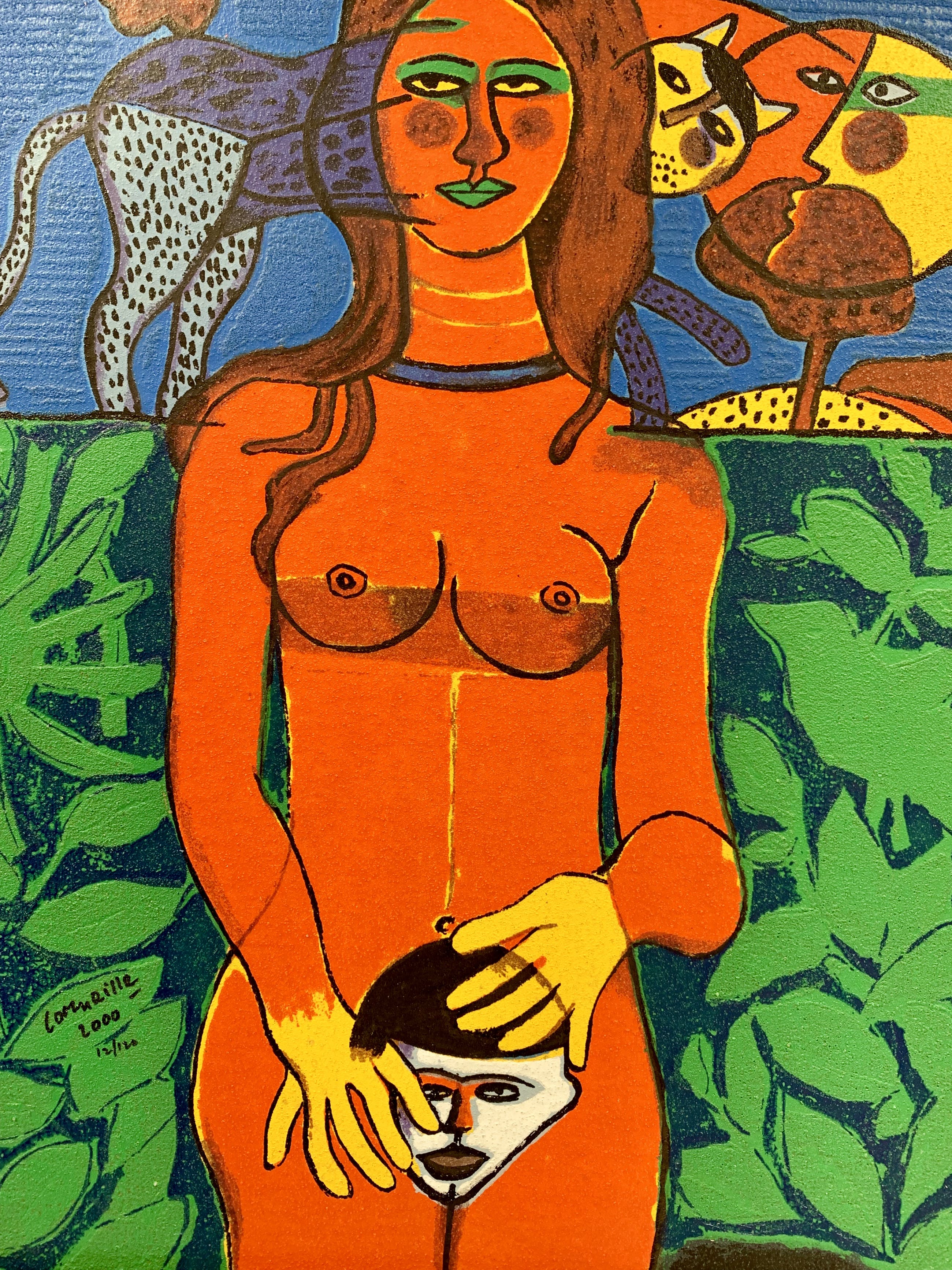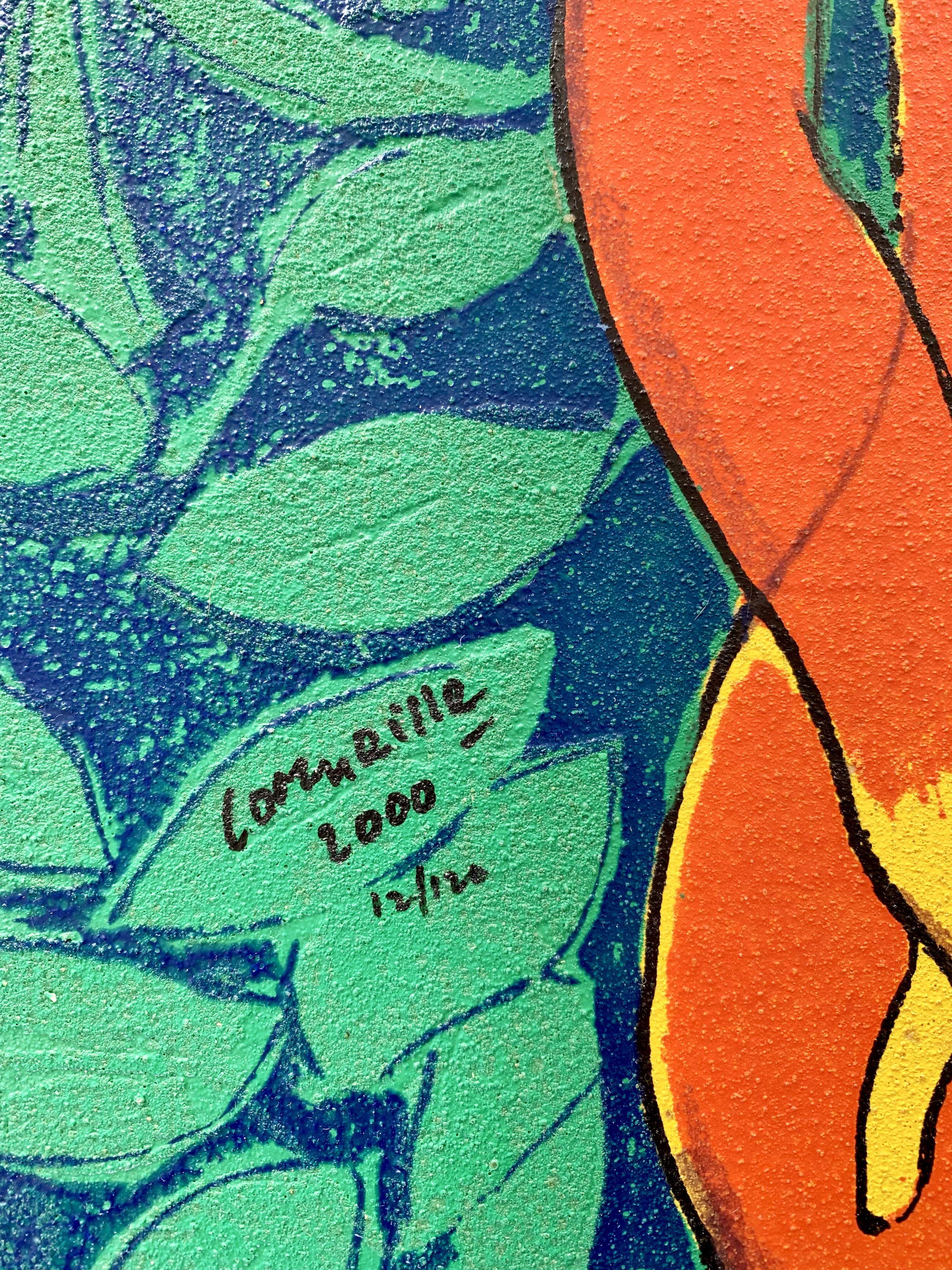Zeer fraaie terragrafie van Corneille. De terragrafie zeefdruktechniek is zeer exclusief: de drukverf wordt met zand vermengd waardoor er fraaie relief verschillen ontstaan. Dit wordt door Corneille zelden toegepast vanwege de complexiteit en het feit dat de zeef na ongeveer 7 drukgangen moet worden vervangen door slijtage. De gebruikte drukinkt laat het toe dat het werk zonder glas kan worden ingelijst. Het werk komt zo fantastisch tot zijn recht: het is net of er een origineel werk van Corneille aan de muur hangt!