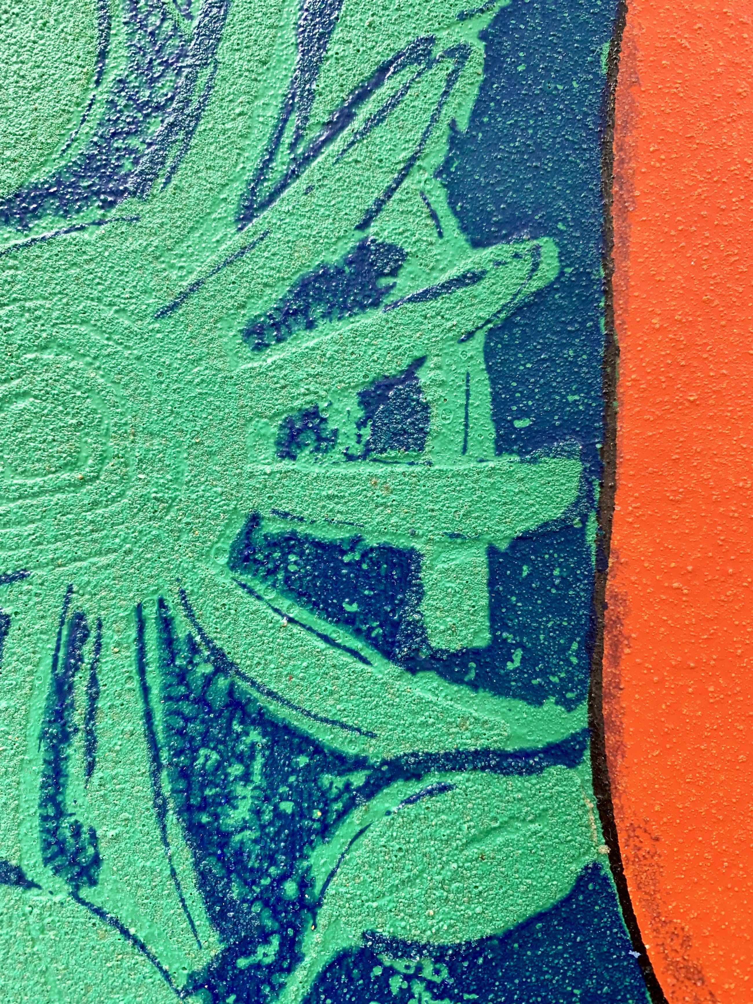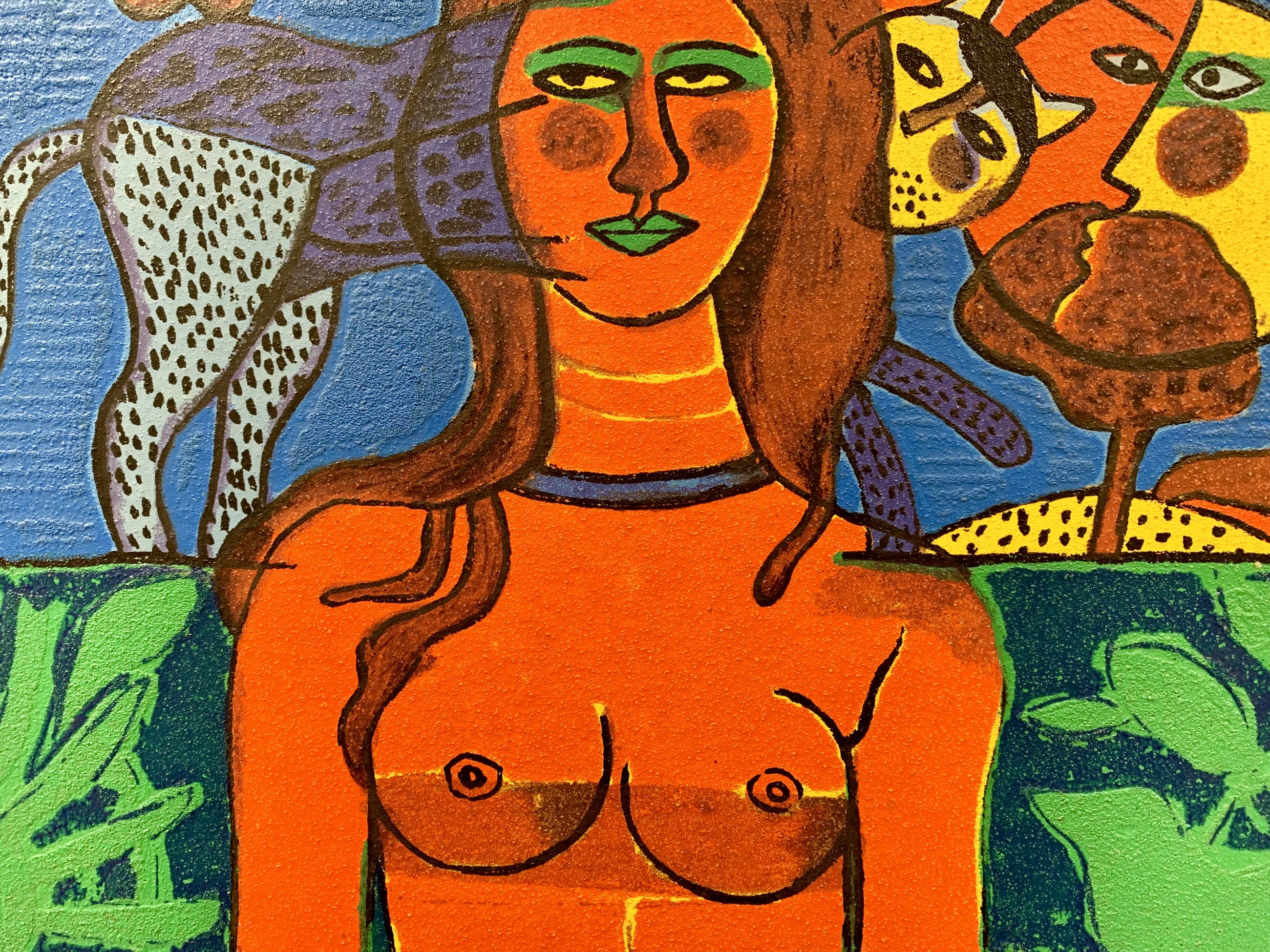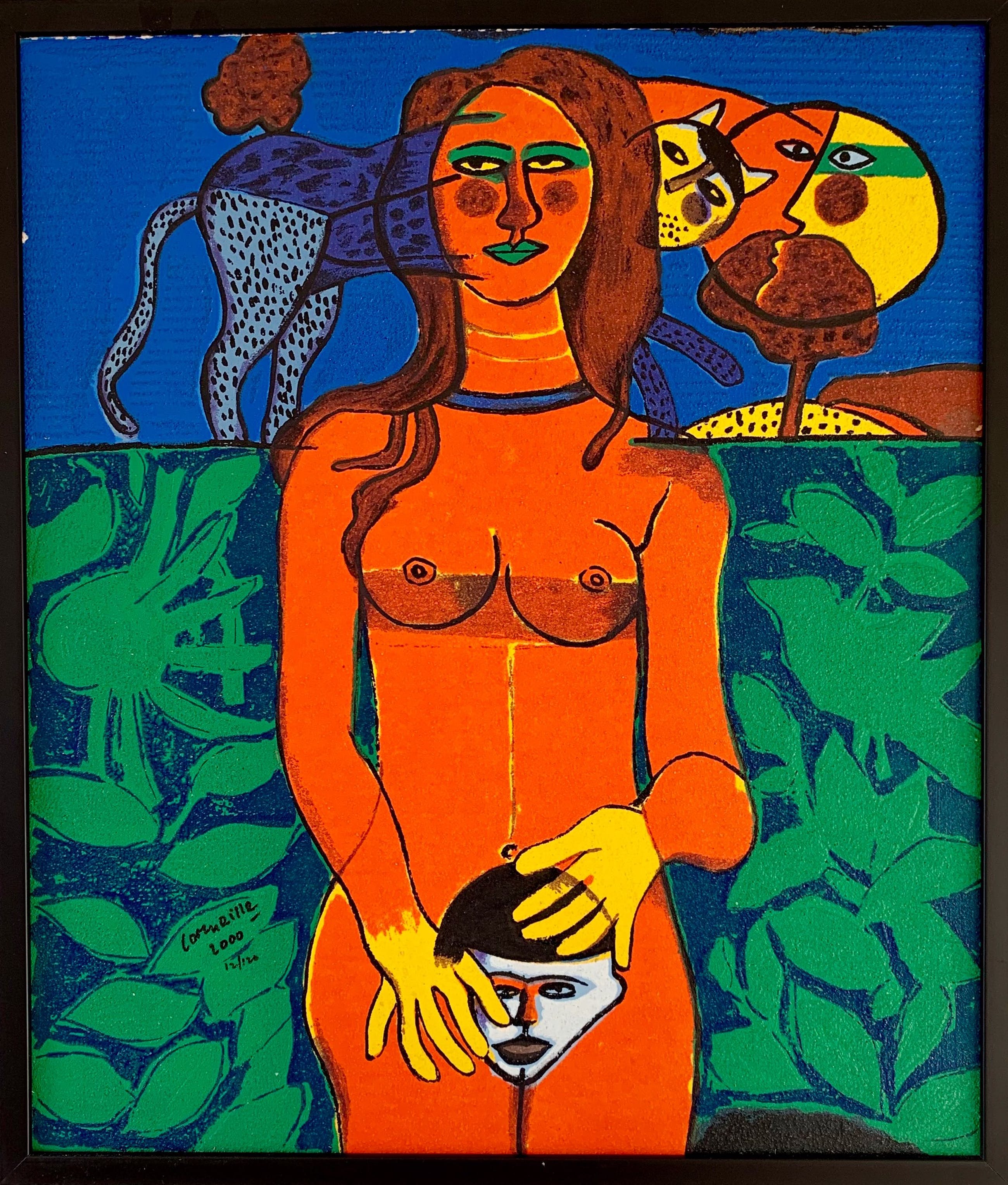 Zeer fraaie terragrafie van Corneille. De terragrafie zeefdruktechniek is zeer exclusief: de drukverf wordt met zand vermengd waardoor er fraaie relief verschillen ontstaan. Dit wordt door Corneille zelden toegepast vanwege de complexiteit en het feit dat de zeef na ongeveer 7 drukgangen moet worden vervangen door slijtage. De gebruikte drukinkt laat het toe dat het werk zonder glas kan worden ingelijst. Het werk komt zo fantastisch tot zijn recht: het is net of er een origineel werk van Corneille aan de muur hangt!