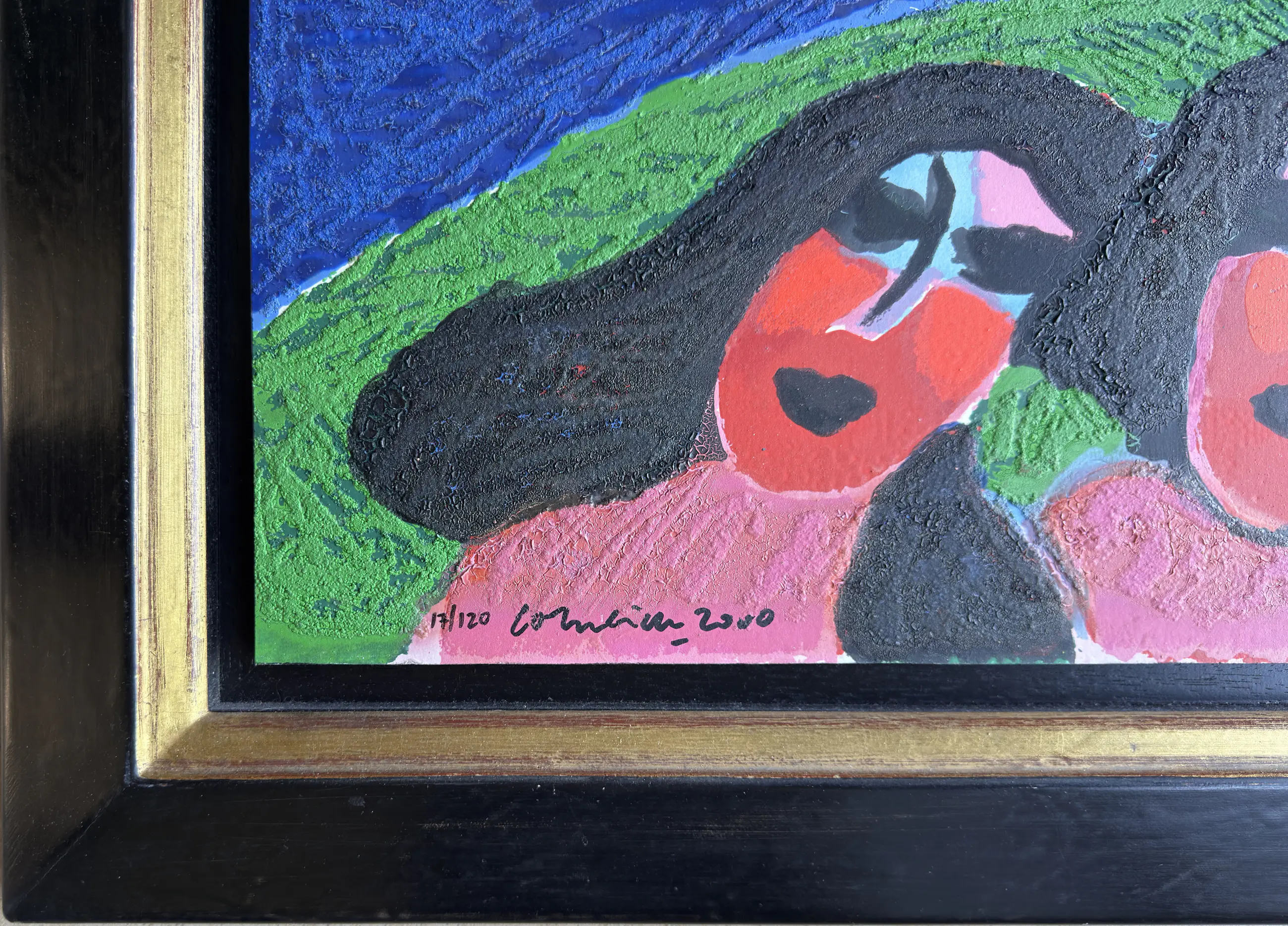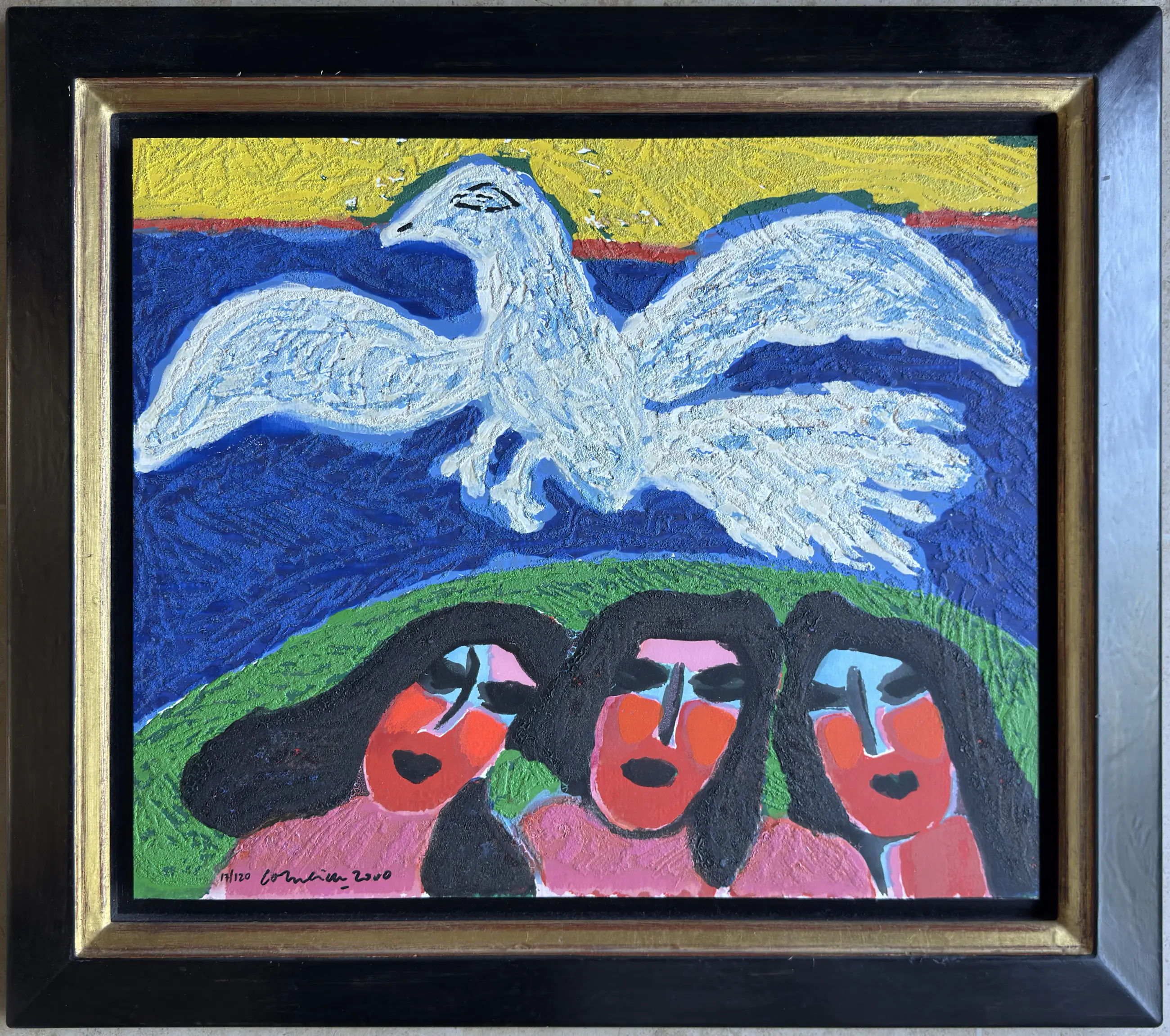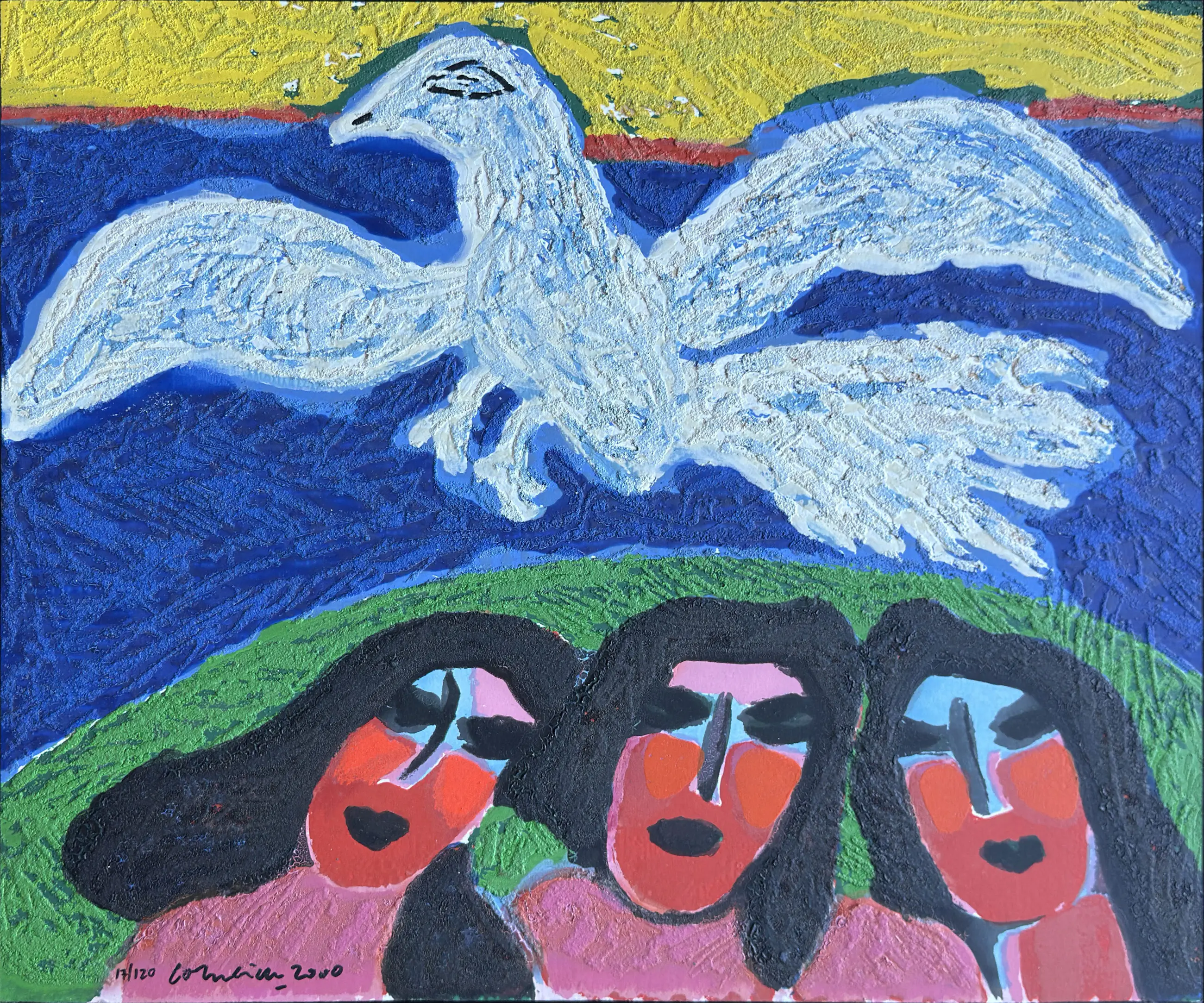 Terragravure van Corneille met de titel: 'Witte vogel' uit 2000. Het werk is linksonder met de hand gesigneerd door de kunstenaar.