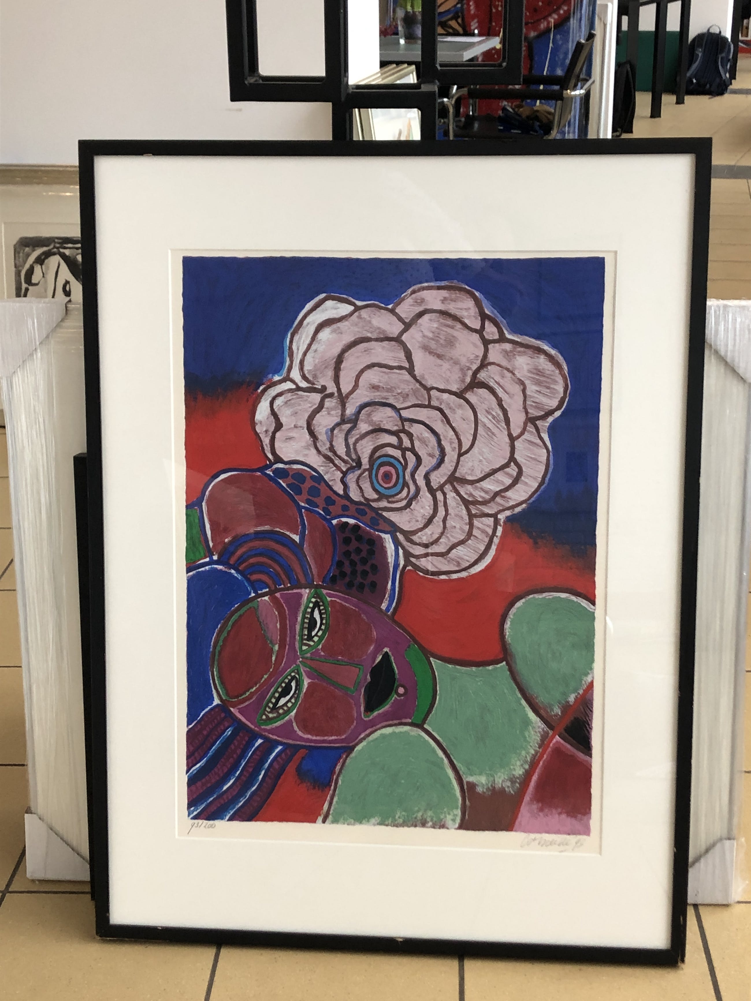 Mooie zeefdruk van CoBrA- kunstenaar Corneille. Het werk is in goede conditie. U kunt het werk vooraf komen bekijken in de Schatkamer van galerie Rotor in Gorcum, na aankoop afhalen of per koerier toegestuurd krijgen. Het werk heeft een zwart houten lijst.. De foto is door het venster van de lijst heen genomen.