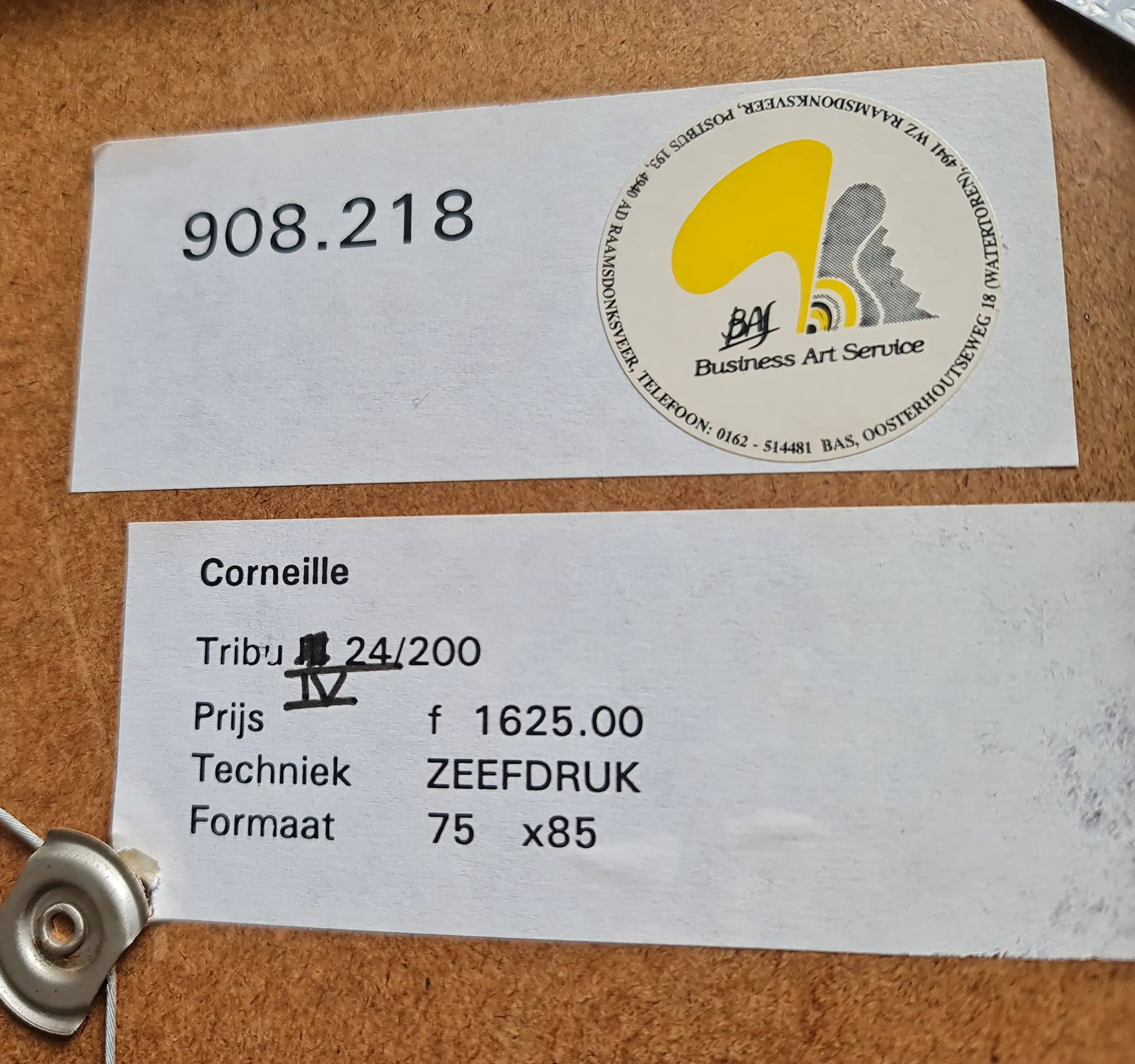 De zeefdruk verkeerde in zeer goede conditie, de lijst komt uit 1996 en heeft gebruikerssporen. Het werk is zuurvrij ingelijst(zie conservering certificaat op de foto)