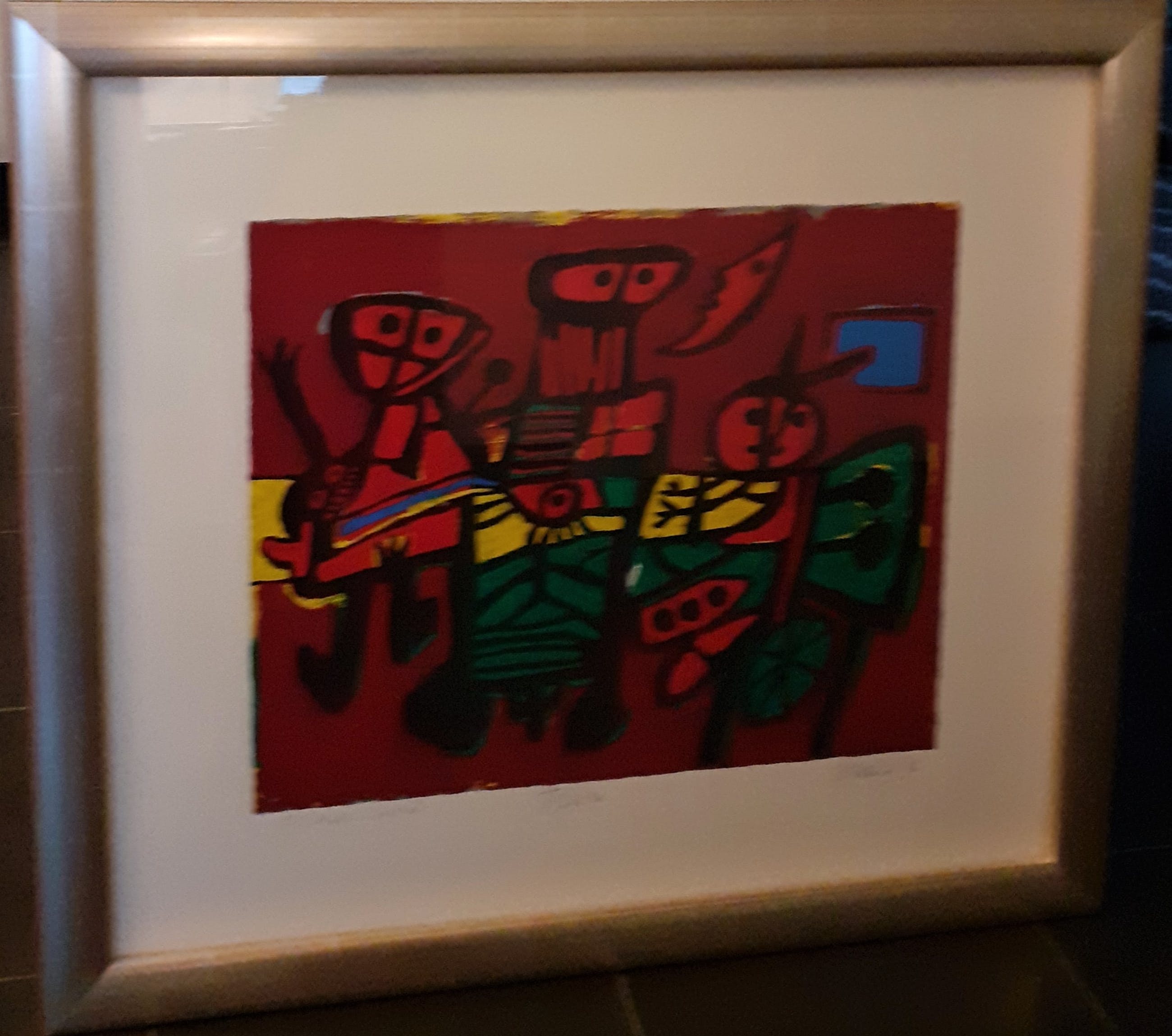 Prachtige zeefdruk van Corneille 'Tribu' uit 1992, e/a Imposant gelijst in grote, brede zilverkleurige lijst met passepartout Afm. zeefdruk: 76 x 87 cm Afm. lijst: 85 x 95 cm. Ivm grootte en kwetsbaarheid wordt werk bezorgd tegen € 35,- in Nederland (muv de eilanden) en naar België via koerier