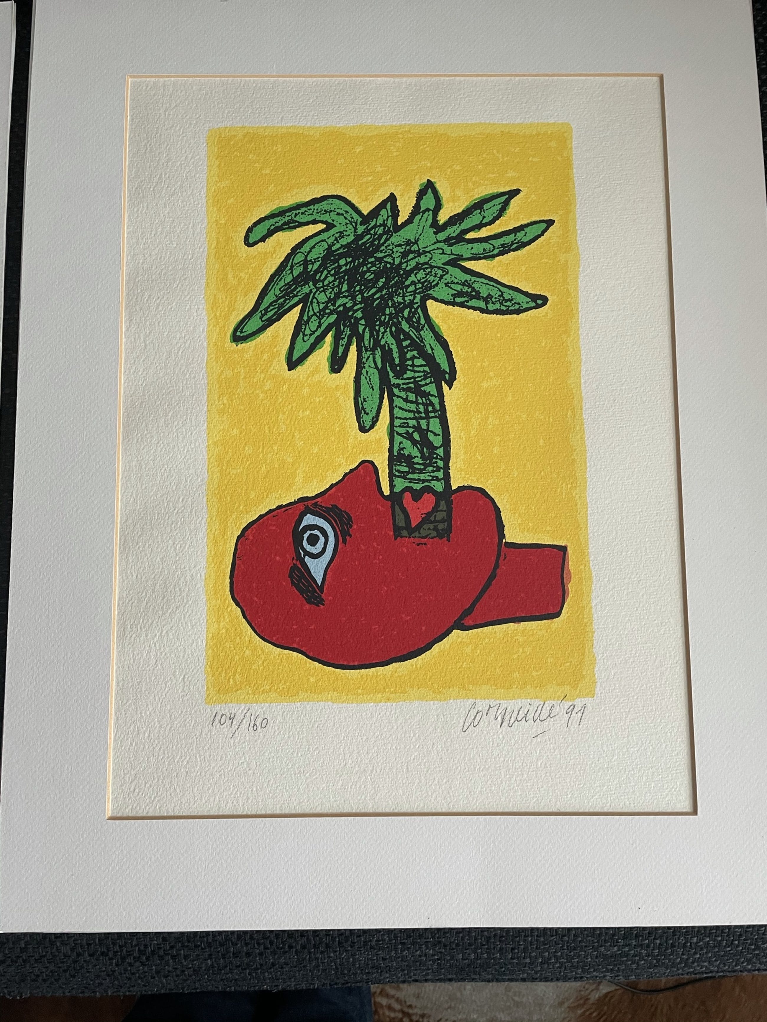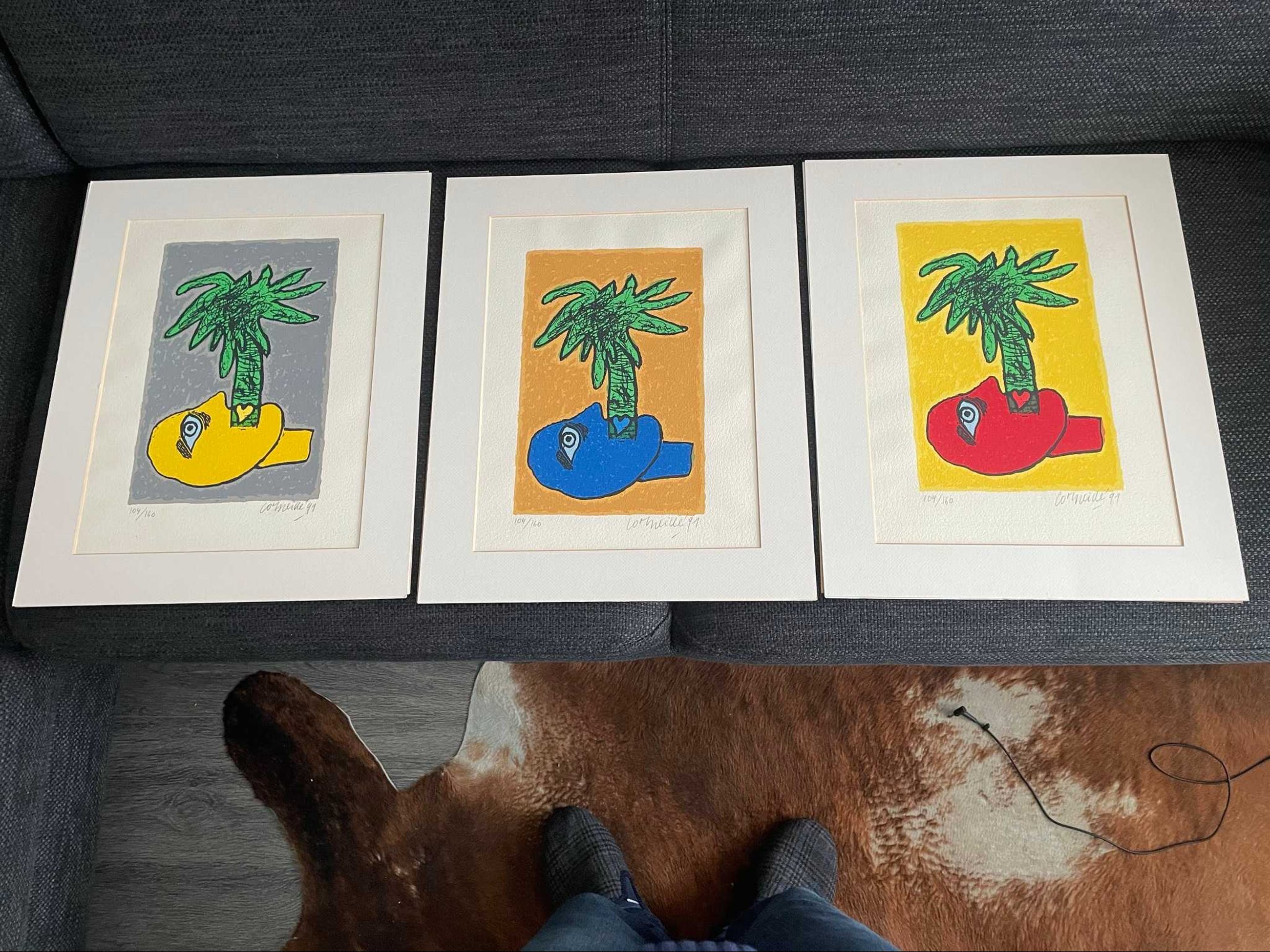 De complete Trilogie Tropicale van Corneille uit 1991, inclusief bijbehorende map met nummering. Alle drie de zeefdrukken zijn hand gesigneerd en genummerd, 104 van 160. De set is in uitstekende staat en wordt geleverd met passe-partout bij elke weefdruk. Als geheel is de set niet vaak in de verkoop.