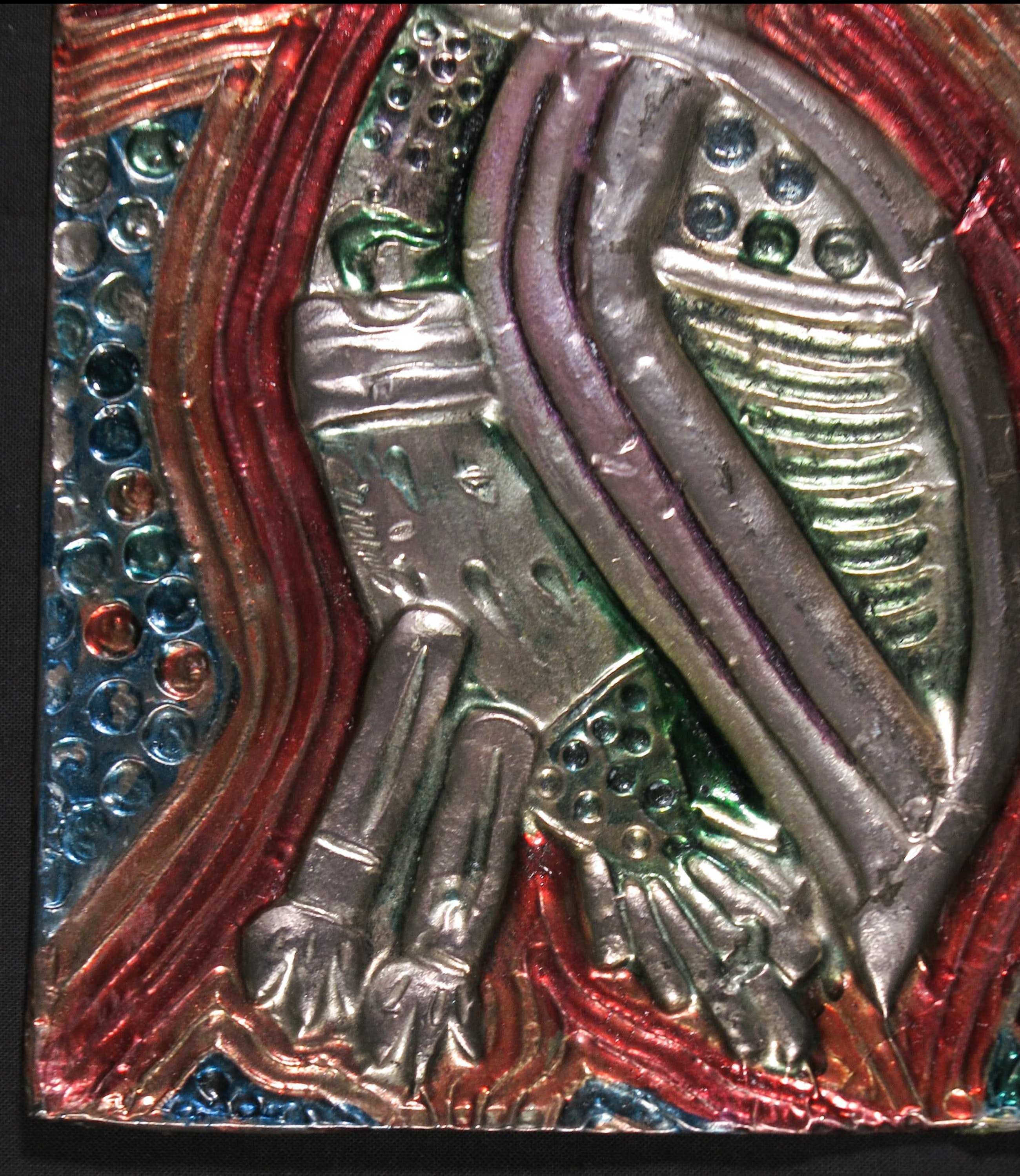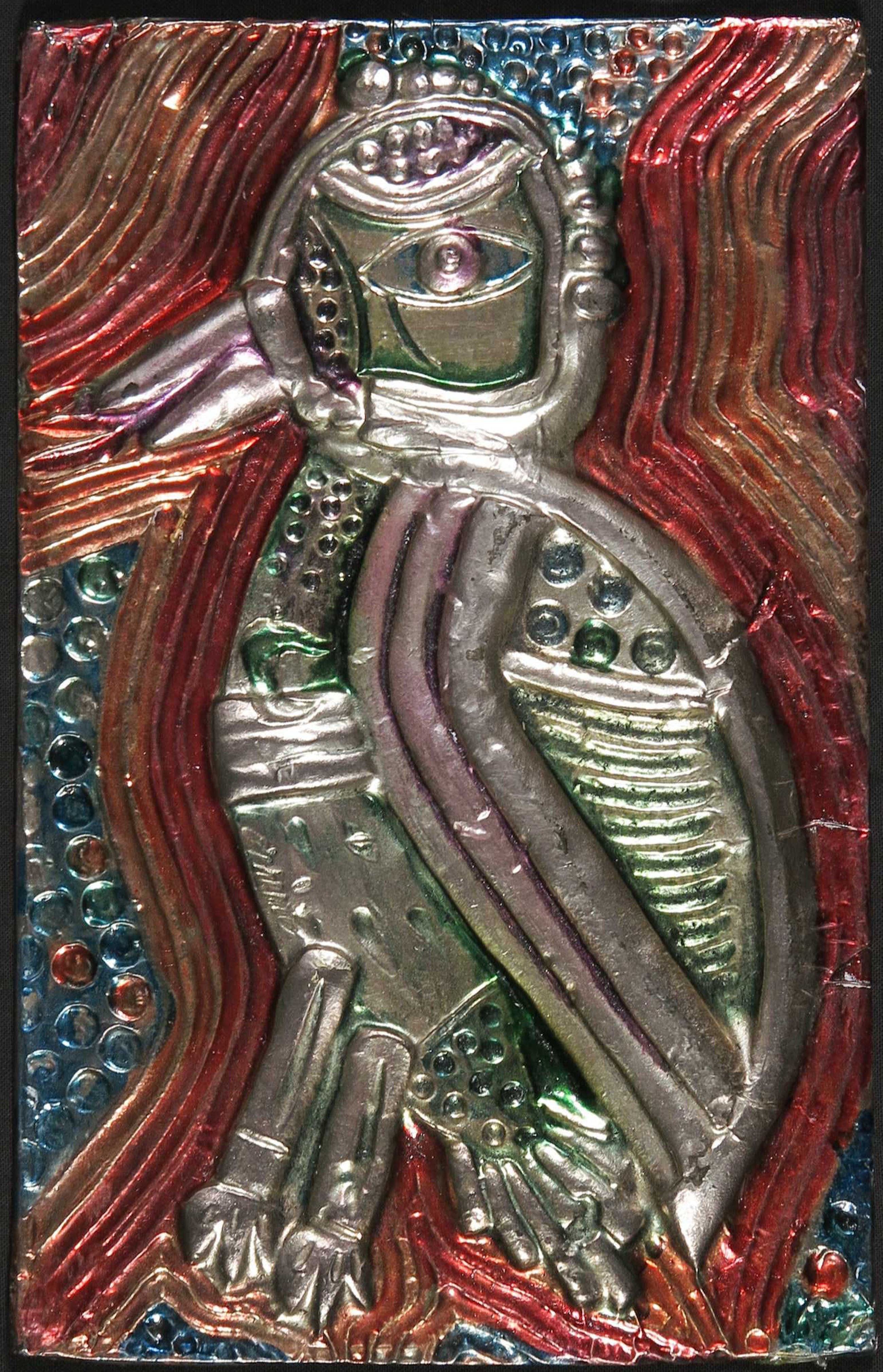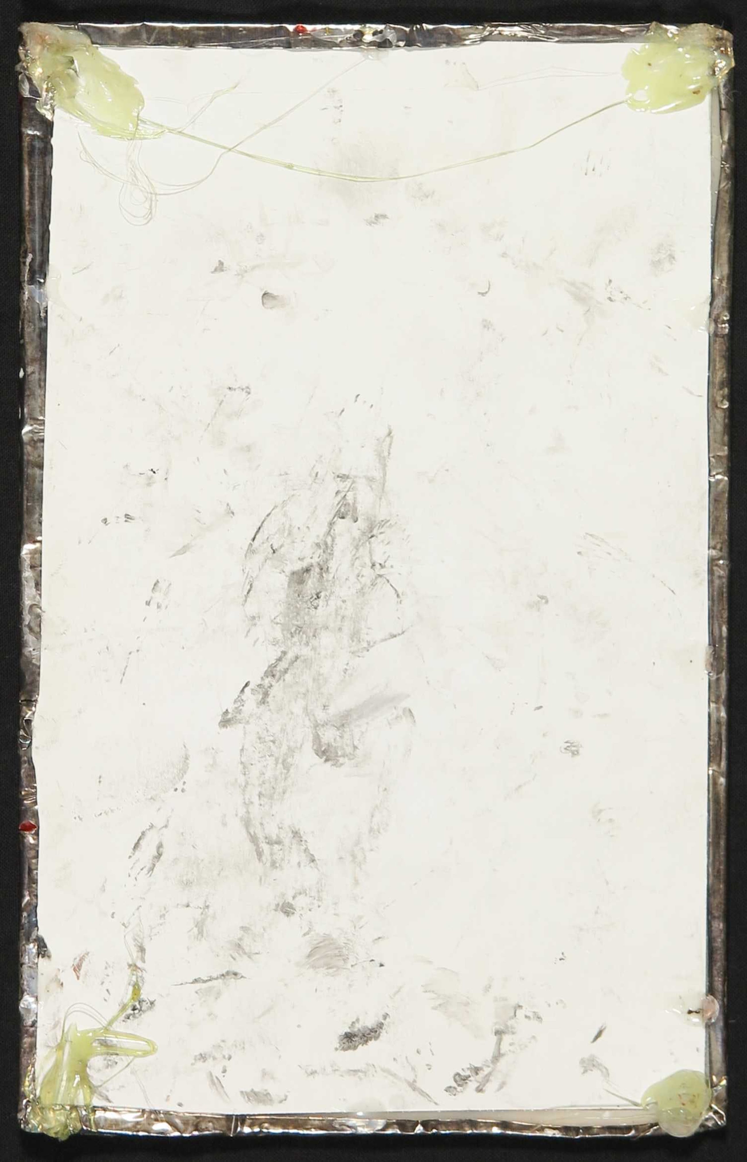 Een van de twee zilveren plaatjes zit om een drager met het reliëf van de voorstelling heen gevouwen, waardoor de vorm redelijk in tact kan blijven. Het andere plaatje is bevestigd op een stukje karton, maar laat langs de randen los. Dit werk is kwetsbaar, omdat het dunne plaatje niet om de mal is gevouwen en daardoor makkelijker deukjes kan oplopen. | |||