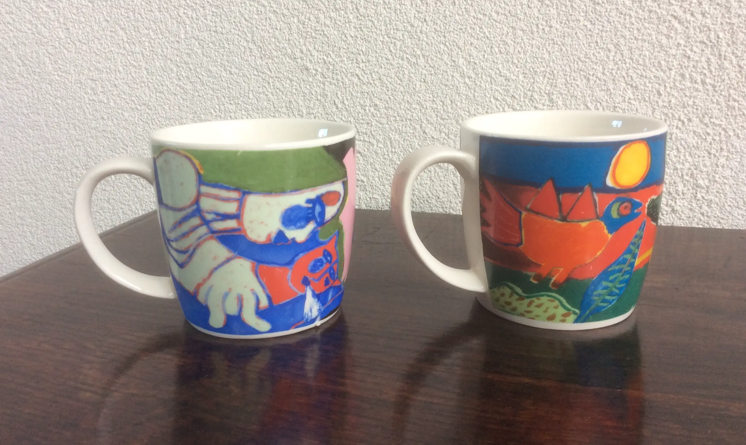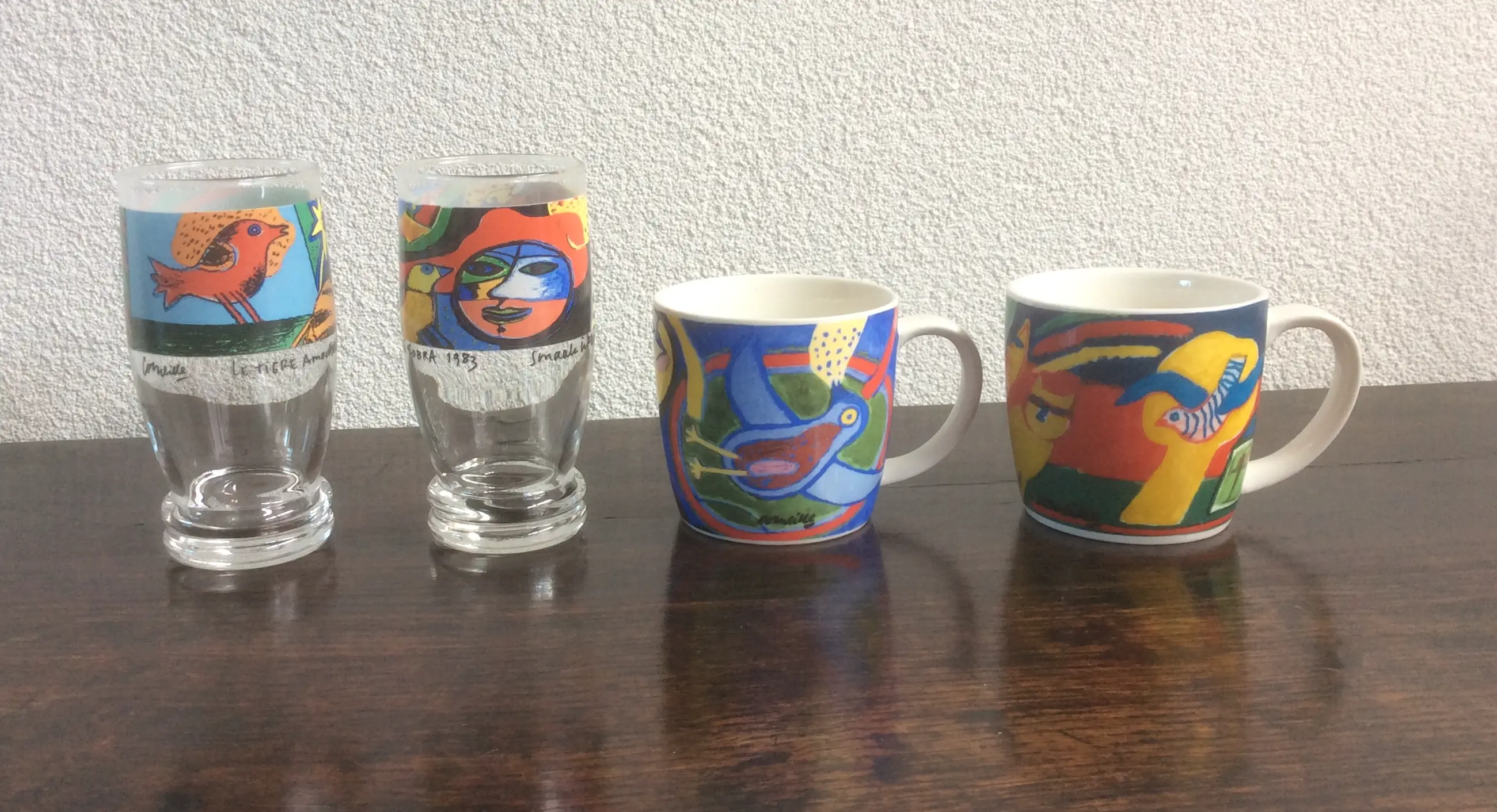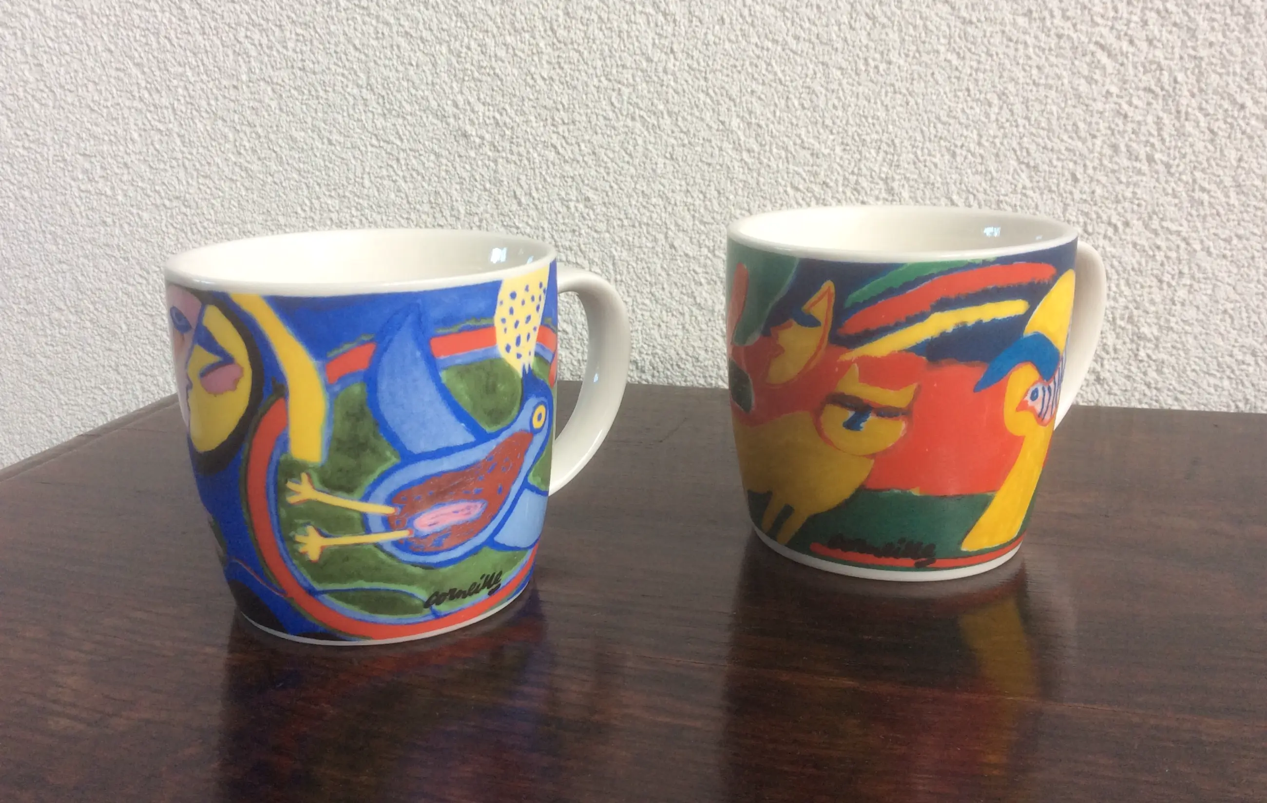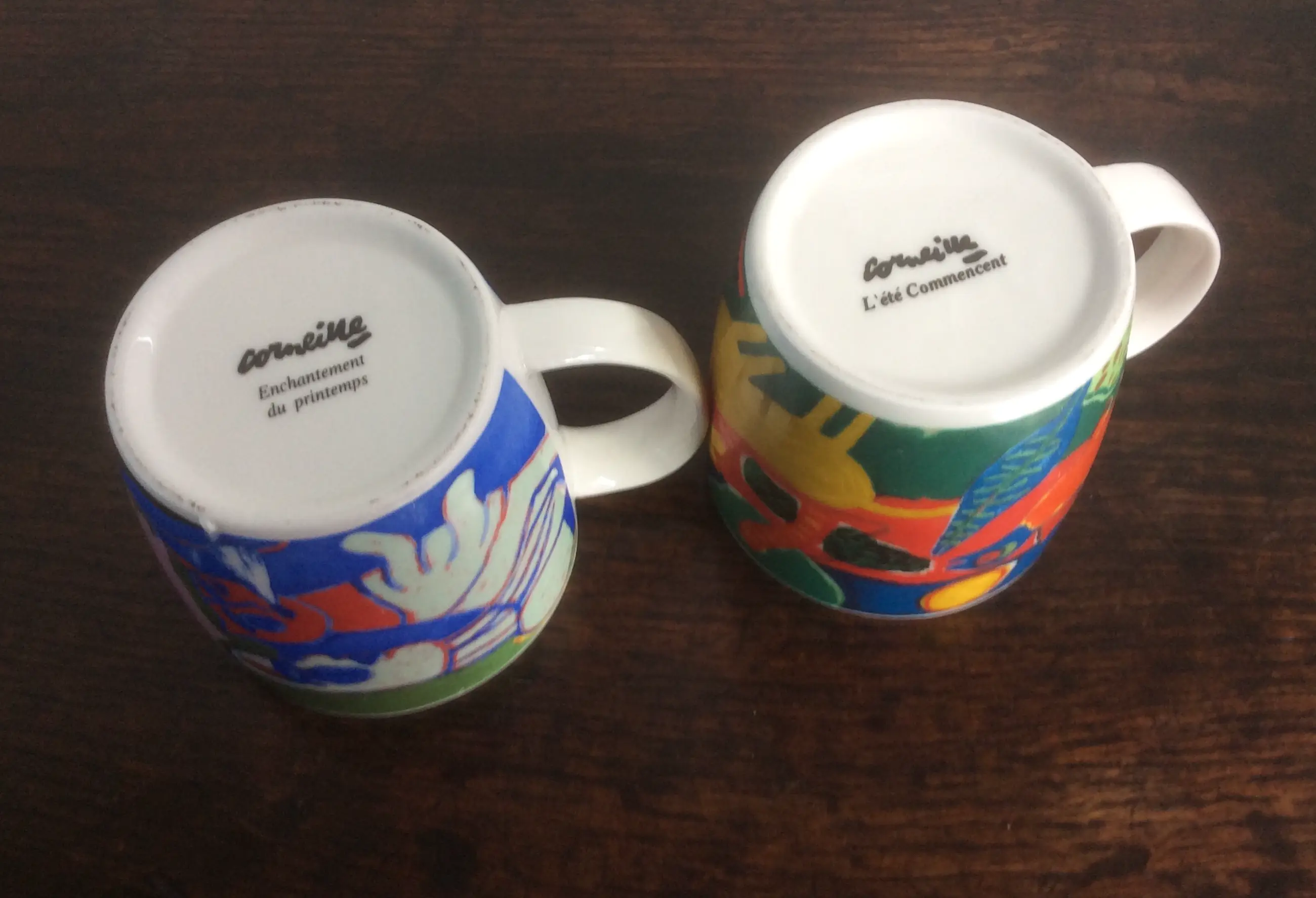 Twee grote bekers met de titel Enchantement du printemps en L’été Commencent. Hoogte ruim 8 cm en gesigneerd.