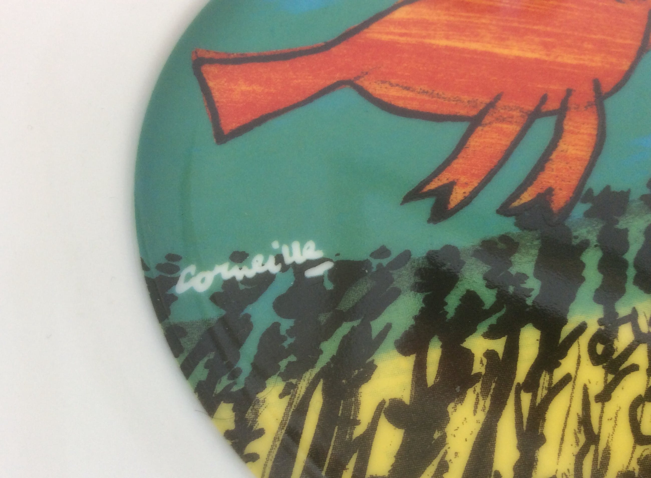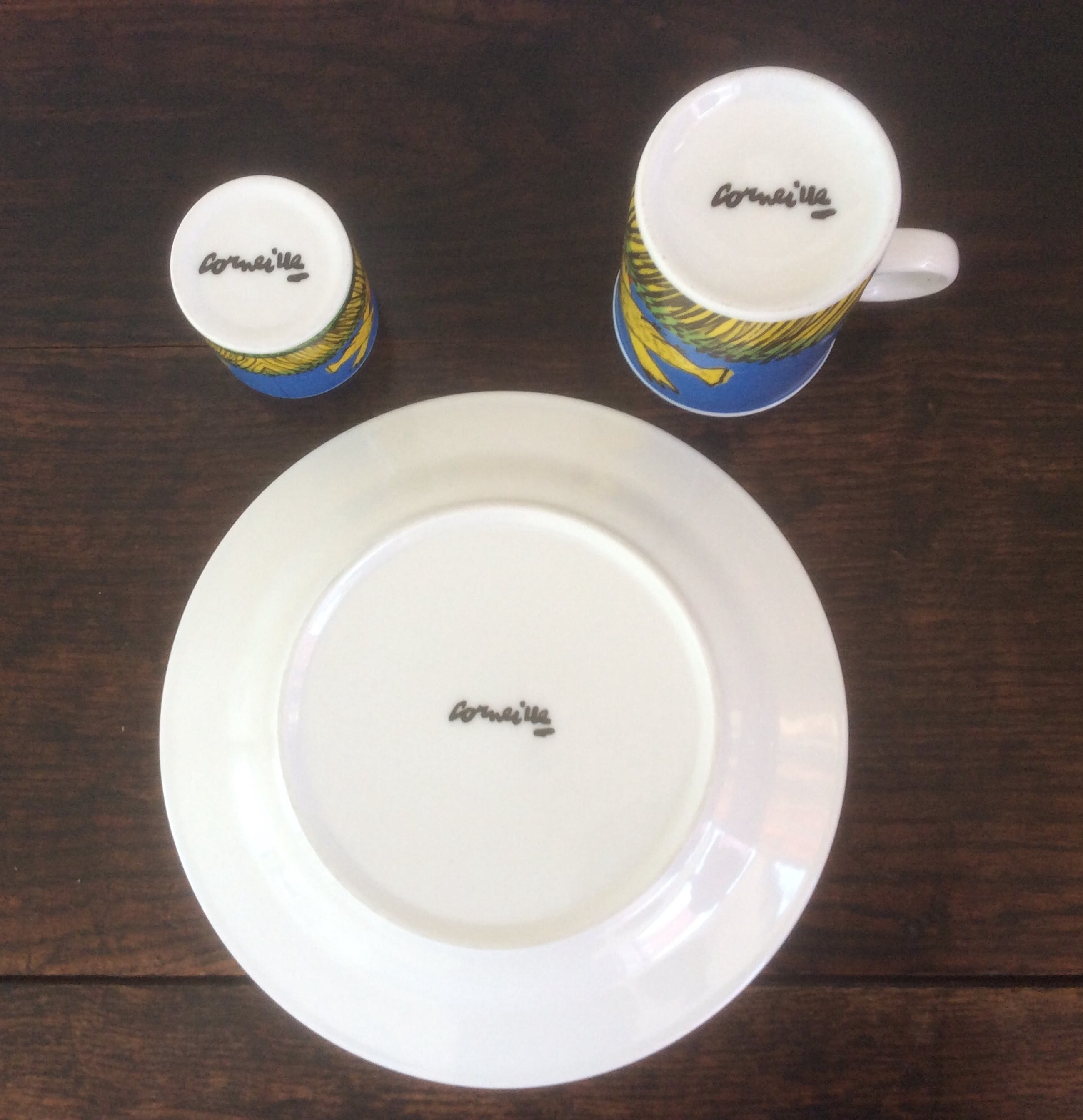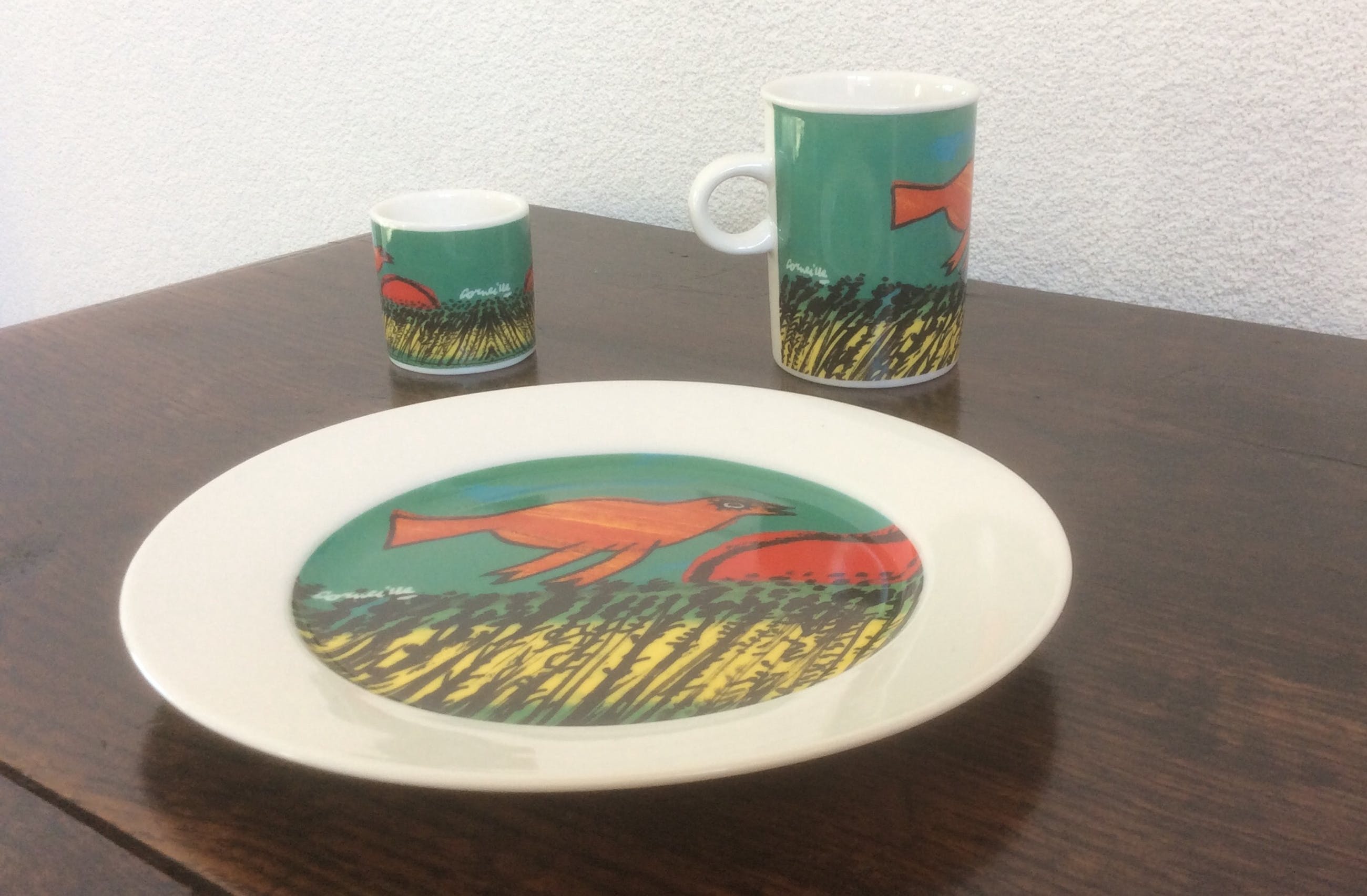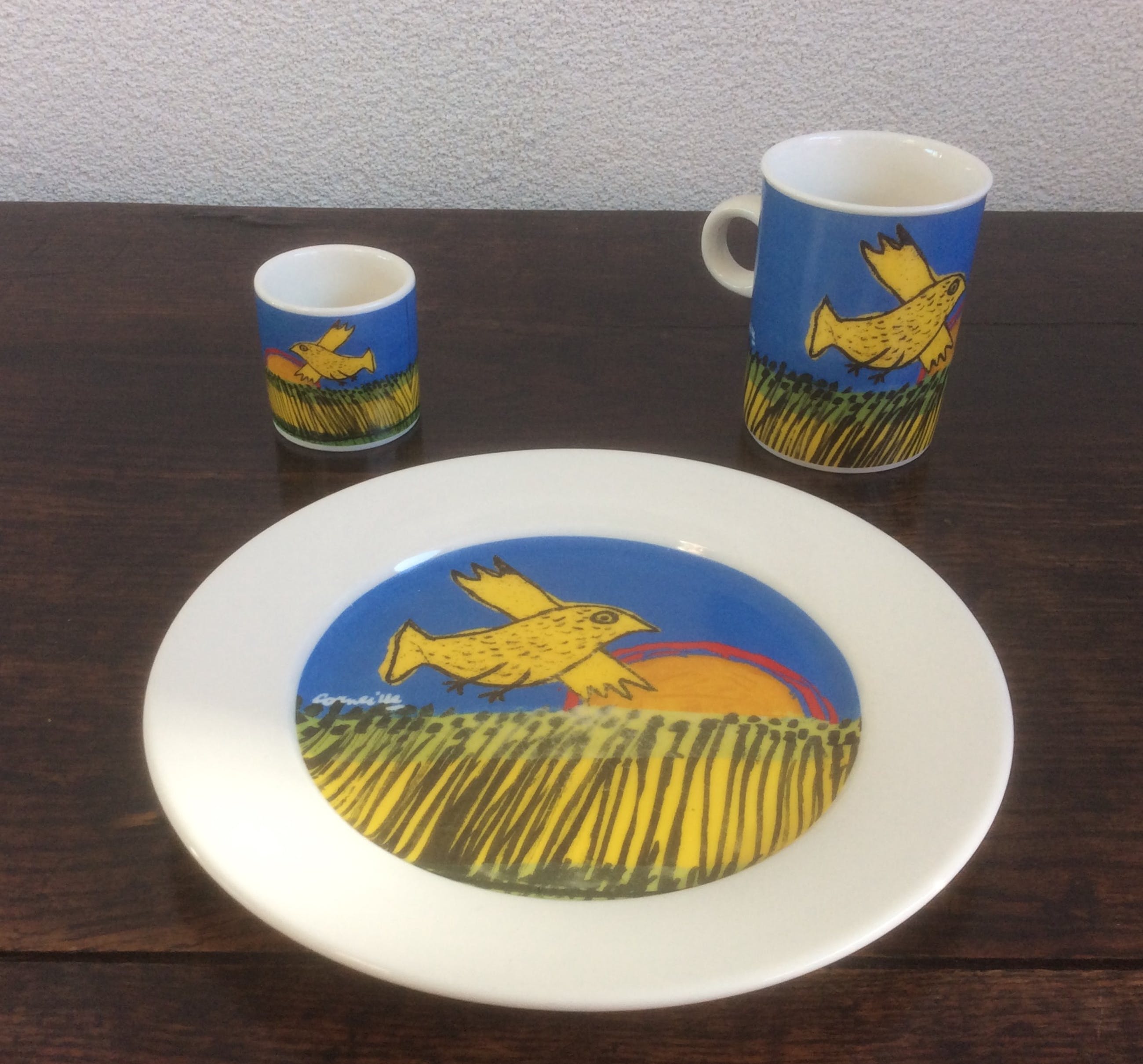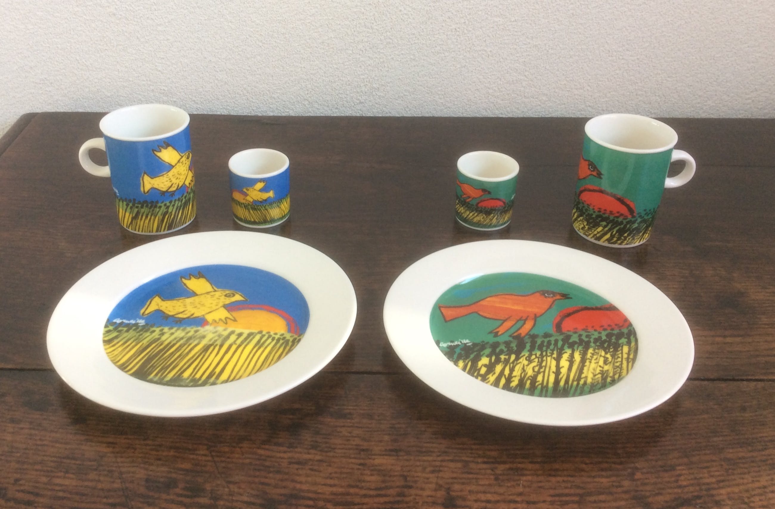 De twee ontbijtsets met een afbeelding van werk van Corneille bestaan uit twee bordjes, twee bekers met oor en twee eierdopjes.