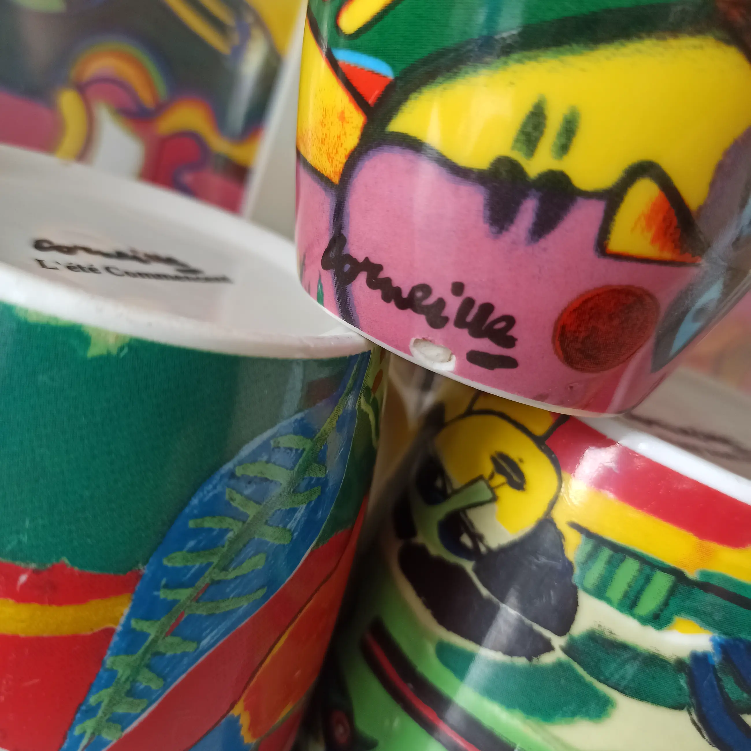 Kavel bestaat uit: - twee prenten van Corneille, in lijst en nog in seal! Totale maat 21x21 cm - twee mokken - een (1) koffiekopje, waarvan aan de onderkant een chipje zit, bekijk alle fotos voor u eigen indruk.